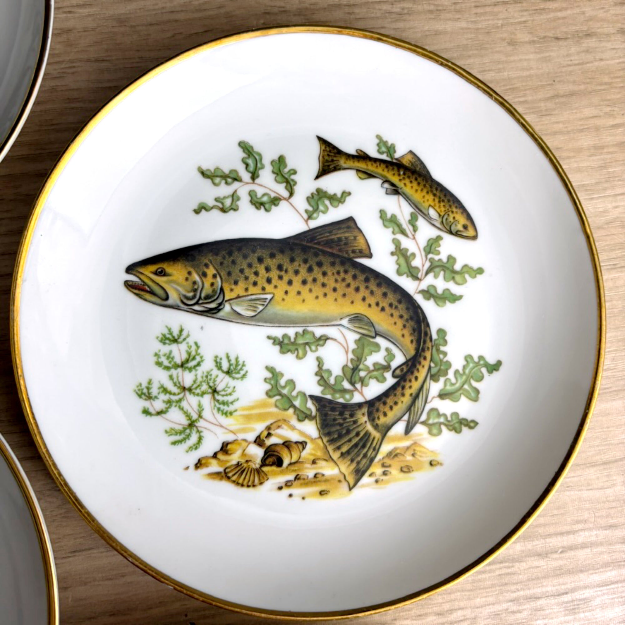Set of 6 vintage Naaman Israel porcelain fish plates. Each features a different fish design in earthy shades of green and brown. White background with gold painted rim. Use them for display, coastal or nautical decor, or use on your table as dessert, salad, or bread plates.