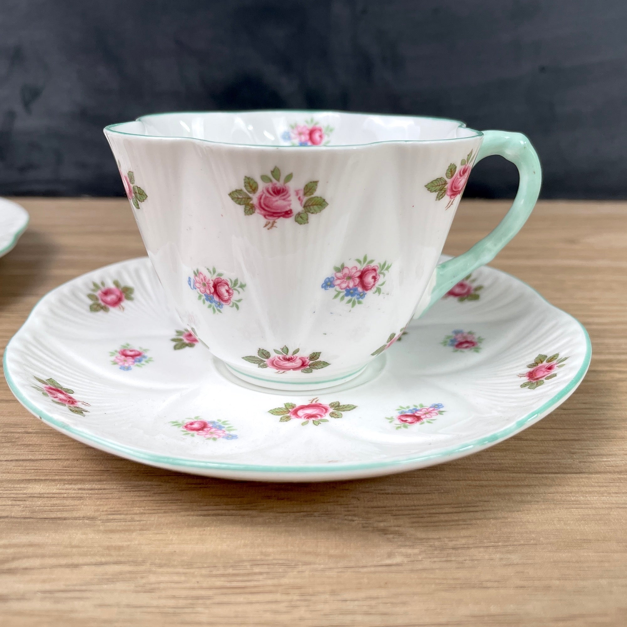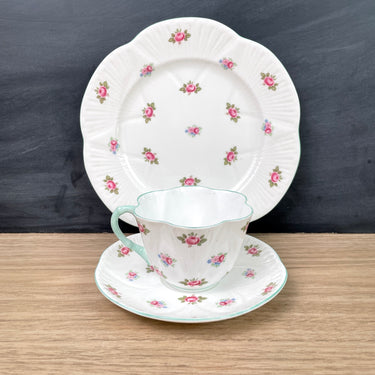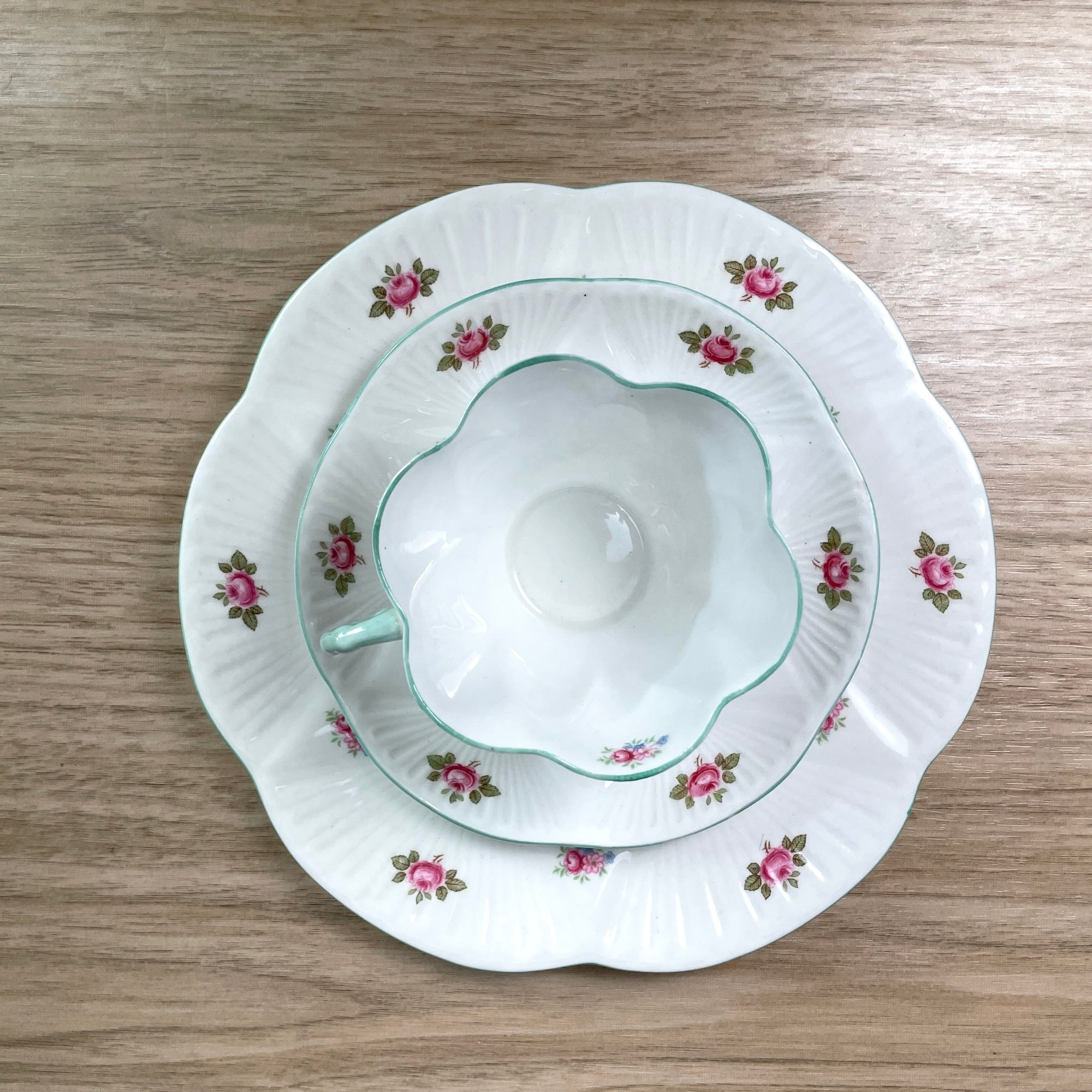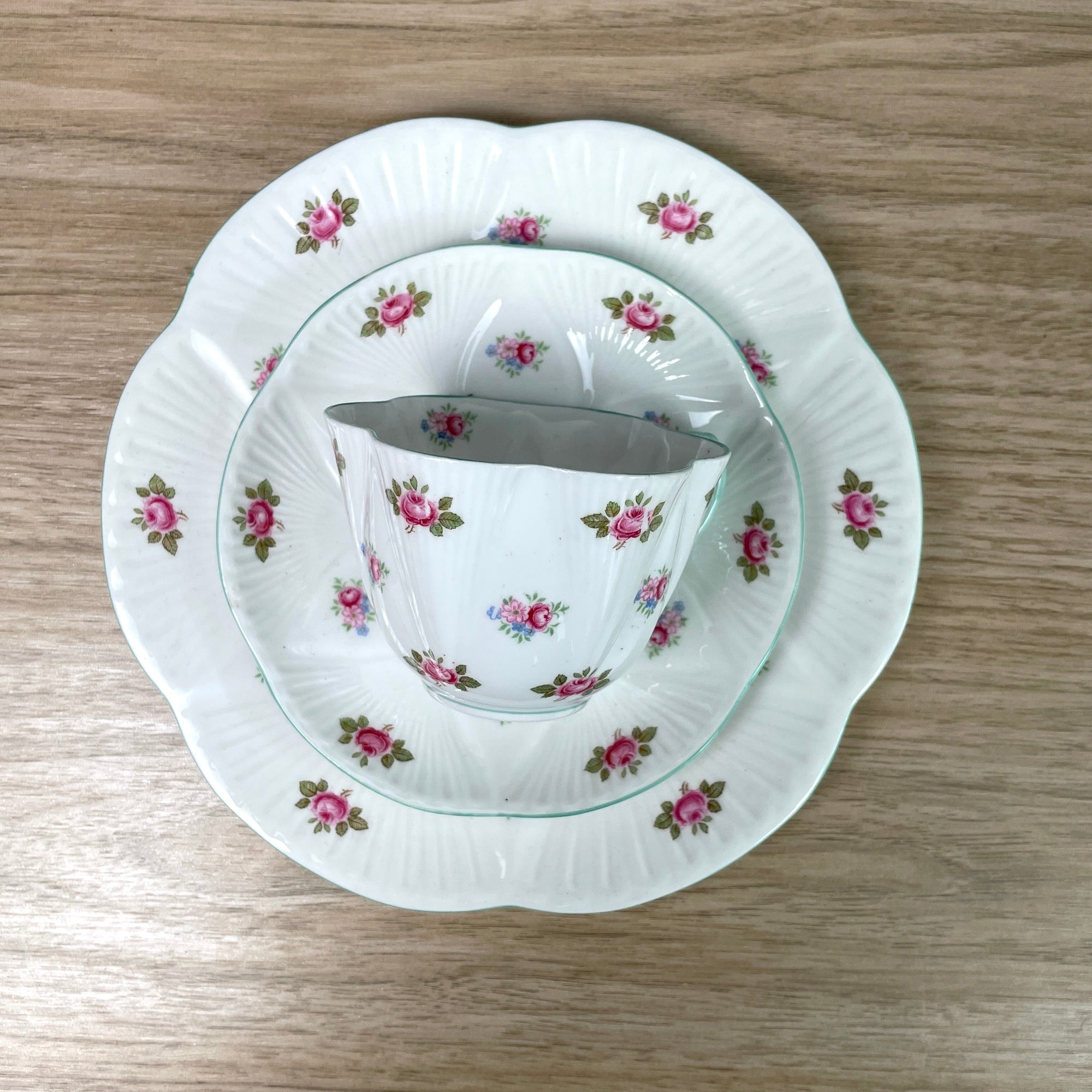 Shelley Dainty Rosebud three-piece luncheon set. White china with tiny pink, green and blue flower springs with minty green trim. Lovely vintage set of fine English china.