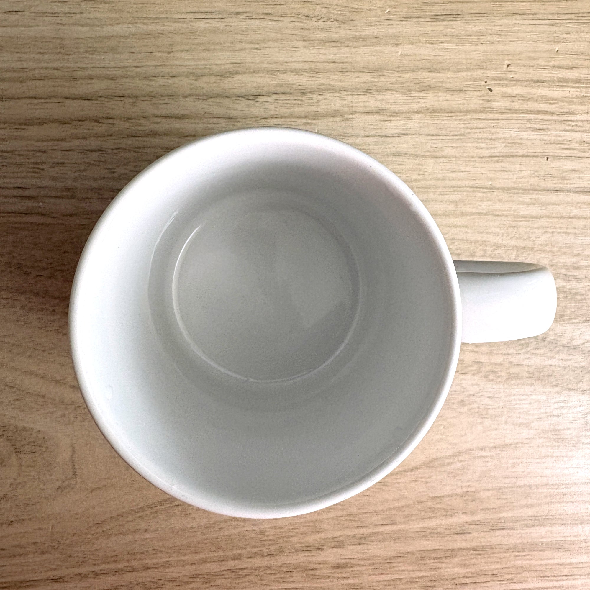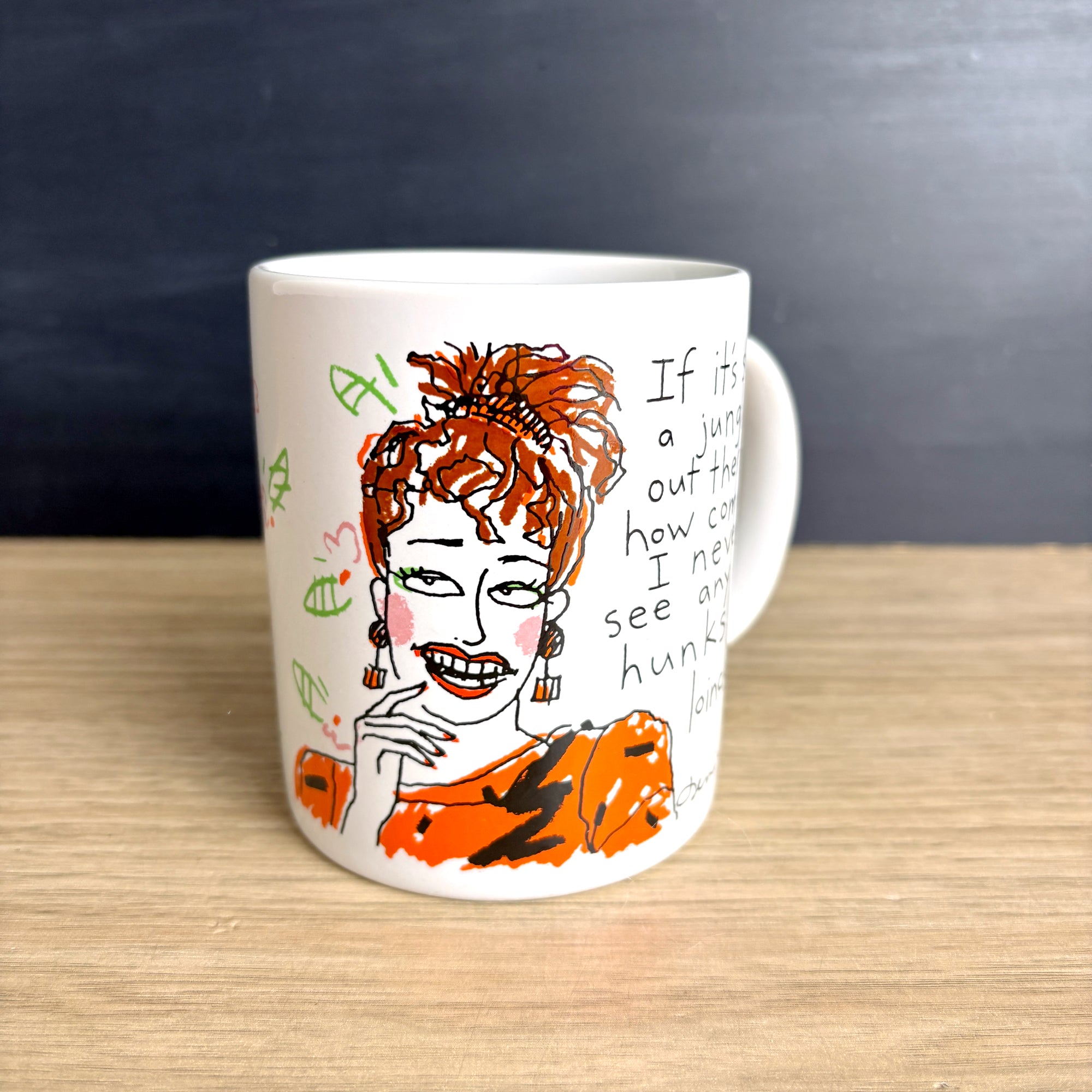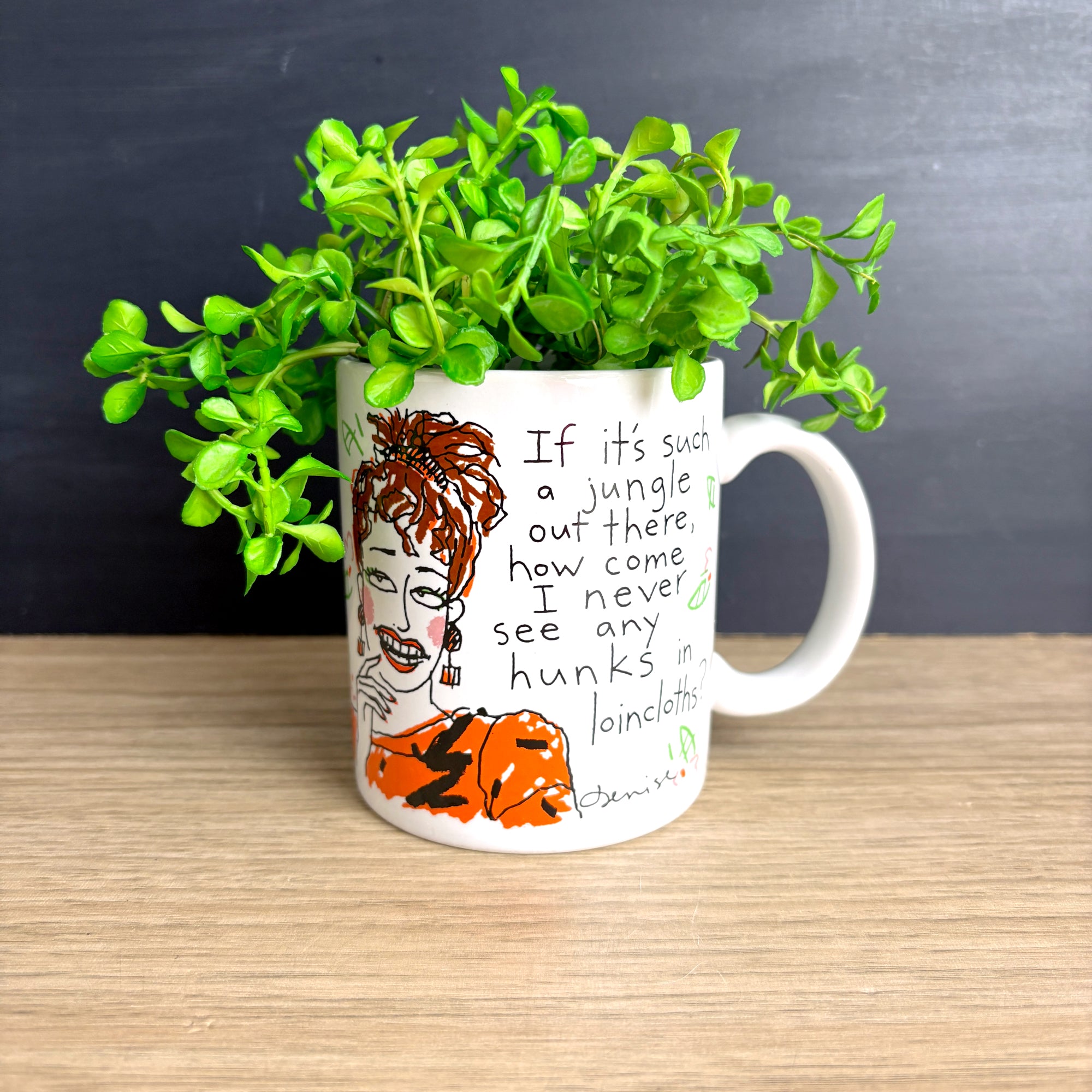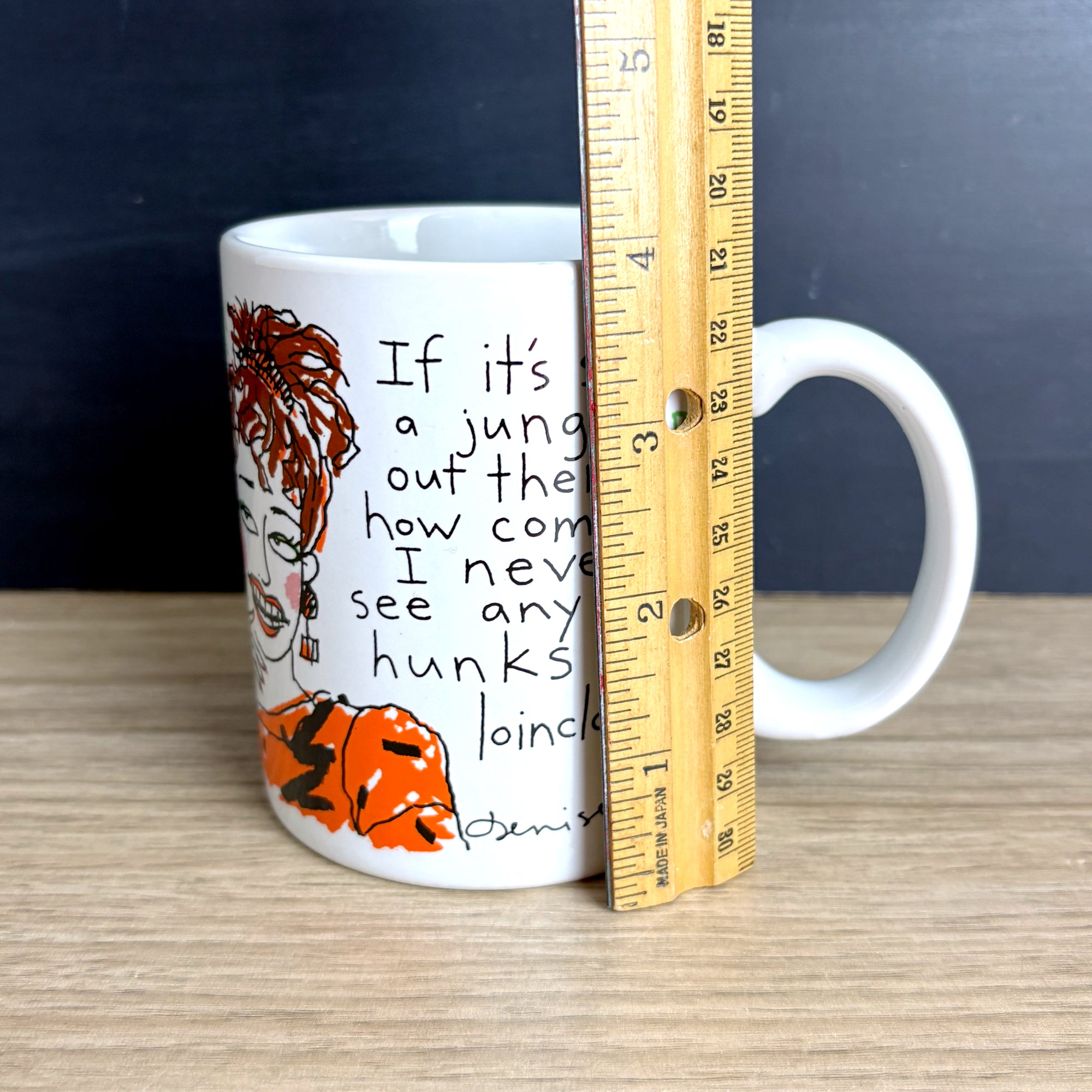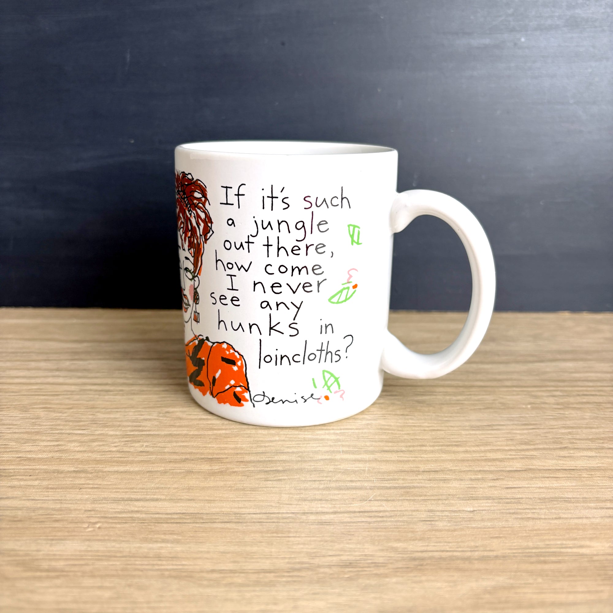 Vintage 1989 Shoebox Greeting mug featuring the worldly wise Denise character - "If It's such a jungle out there, how come I never see any hunks in loincloths?" White ceramic, comfortably holds 10 oz. Made in Thailand for Hallmark Cards, Inc.