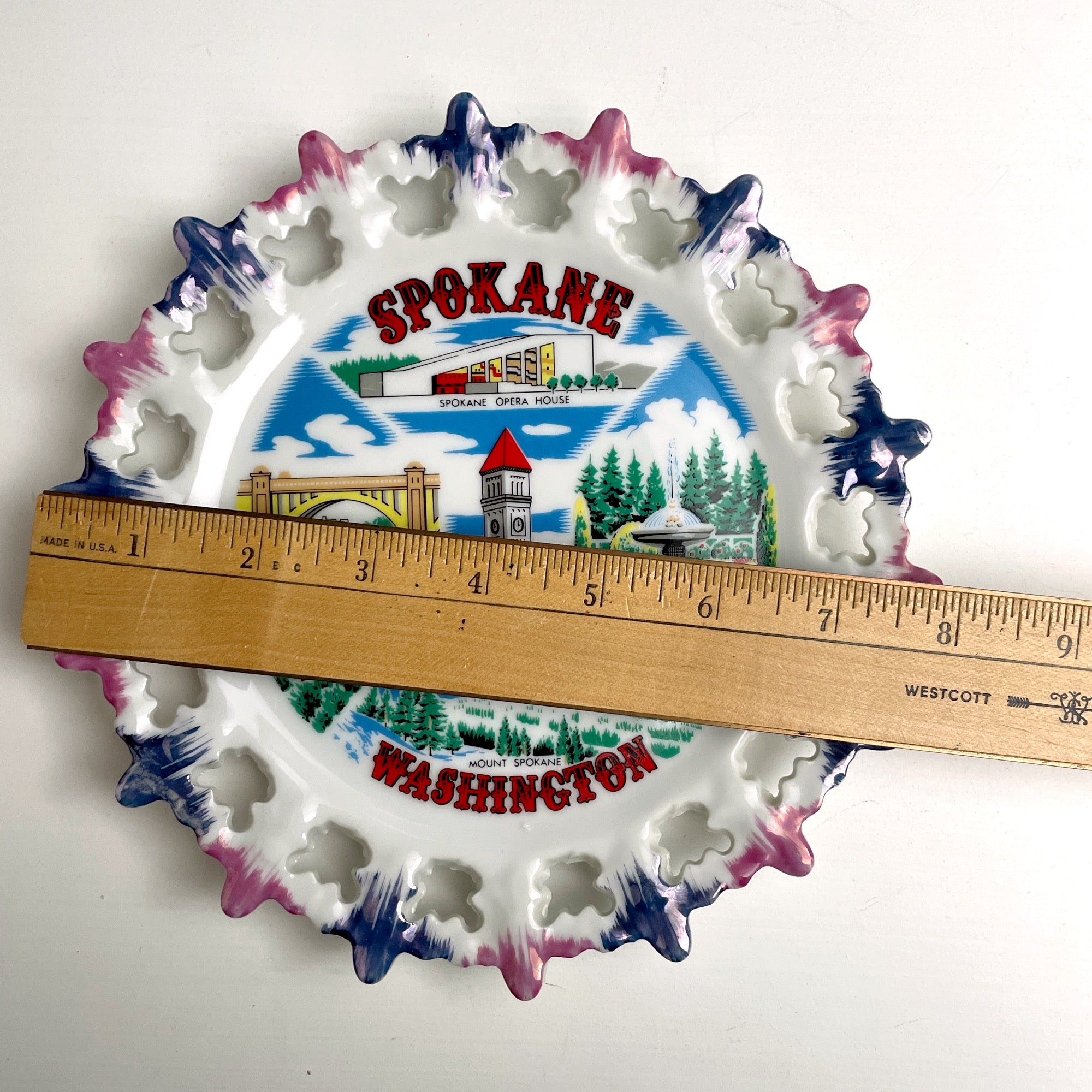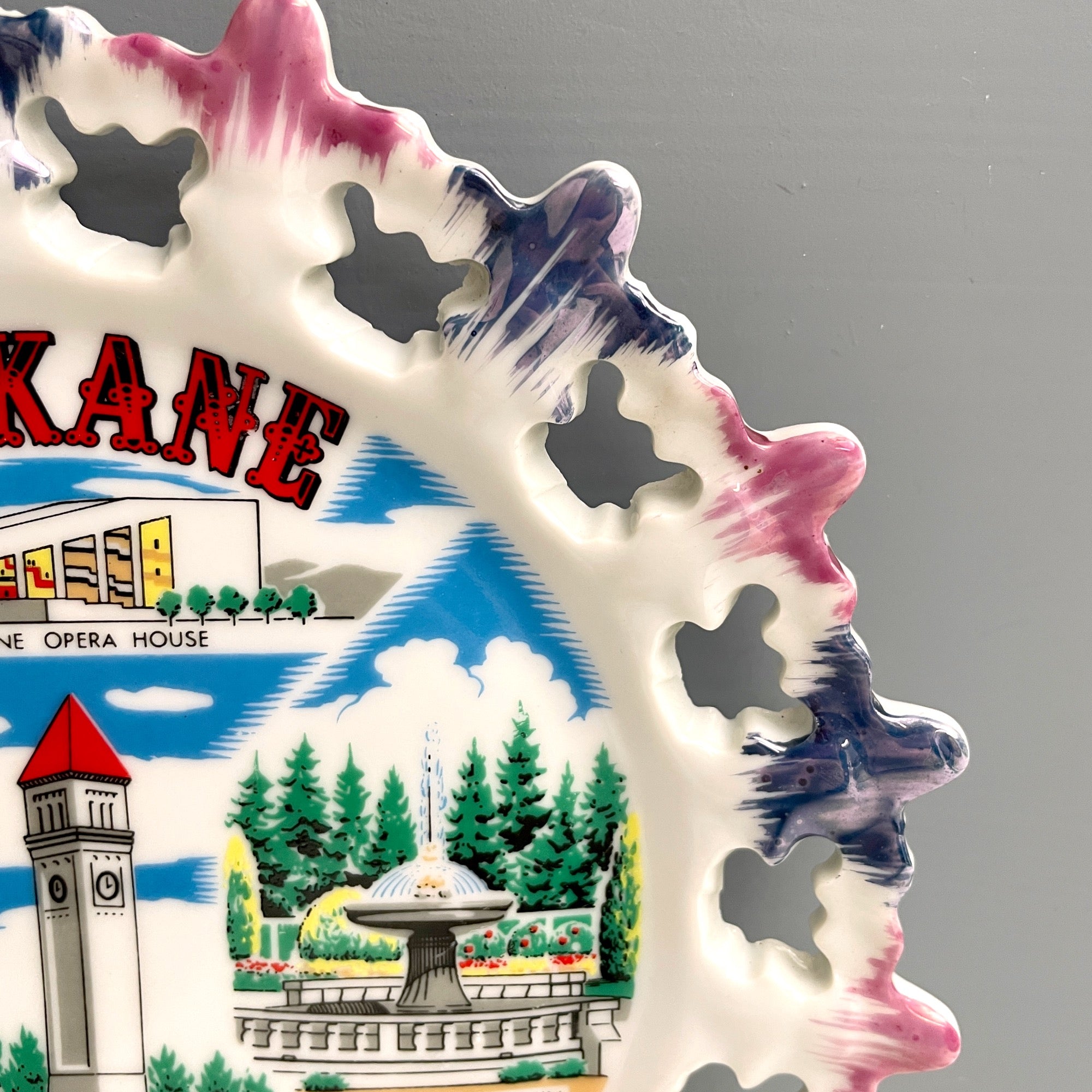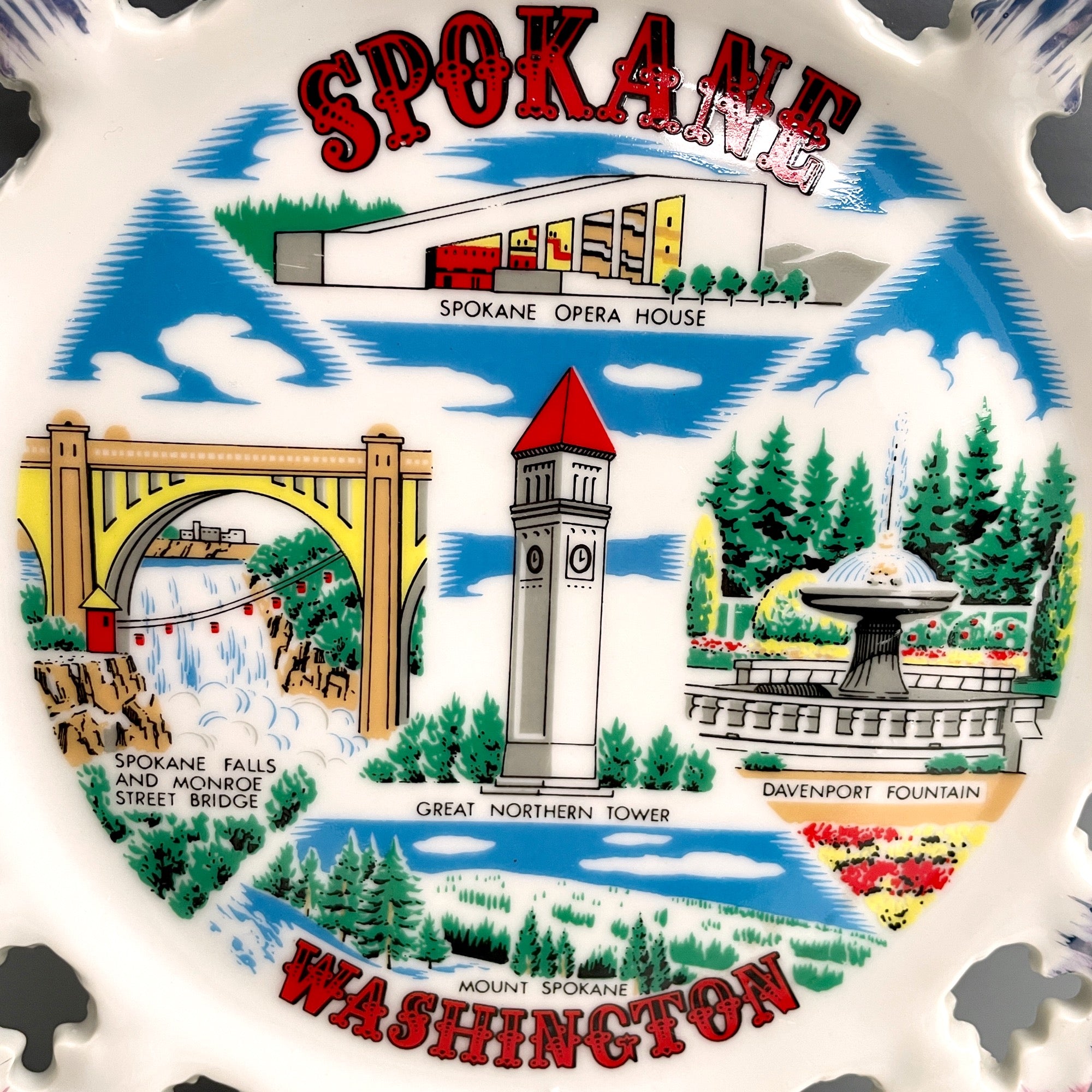 Souvenir plate from Spokane, WA, featuring colorful images of the Spokane Opera House, Davenport Fountain, Great Northern Tower, Spokane Falls and Monroe Street Bridge and Mount Spokane.
