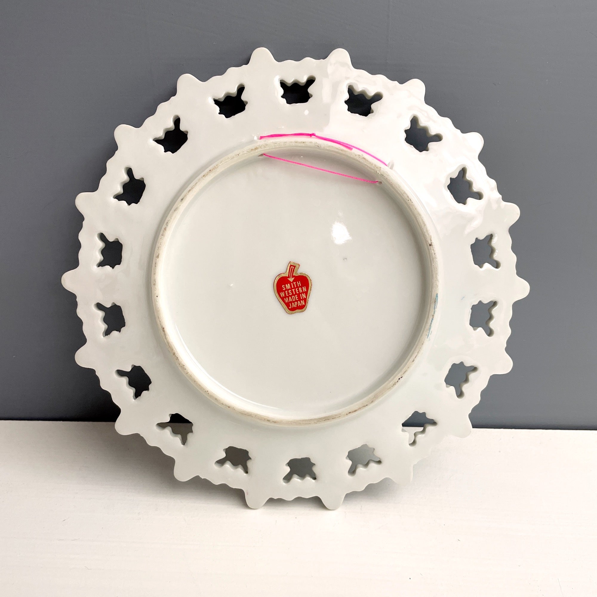 White plate with scalloped edge painted in opalescent blue and purple accents and reticulated border. Holes in back rim for hanging. Made in Japan.