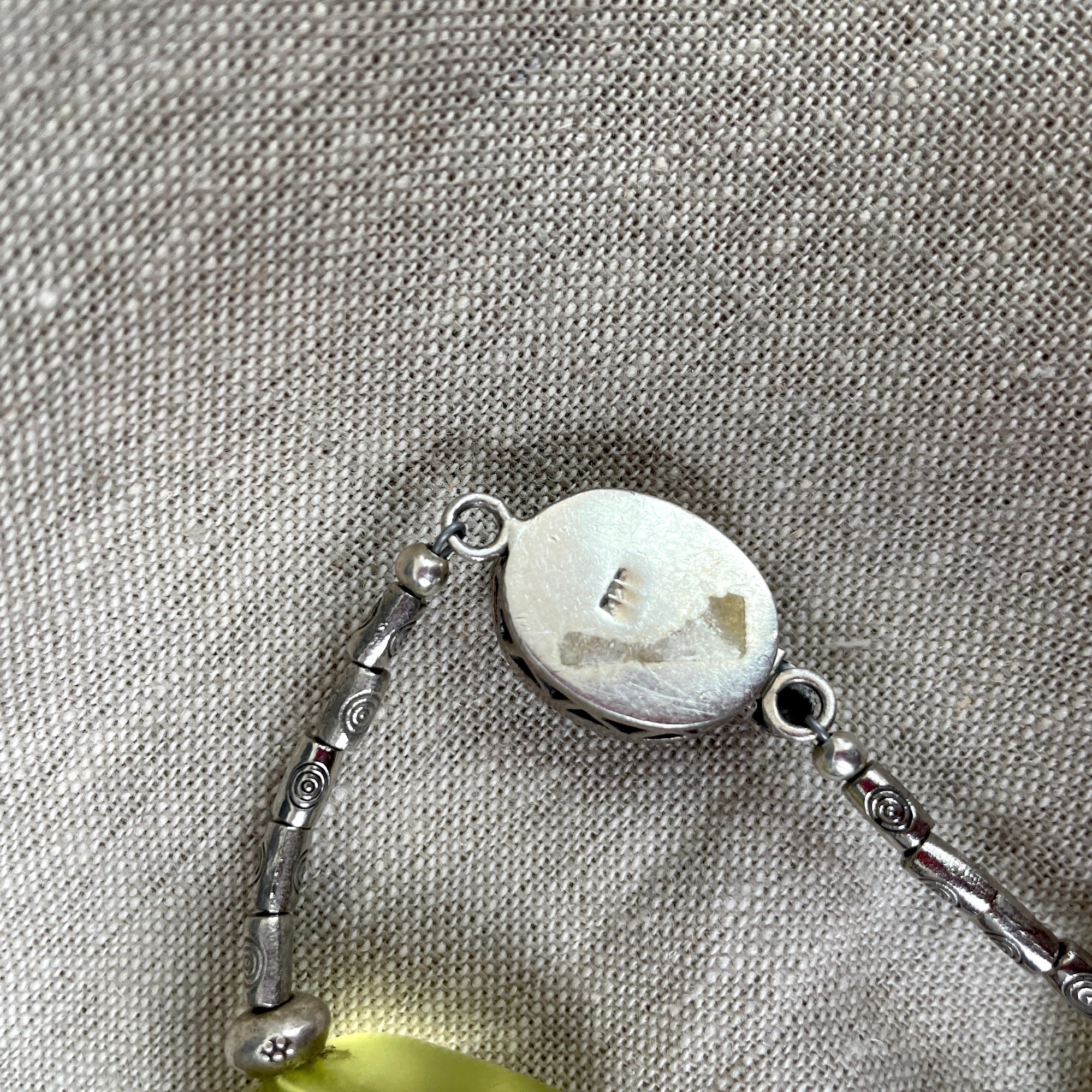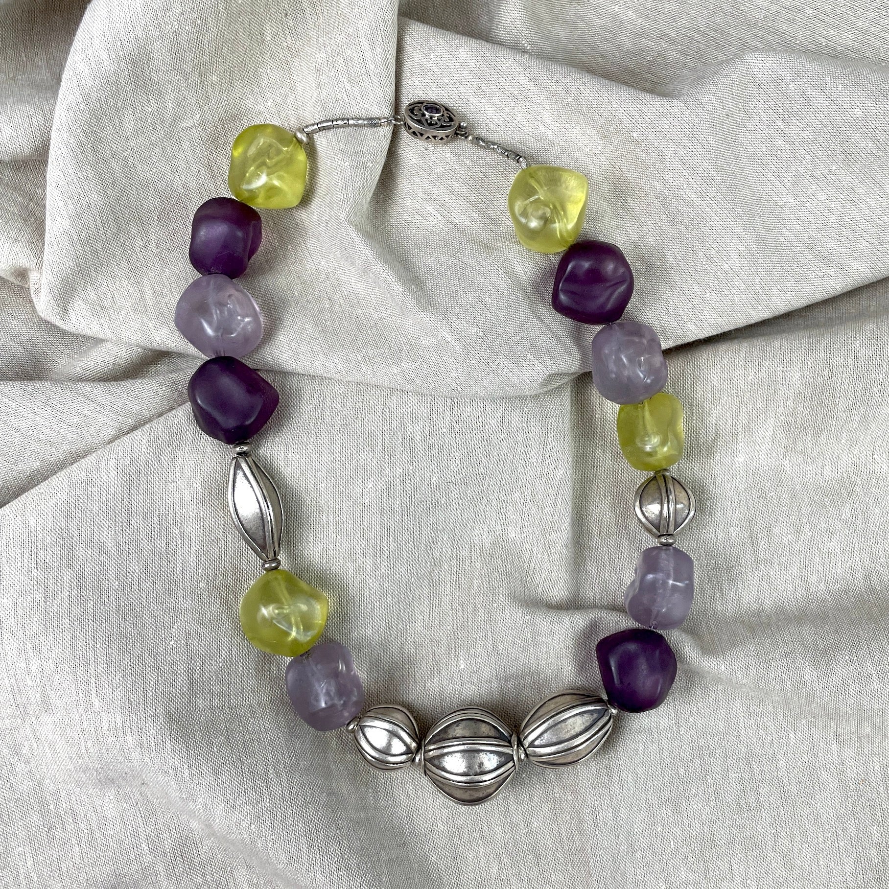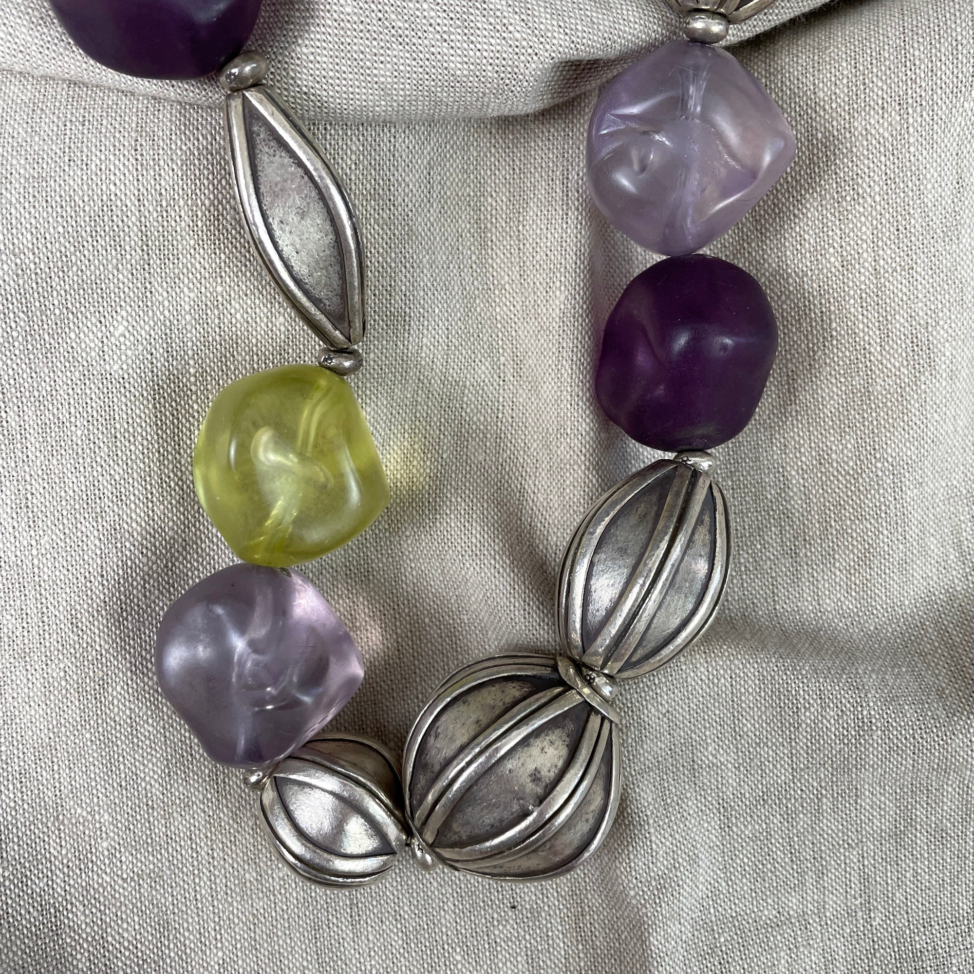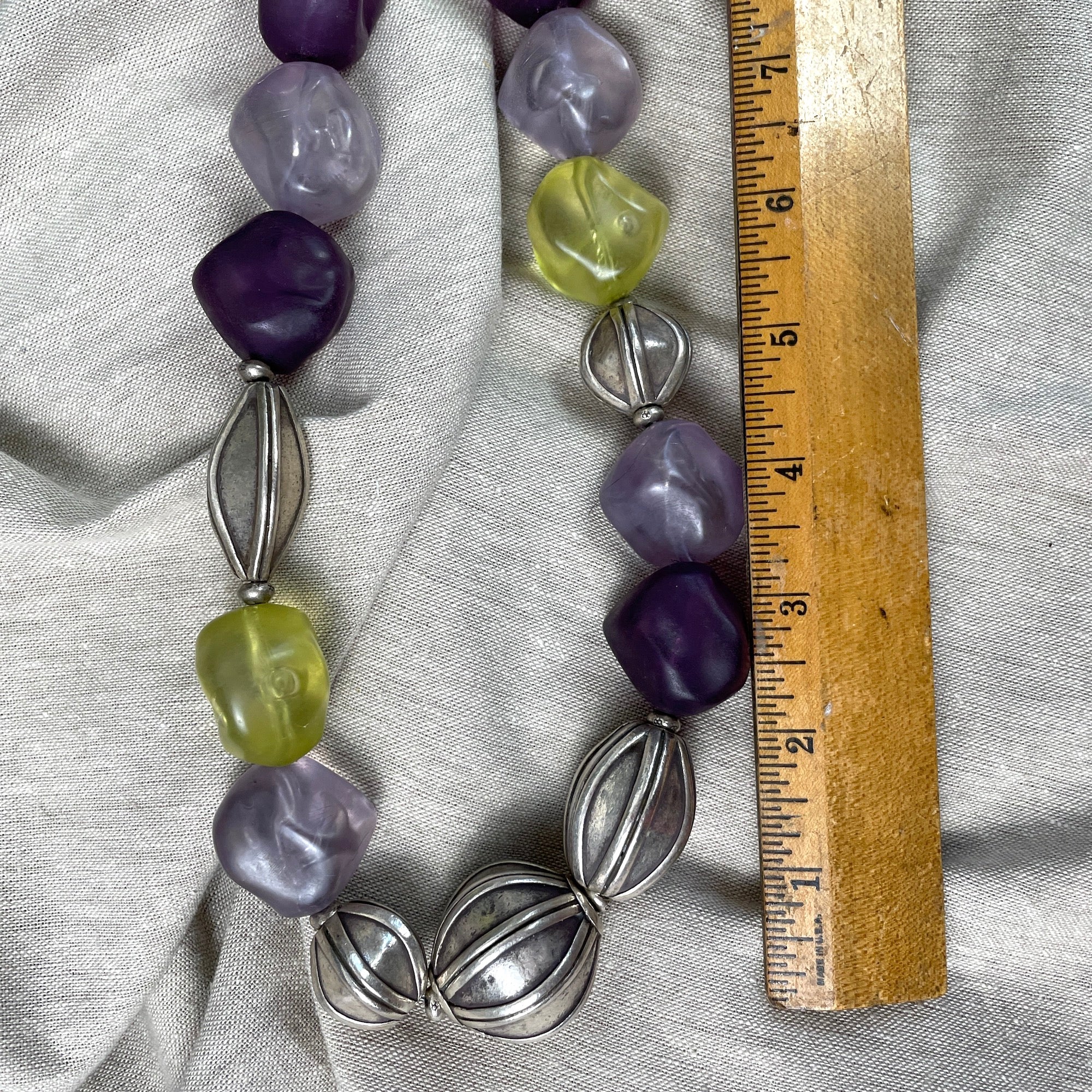 Vintage statement necklace with big (1" dia) amethyst and chartreuse colored resin stonelike beads and big silver beads. Clasp is sterling and has amethyst set into it. Likely from the 1980s. Unsigned.