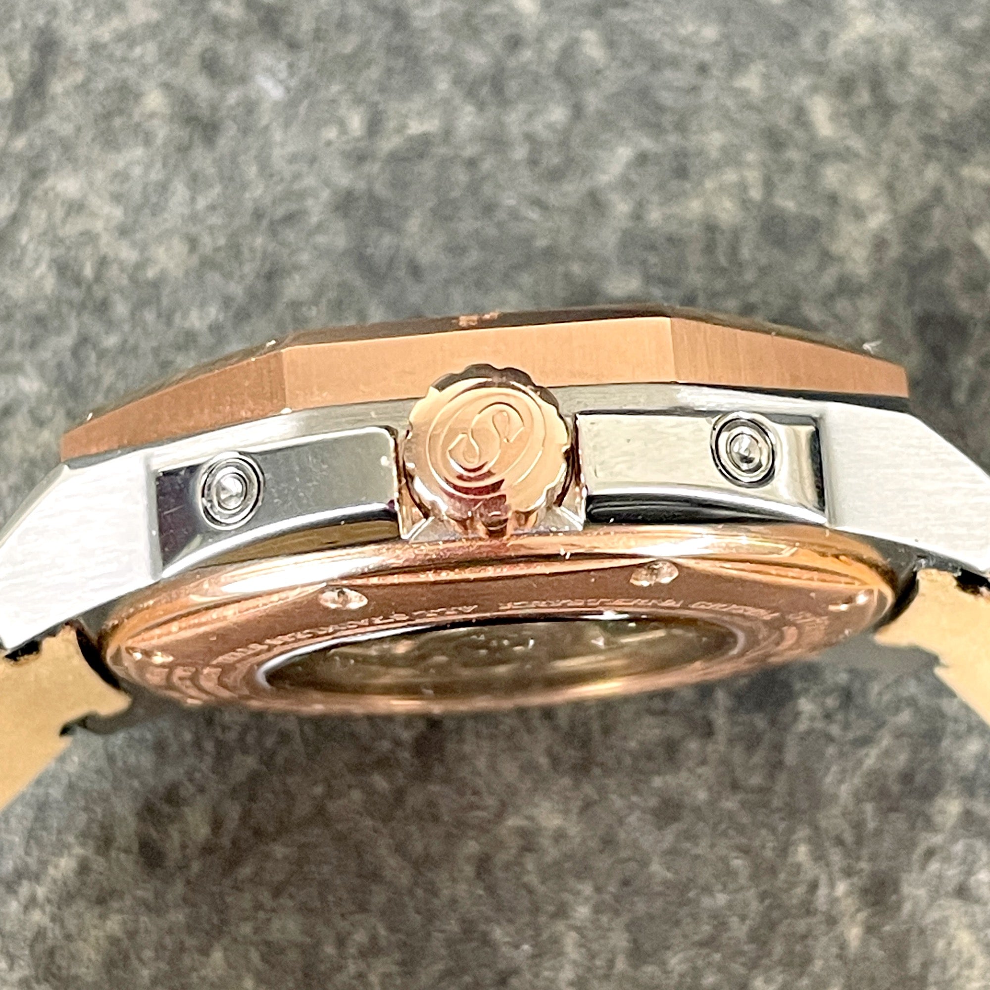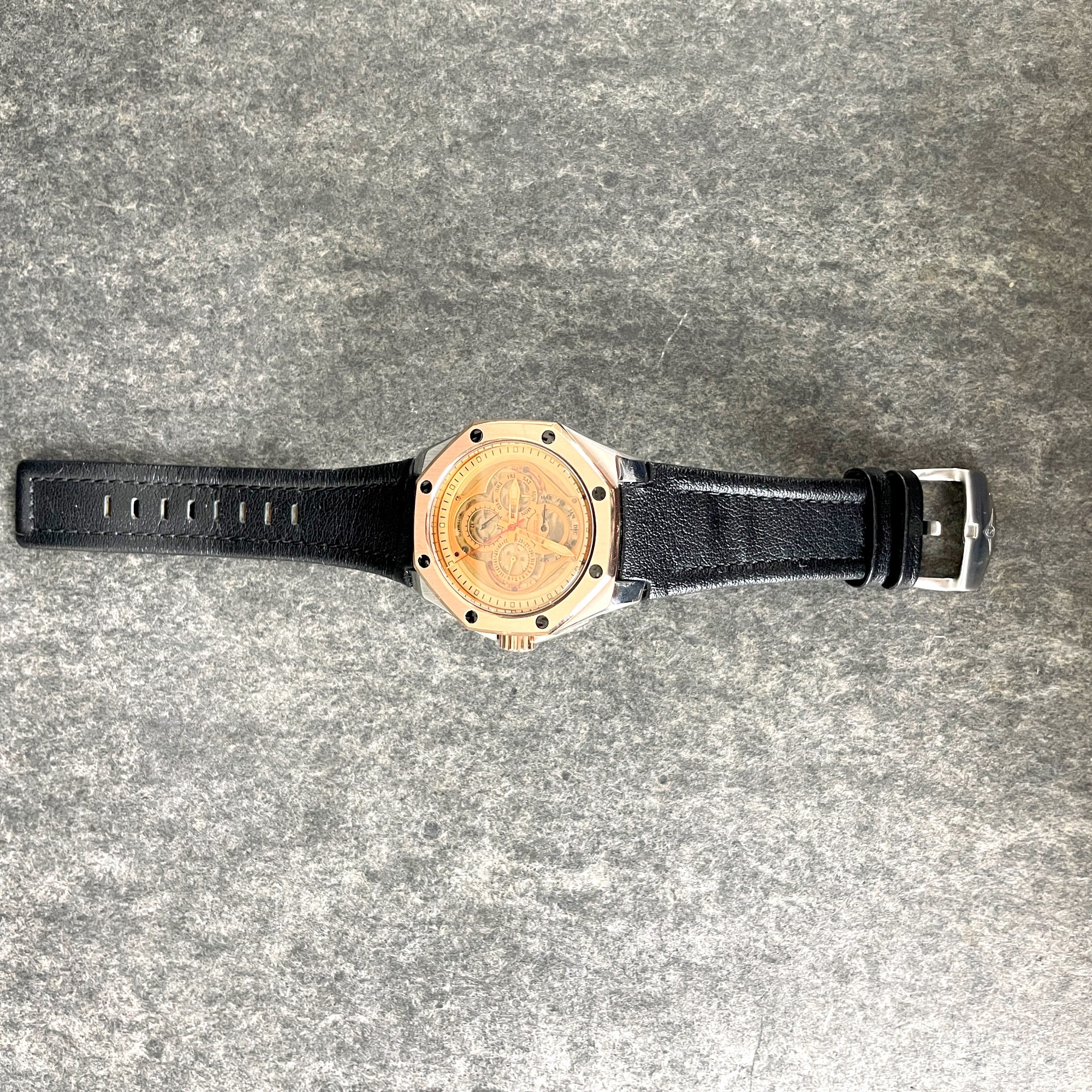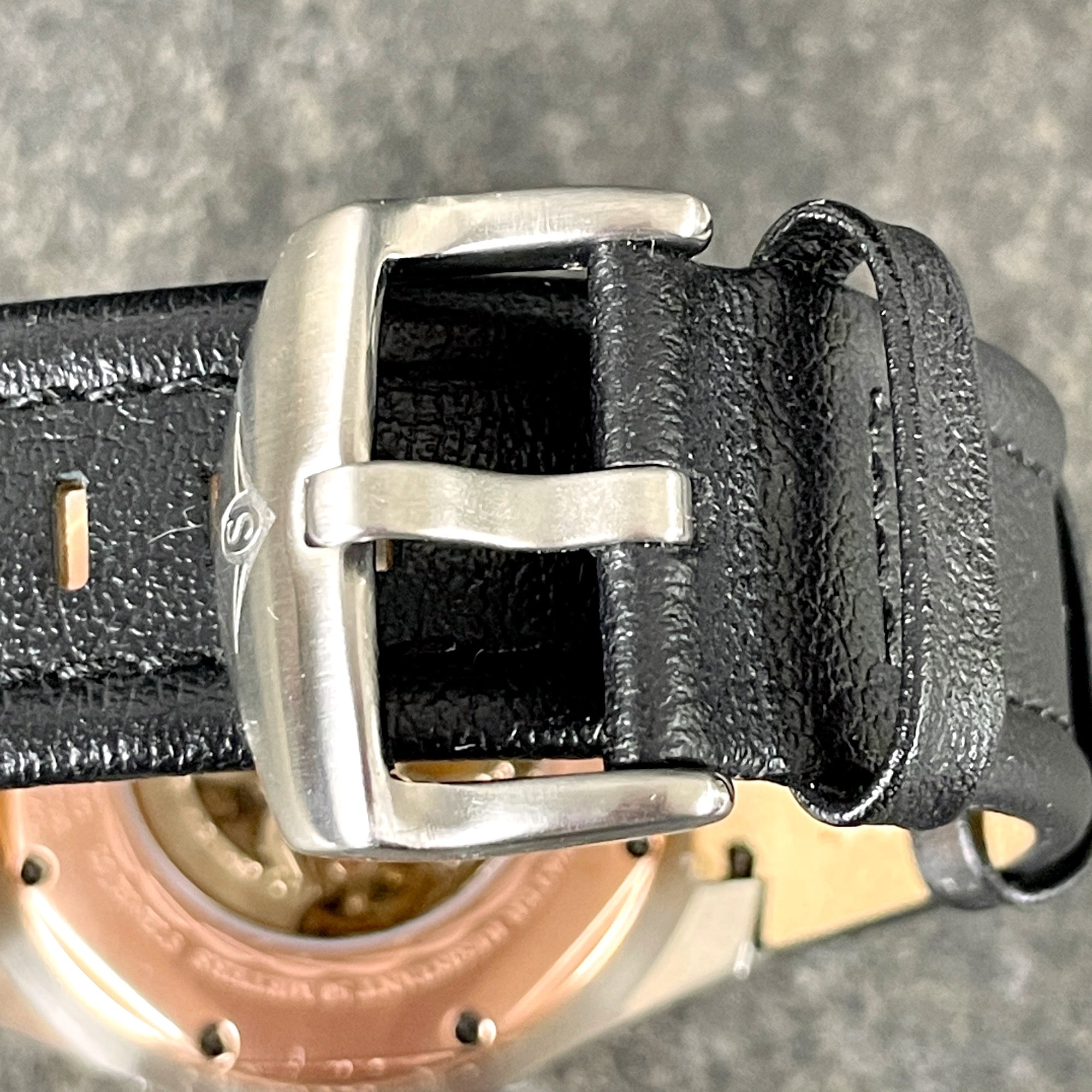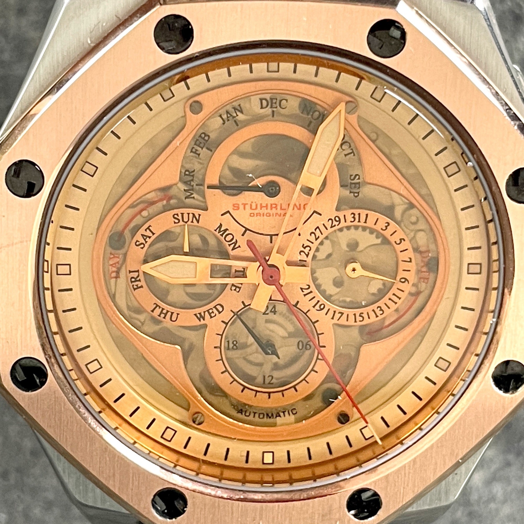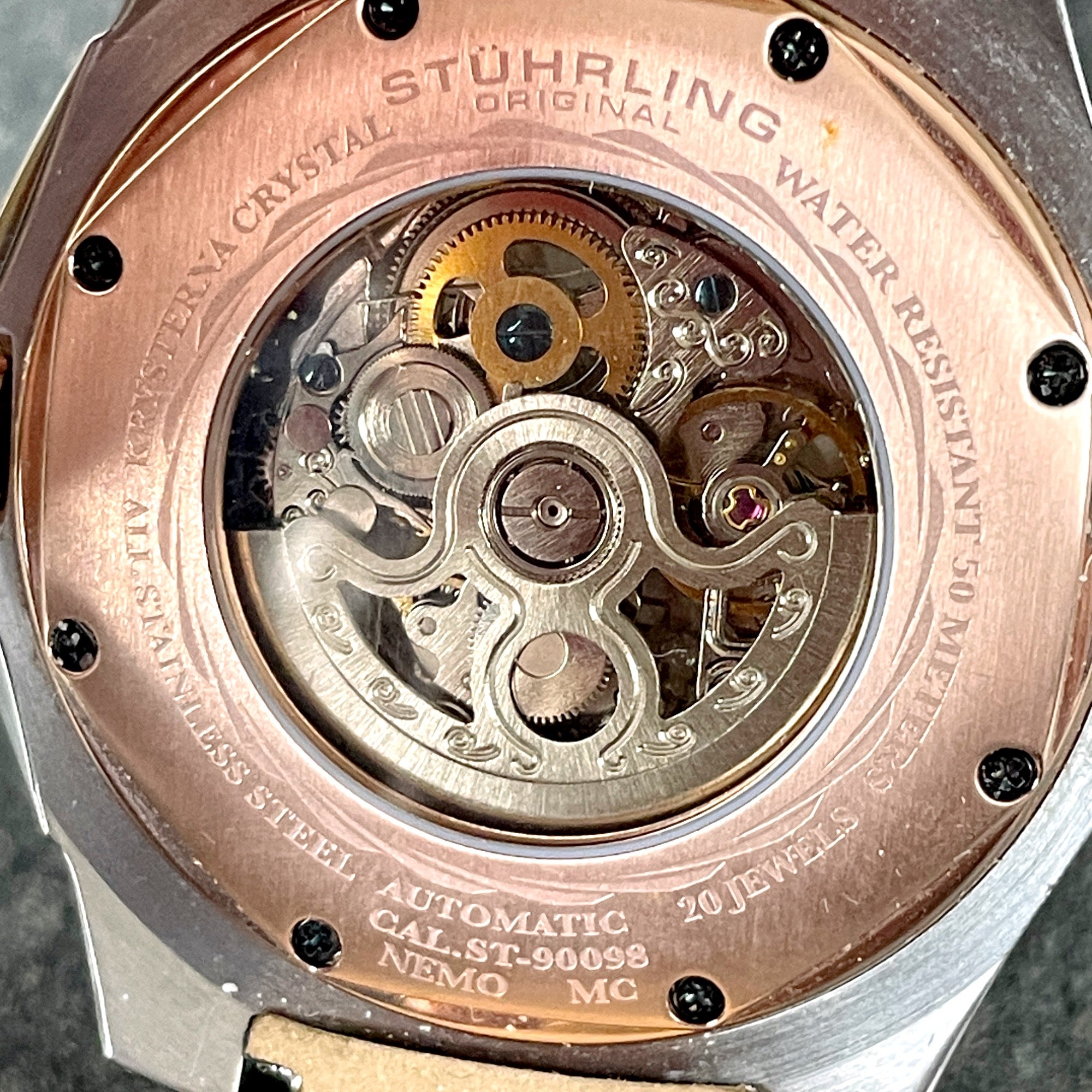 Stührling original 20 jewel automatic watch. Leather band. Skeleton movement. All stainless steel. Silver case, rose gold bezel and dial. Working. No papers or box.