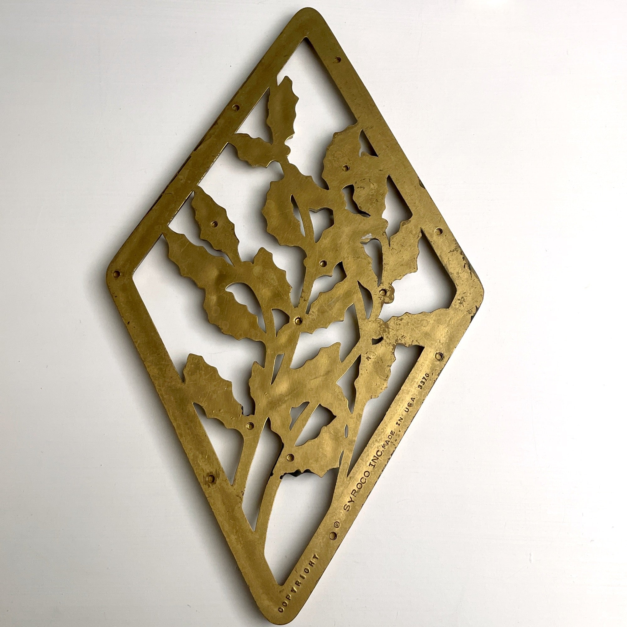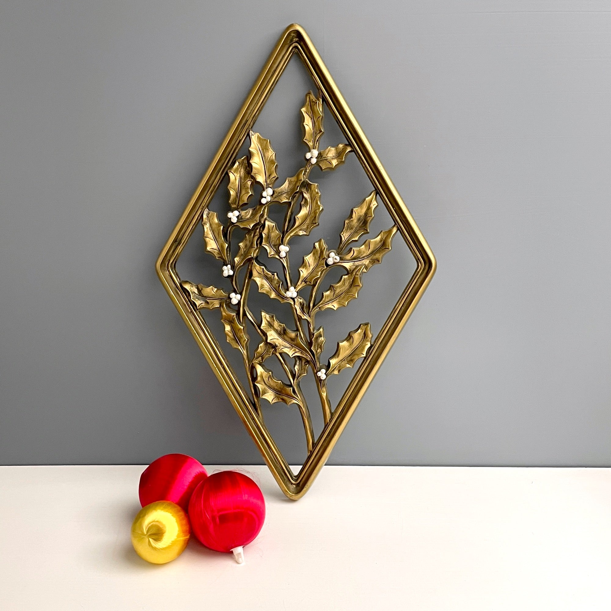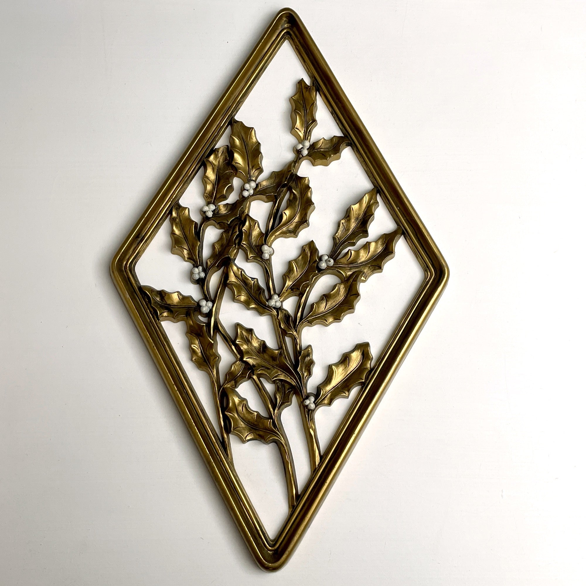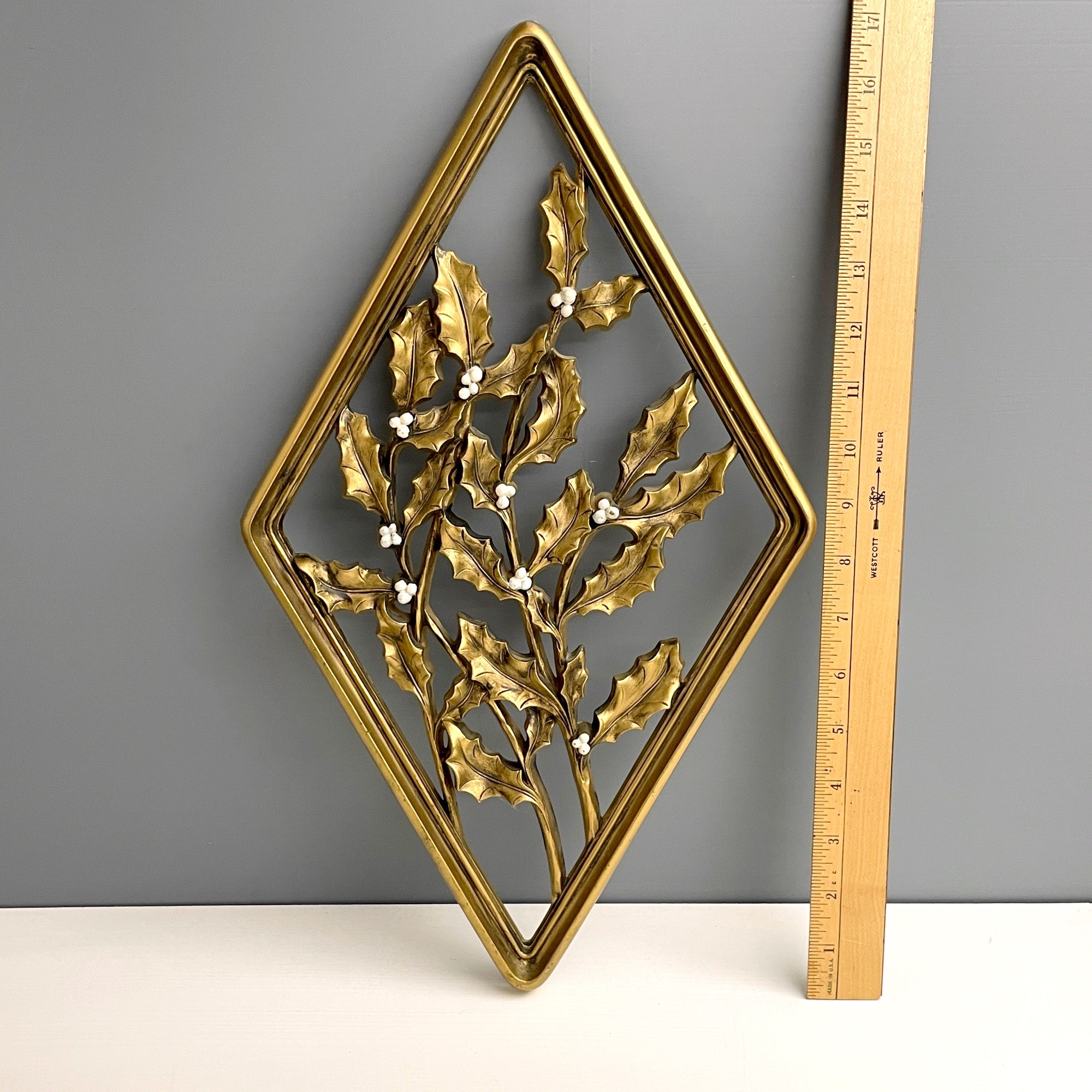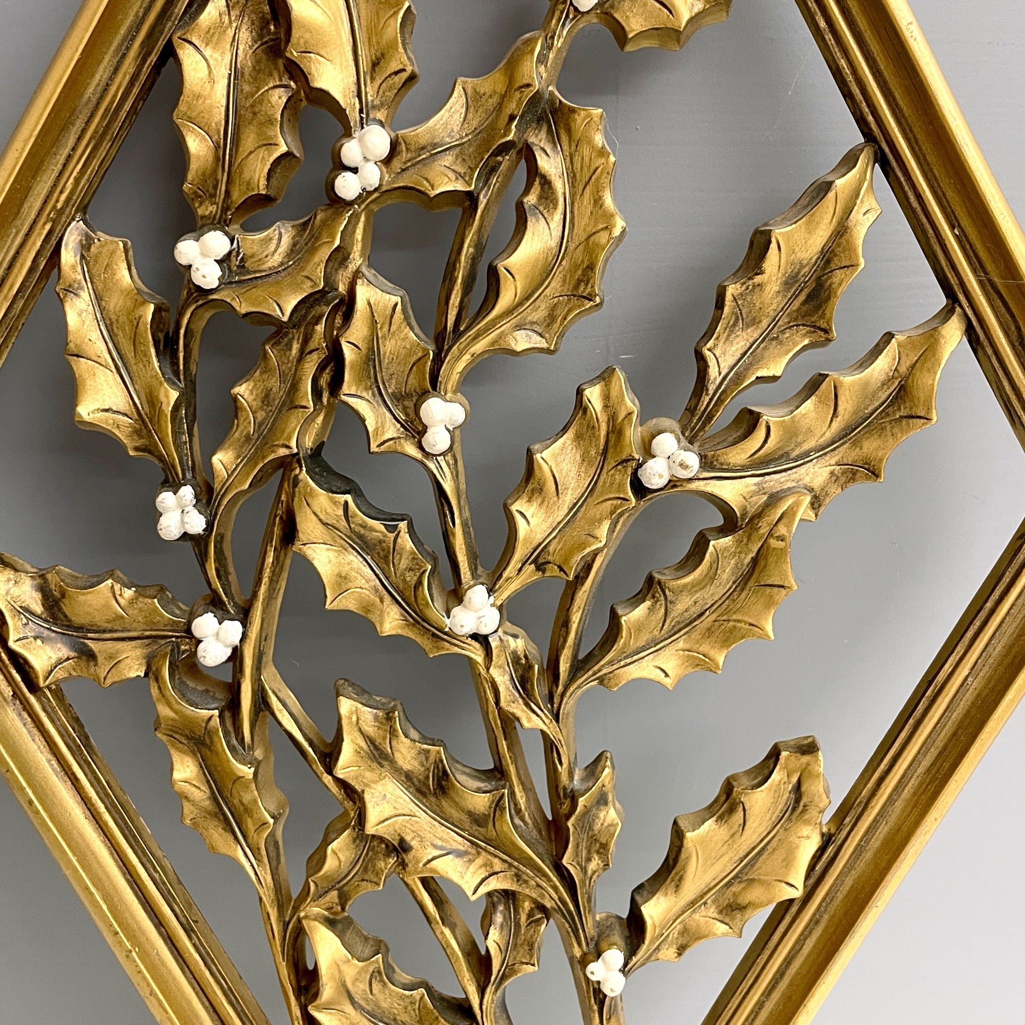 Vintage 1960s Syroco diamond wall art of holly branches with white berries. Gold molded plastic design no. 3370. Made in USA. Originally part of a four seasons set, this single piece is perfect vintage Christmas decor.