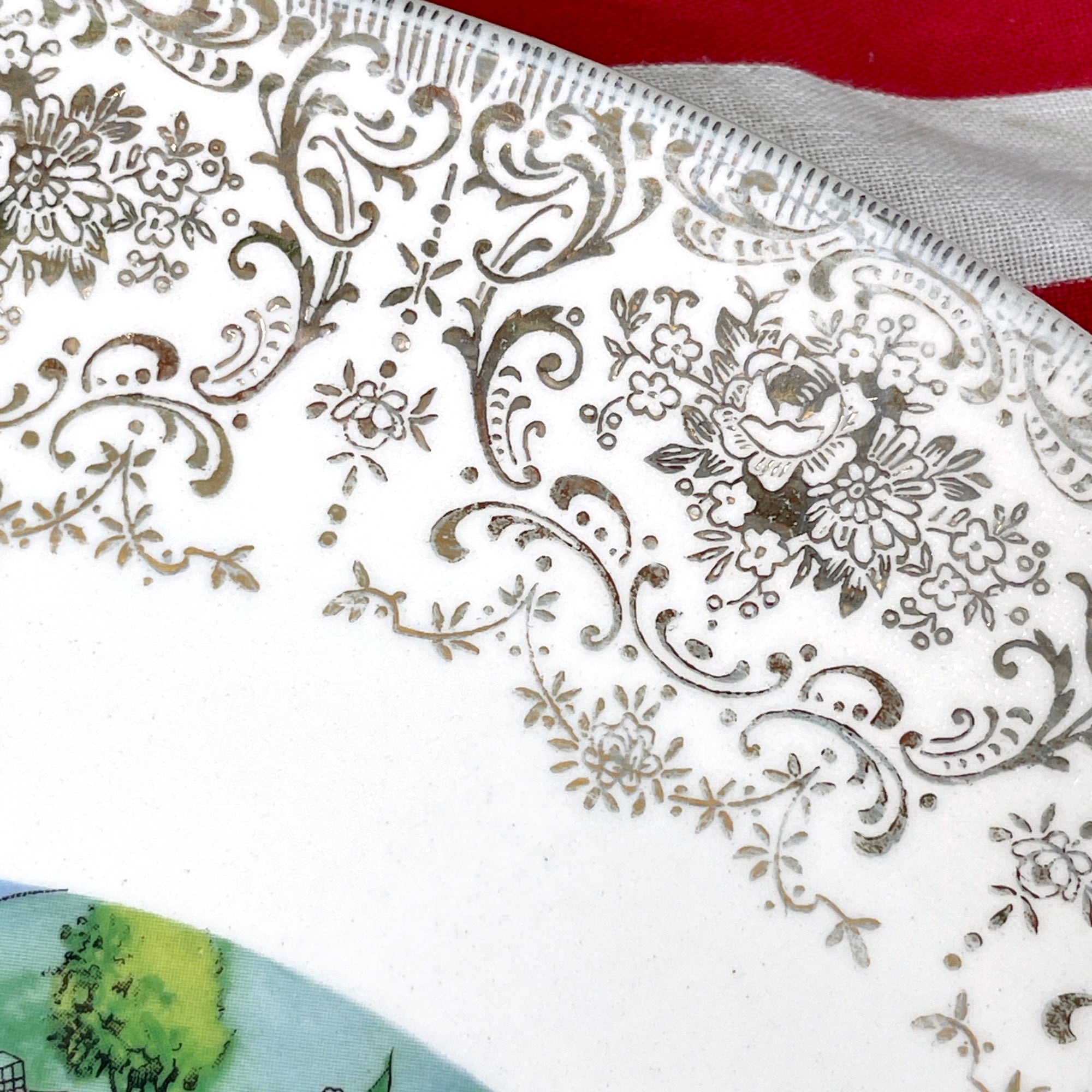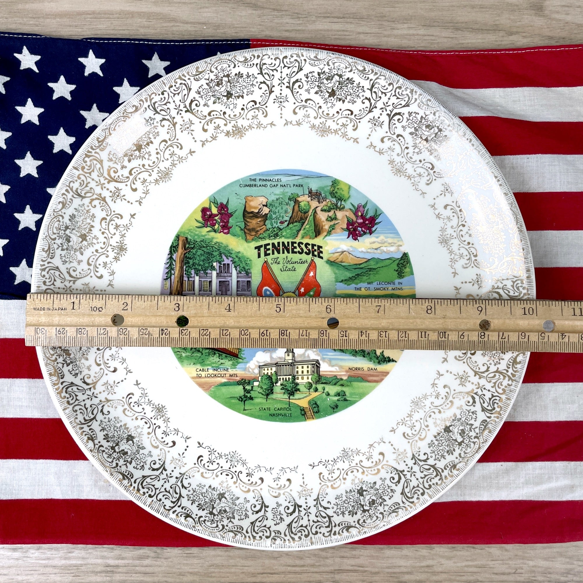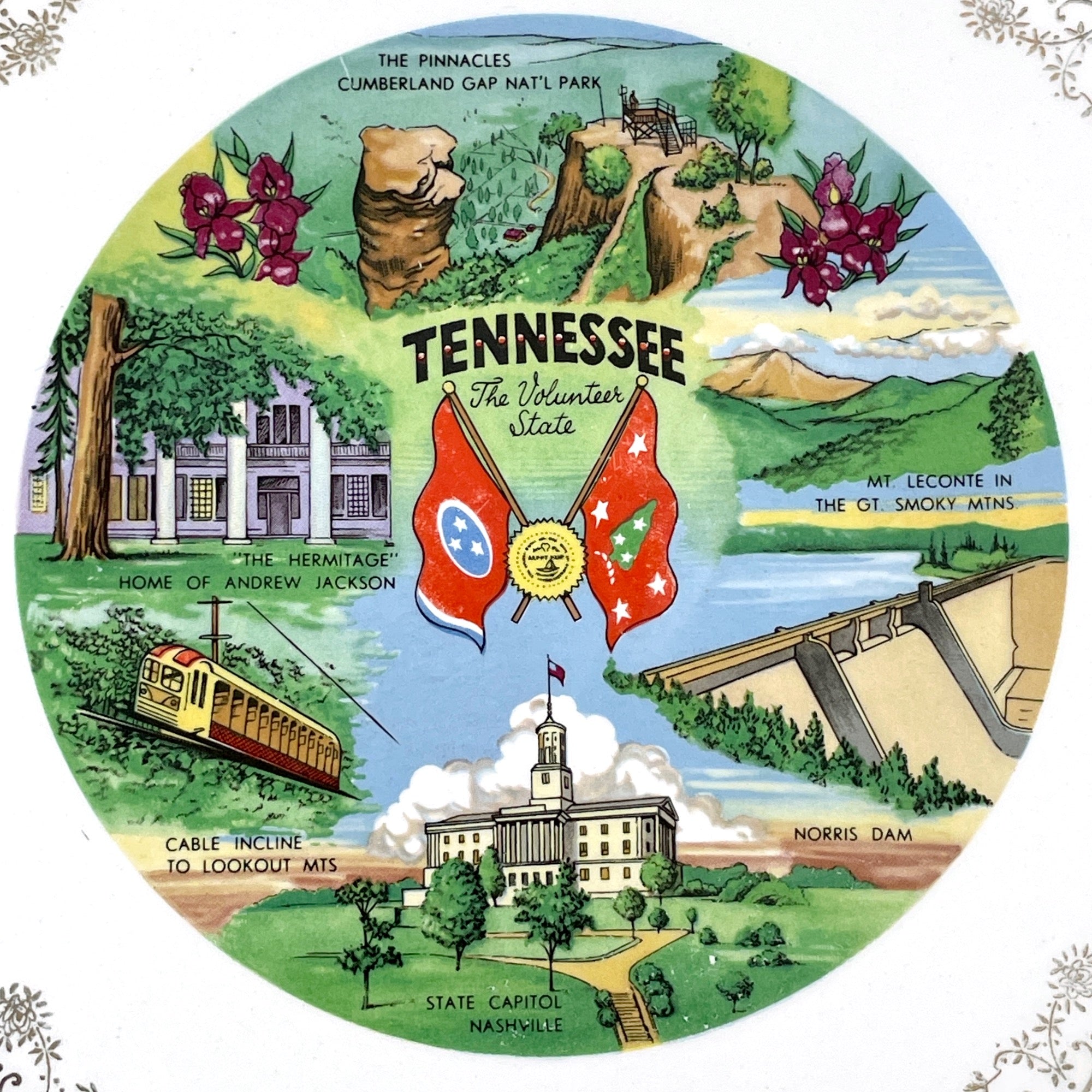 Vintage 1950s souvenir travel plate from Tennessee, The Volunteer State. Flag and seal logo is surrounded by images of The Pinnacles Cumberland Gap Nat'l Park, Mt. Leconte in the Gt Smoky Mtns, Norris Dam, State Capitol Nashville, Cable Incline to Lookout Mts, and "The Hermitage" Home of Andrew Jackson.