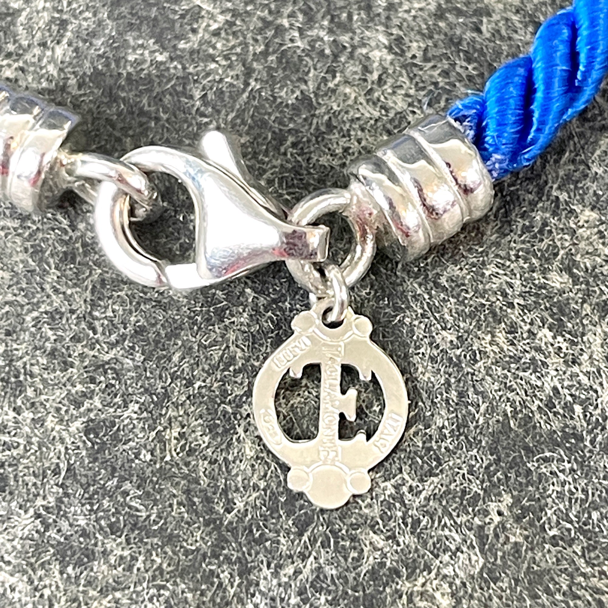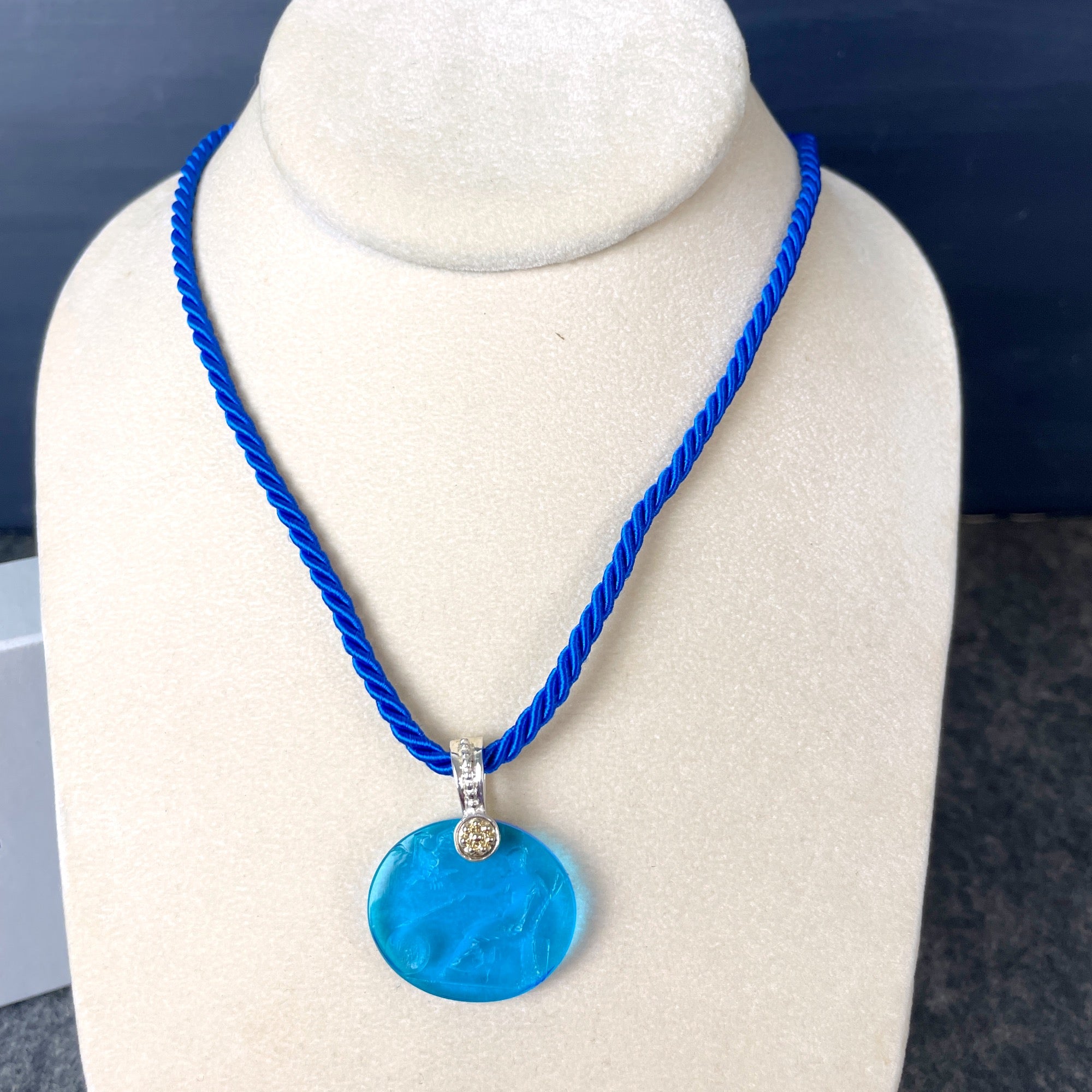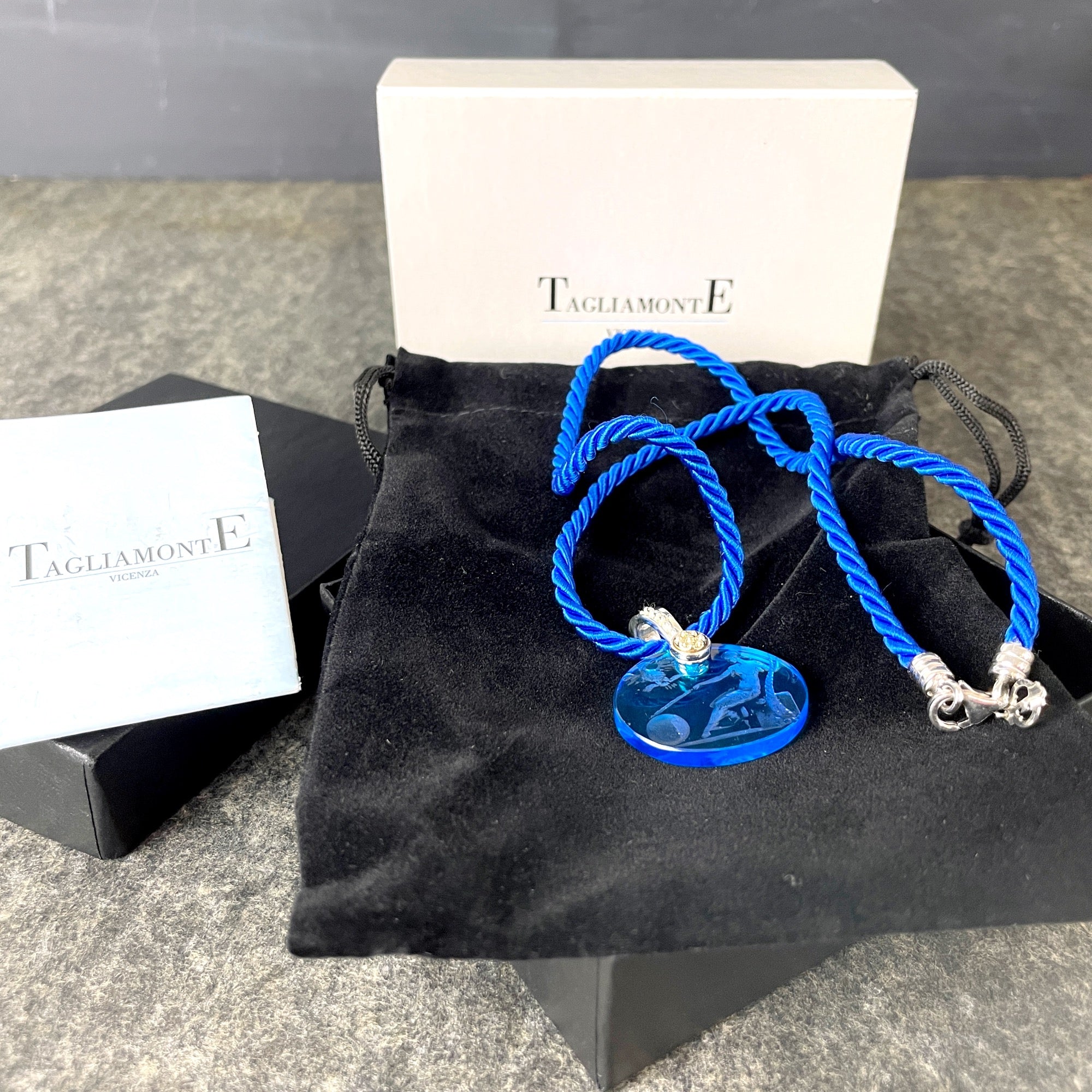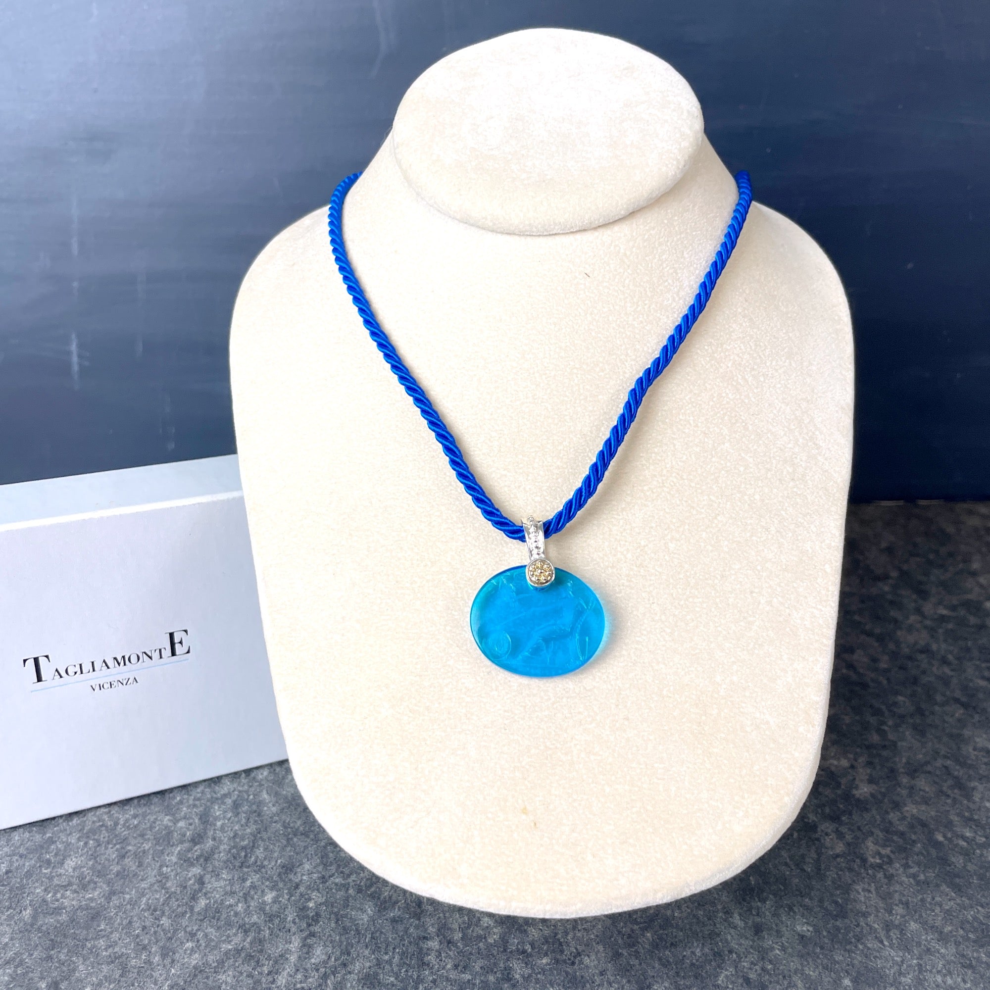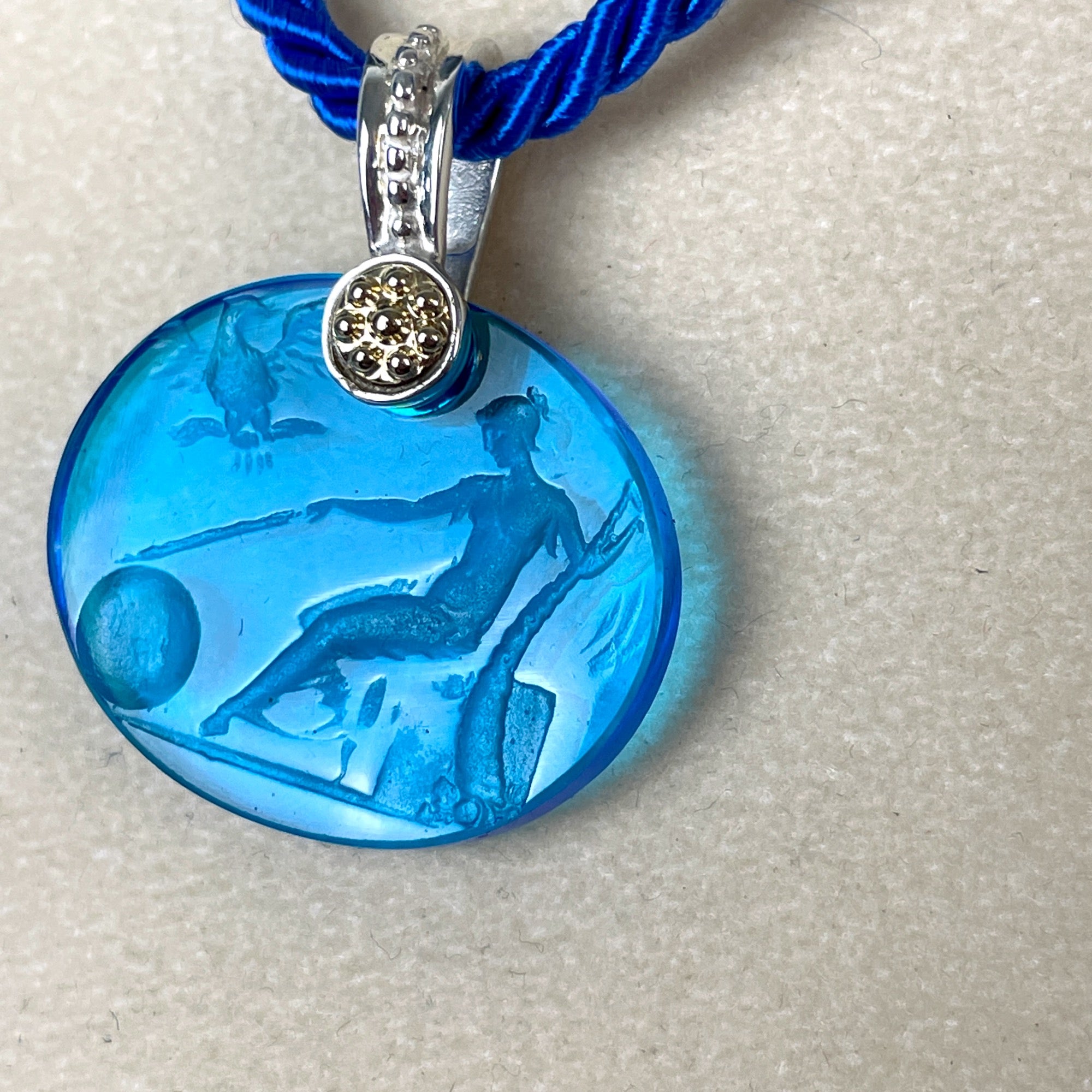 Tagliamonte Vincenza blue intaglio pendant of the Roman goddess Terra Mater, Mother Earth. Venetian cameo has a marked 14k gold and 925 loop. On blue cord. Made in Italy