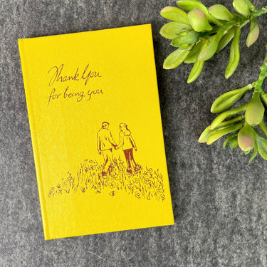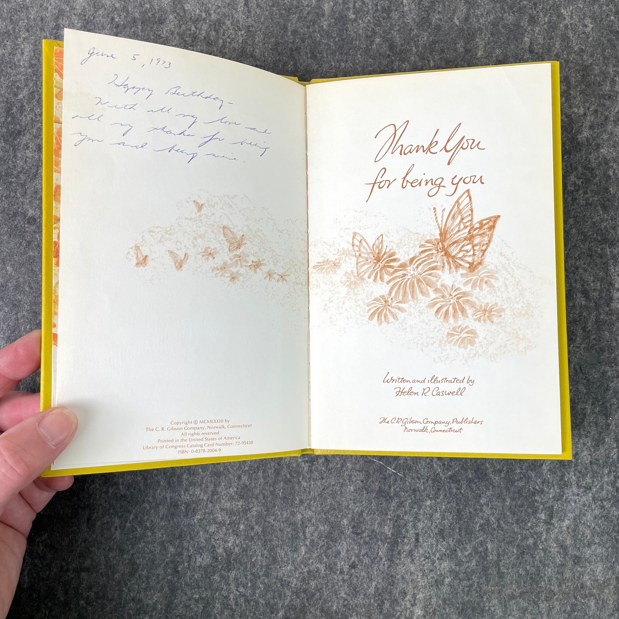 Vintage 1973 inspirational gift book, "Thank You for Being You," written and illustrated by Helen R. Caswell for the C. R. Gibson Company. Color and sepia drawings with thoughts about things to count as blessings.