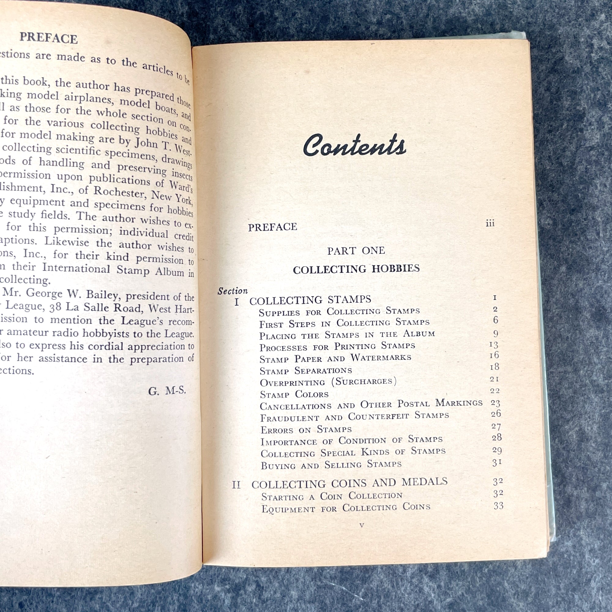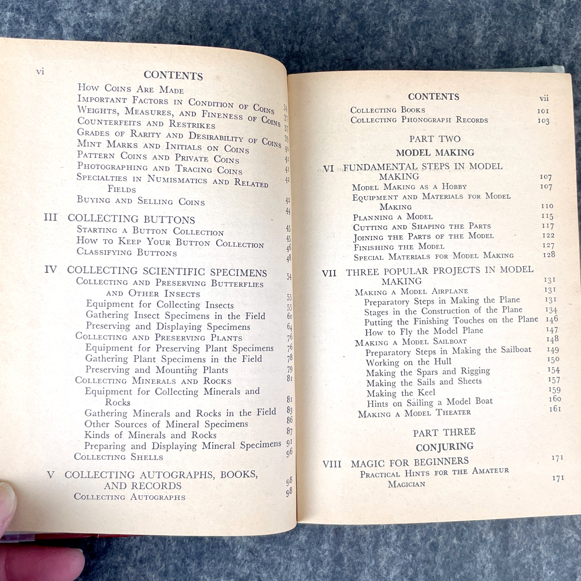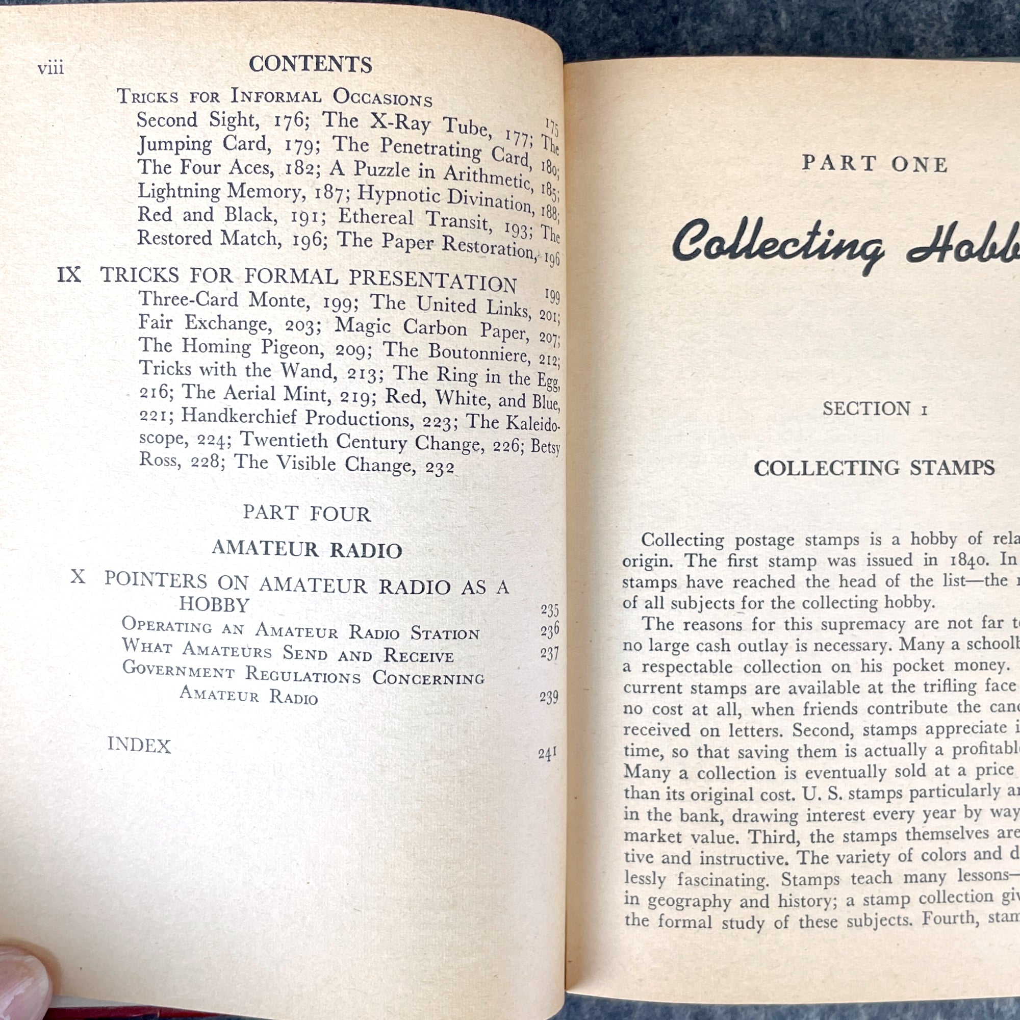 A book that fits in your pocket with all kinds of handy information on hobbies ranging from stamp collecting to conjuring to collecting various things. (See photos for table of contents.) Black and white line illustrations.