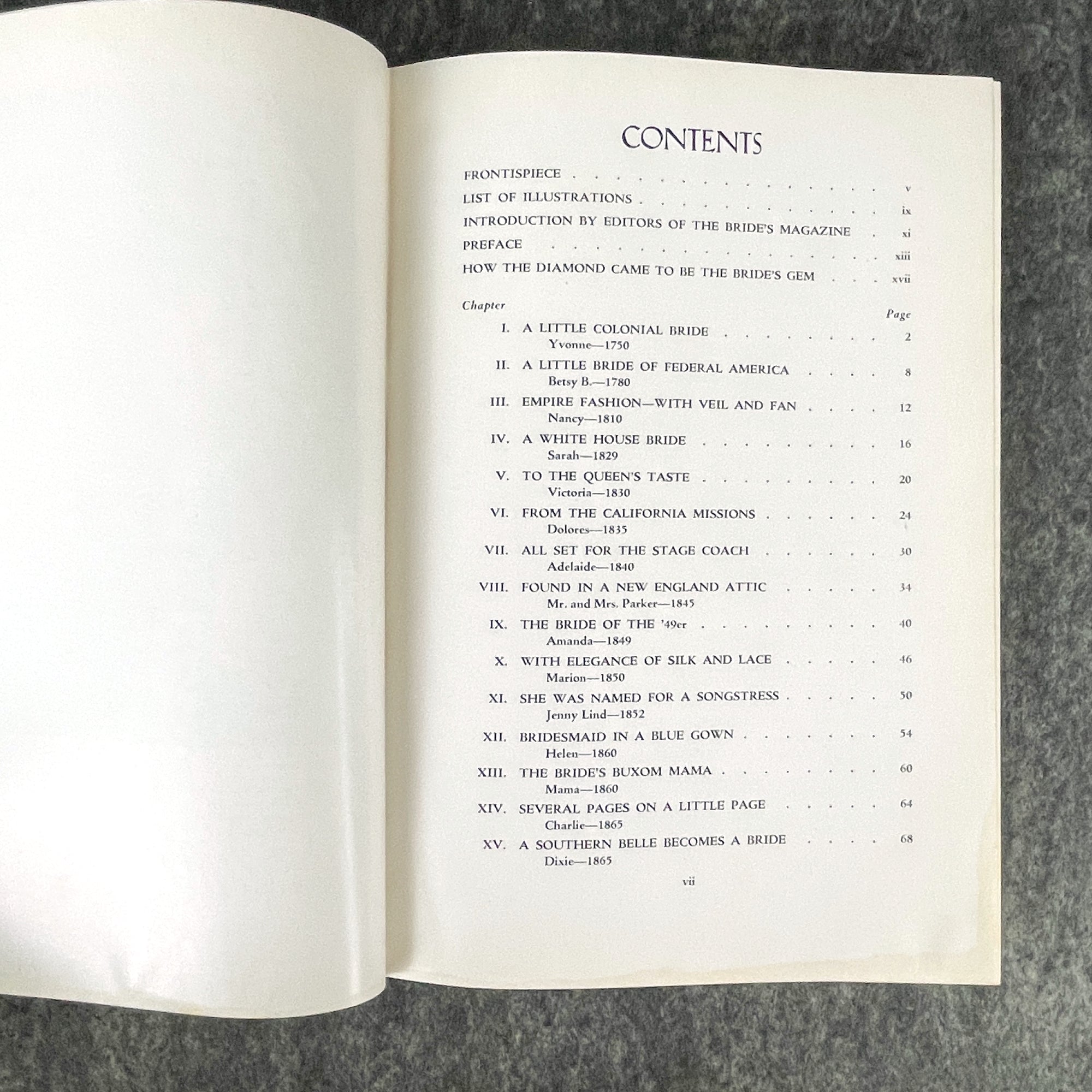 This charming book is filled with photos and information about bride dolls through the years, with discussions of bridal customs and how they are used in dolls. Lots of black and white photos on glossy pages. Cream-colored hardcover with gold lettering has bumped corners, and some discoloration, some pages discolored. Overall good condition. Fun display or prize at a bridal shower!