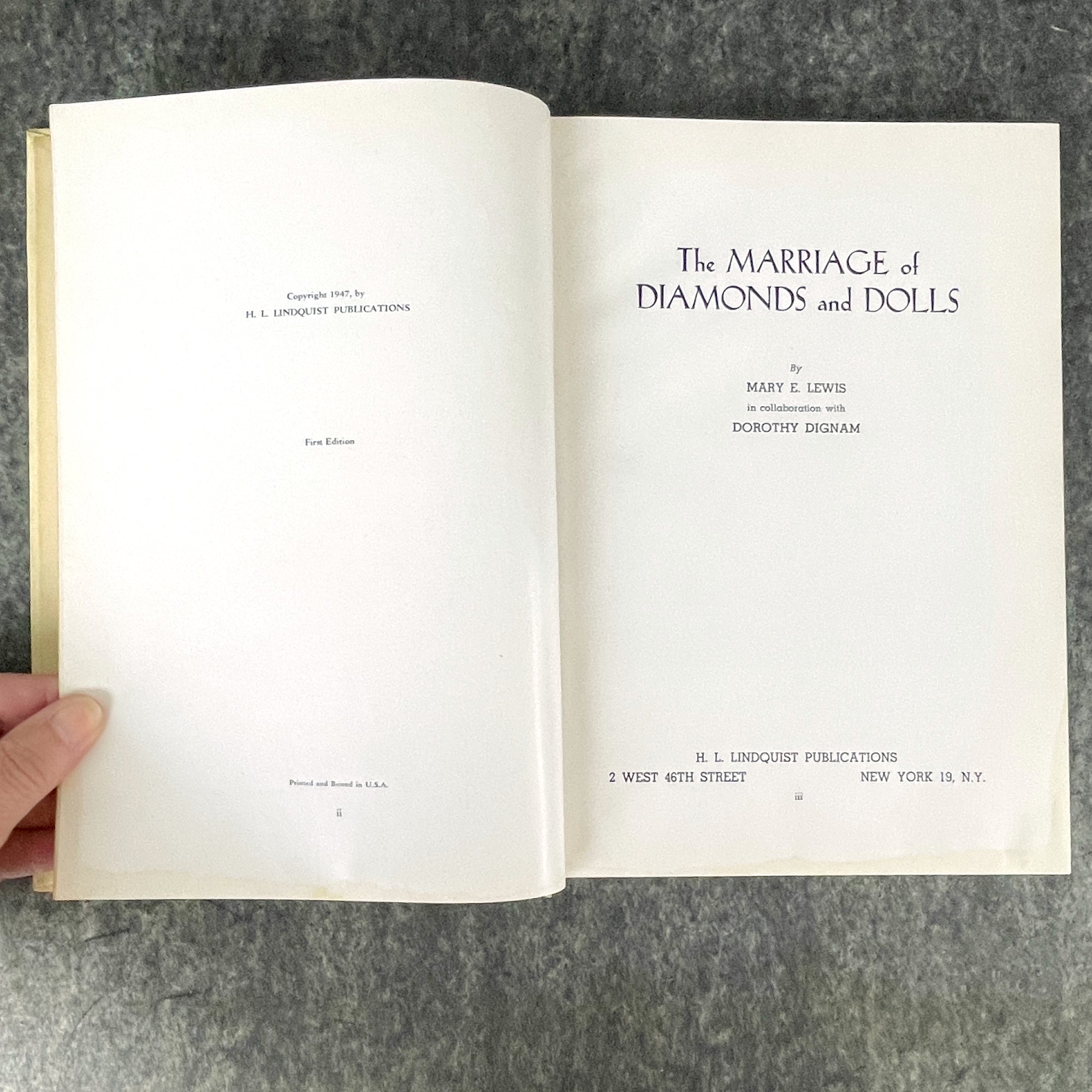 "The Marriage of Diamonds and Dolls" by Mary E. Lewis in collaboration with Dorothy Dignam. First Edition from 1947 inscribed by Dorothy Dignam, published by H. L. Lindquist Publications. Introduction by the editors of Brides Magazine.