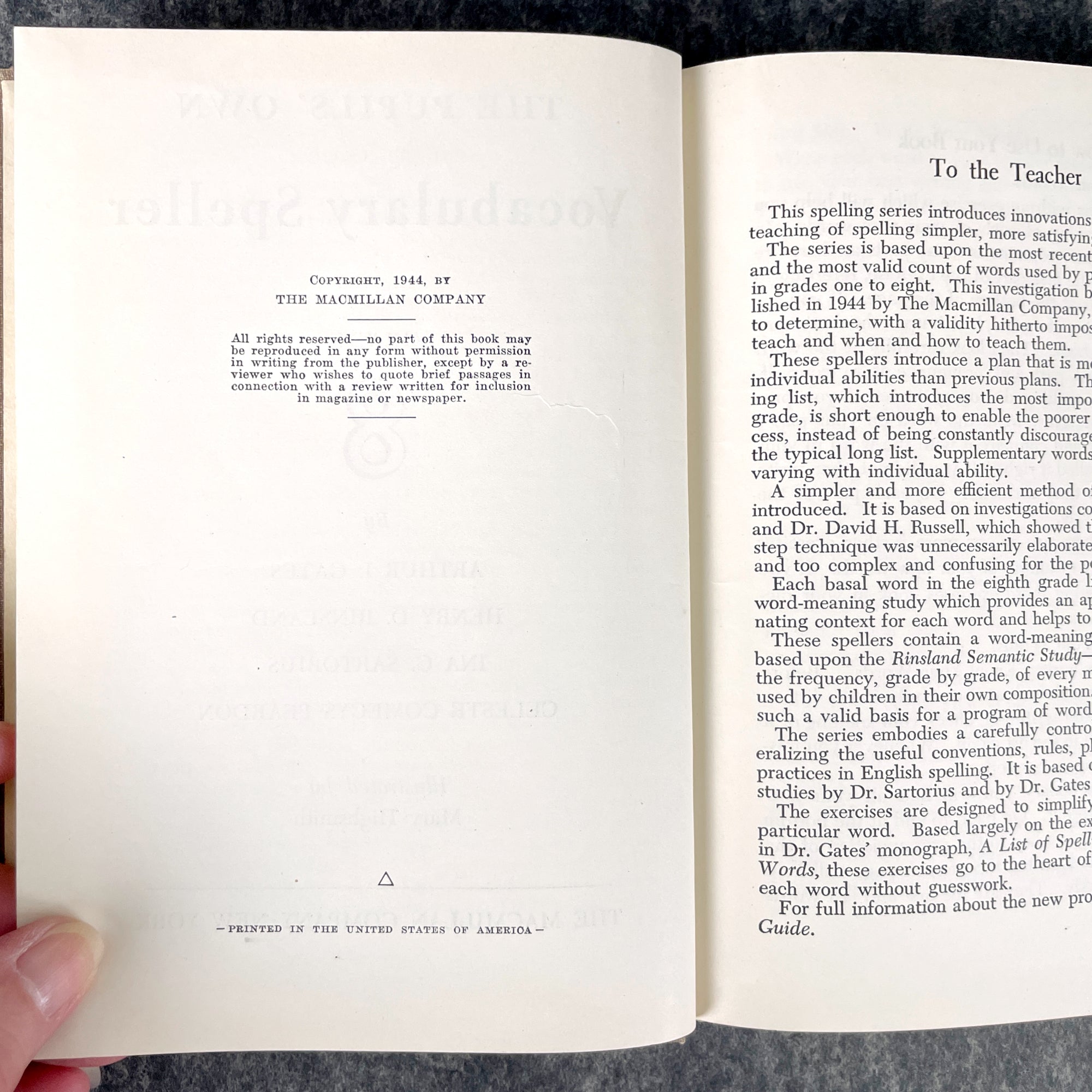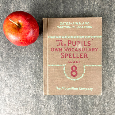 "The Pupils' Own Vocabulary Speller Grade 8" by Arthur I Gates, Henry D. Rinsland, Ina C Sartorius, and Celeste Comegys Peardon. Stamped as property of Hopkinton, MA school dept.