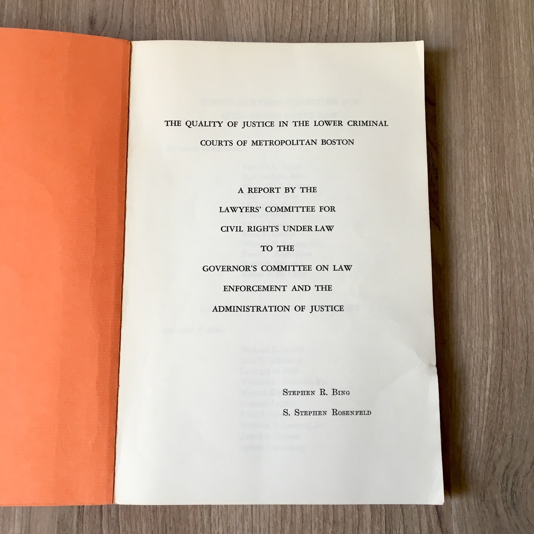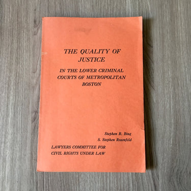 "The Quality of Justice in the Lower Criminal Courts of Metropolitan Boston: A Report by the Lawyer's Committee for Civil Rights Under Law to the Governor's Committee on Law Enforcement and the Administration of Justice" by Stephen R. Bing and S. Stephen Rosenfeld. 1970 paperback. Boston Lawyer's Committee for Civil Rights Under Law.
