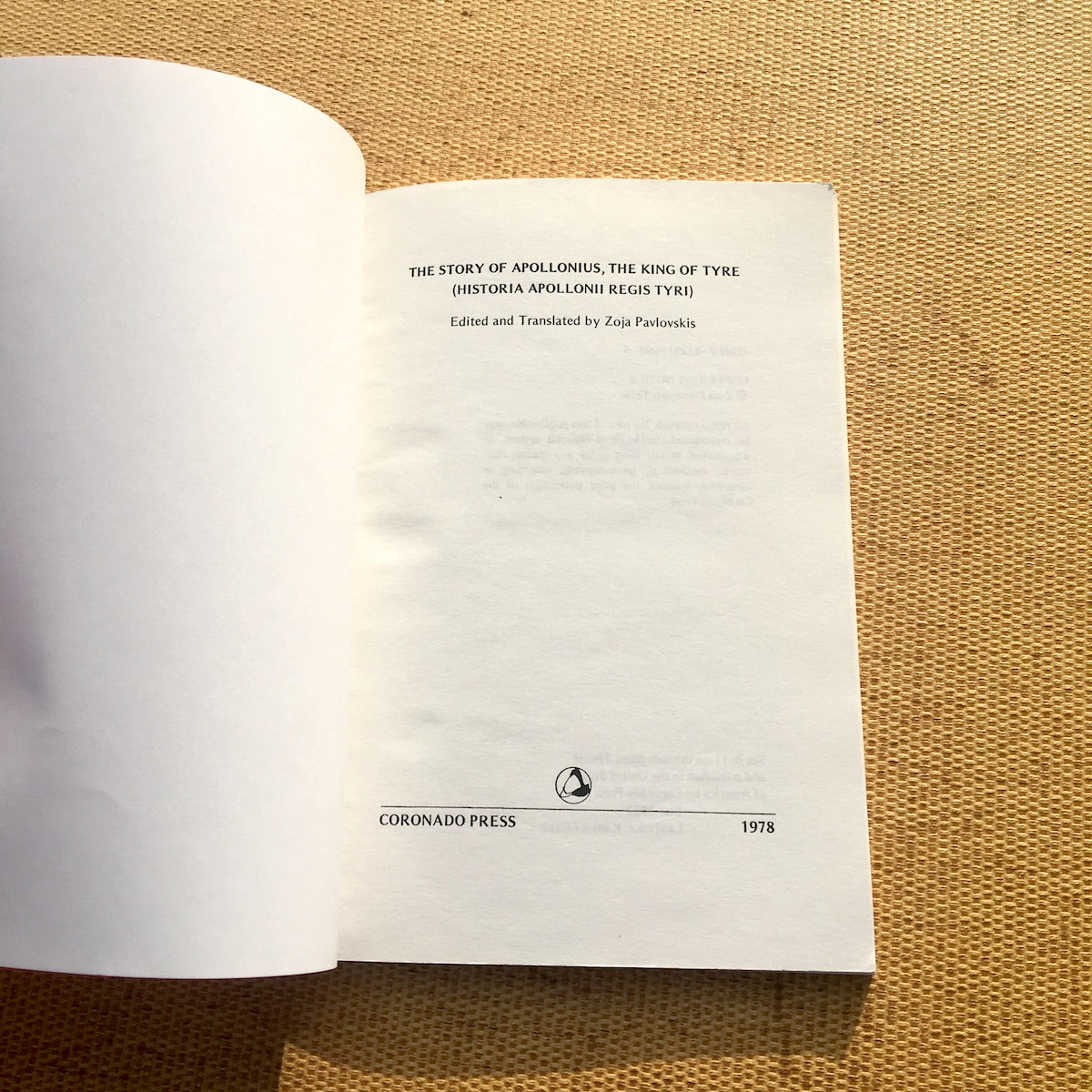 "The Story of Apollonius, King of Tyre (History Apollonii Regis Tyri)" edited and translated by Zoja Pavlovskis. 1978. Paperback. Published by Coronado Press, Lawrence KS.