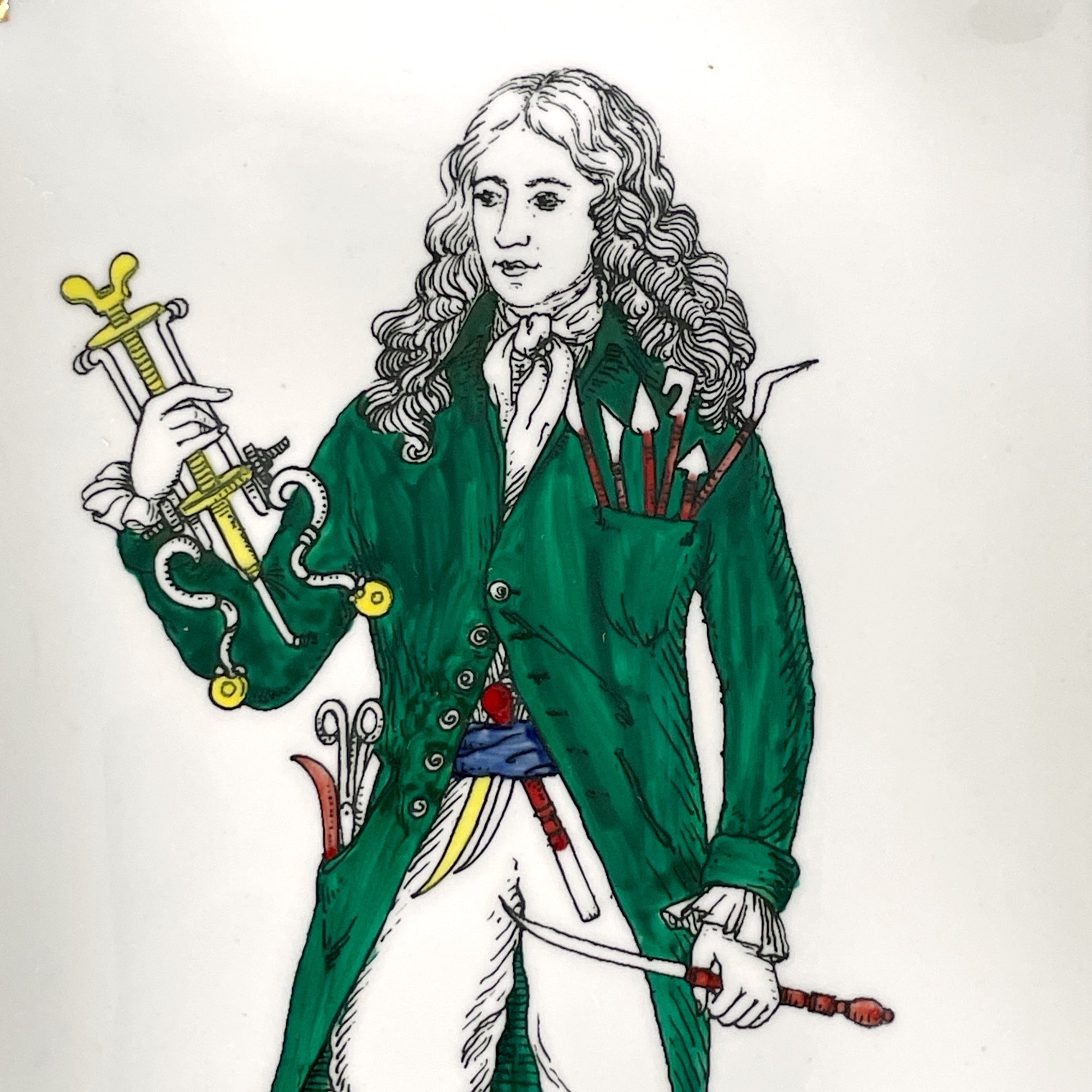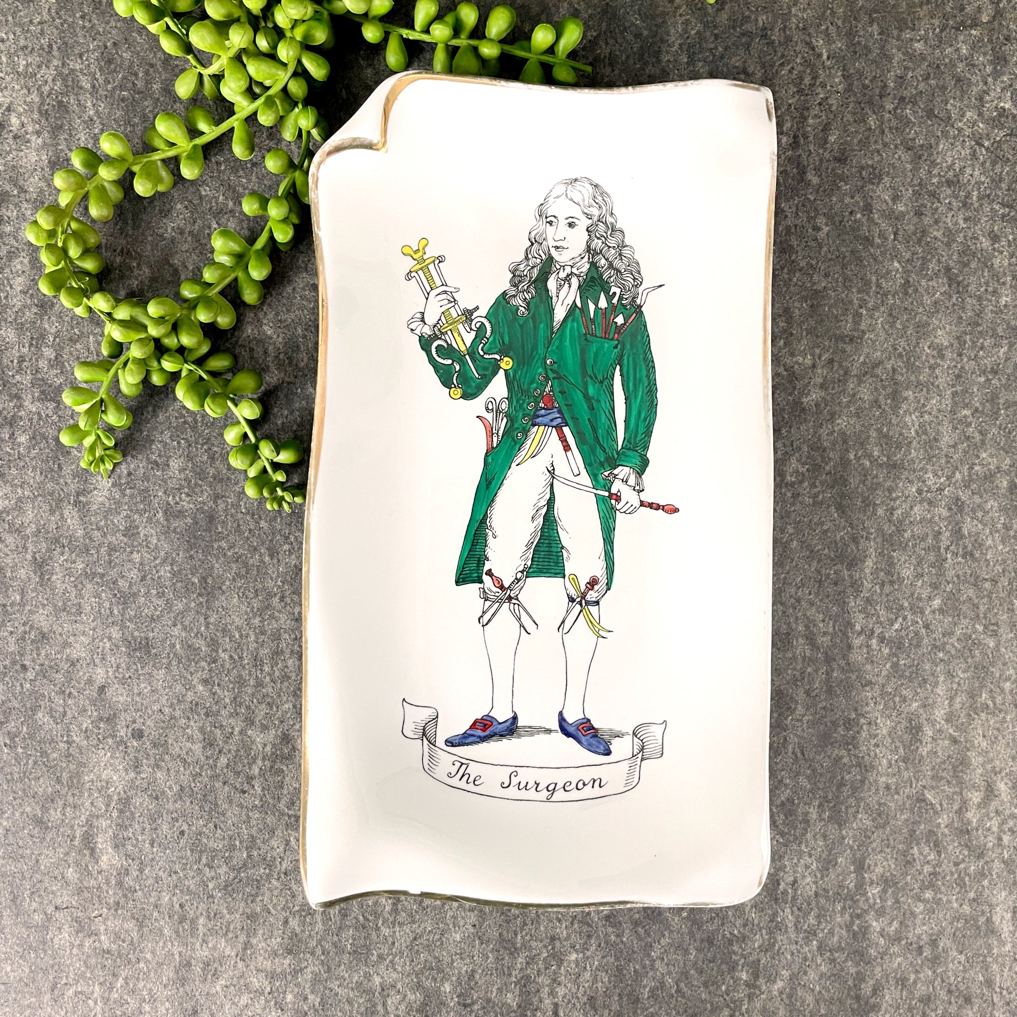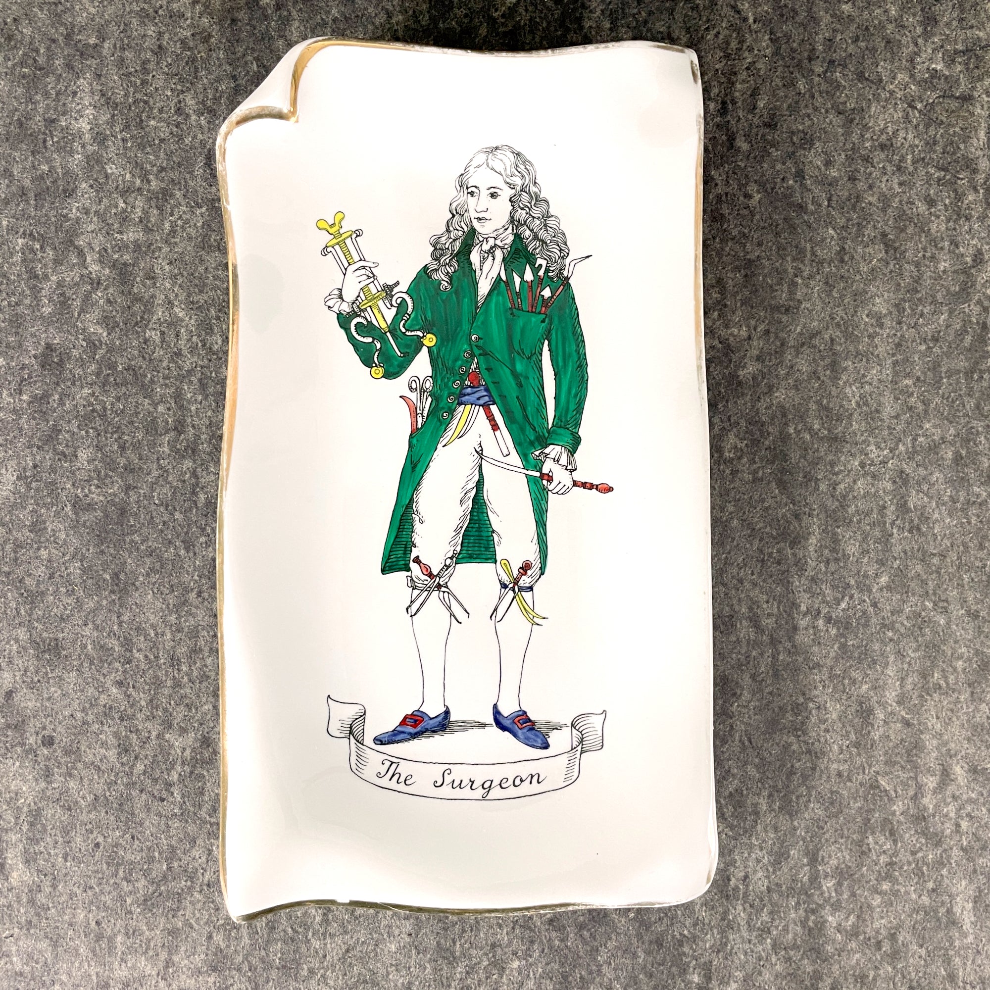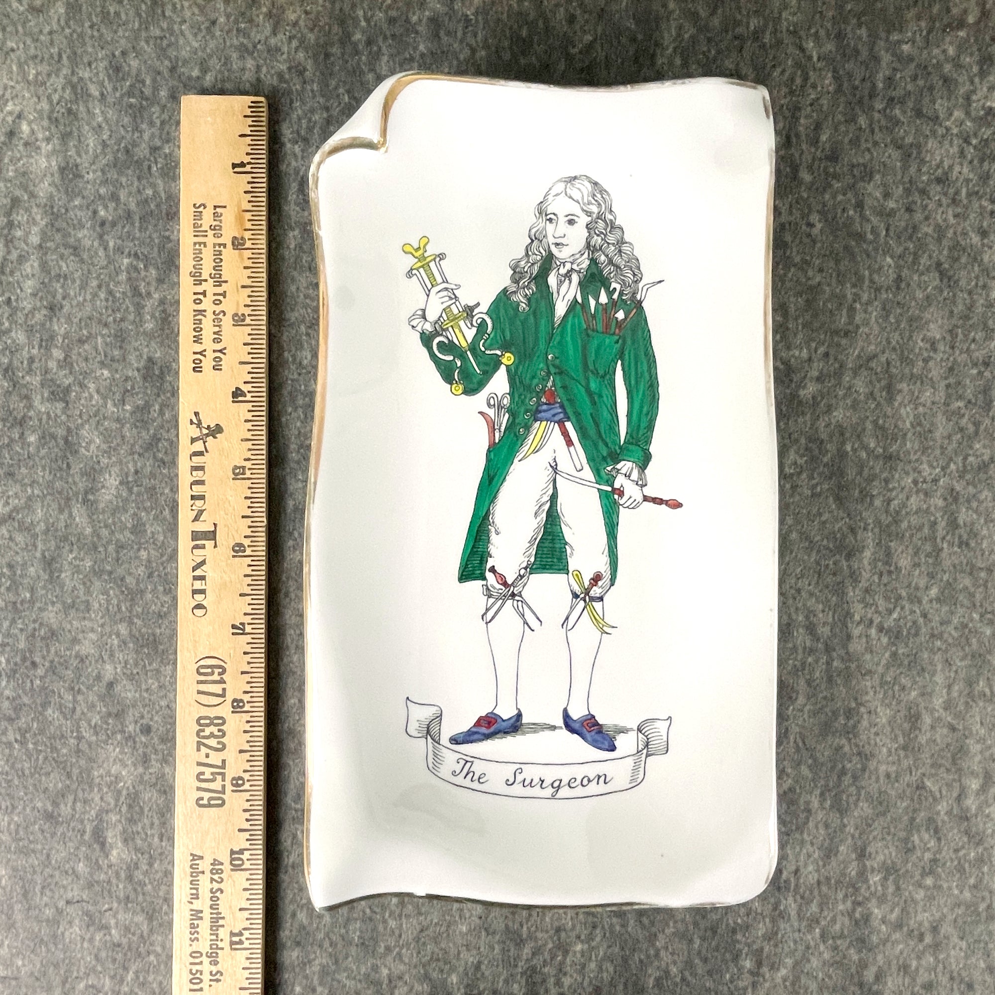 Rectangular decorative plate wall plate with "The Surgeon," an antique figure with black outlines and hand painted details. Amusingly drawn, the surgeon has tools in every pocket, nook and cranny, none of which you would ever want touching your personal self, with or without anesthesia. Gold trim and wire on back for hanging. Made in Italy for  Rosenfeld Imports, NY.