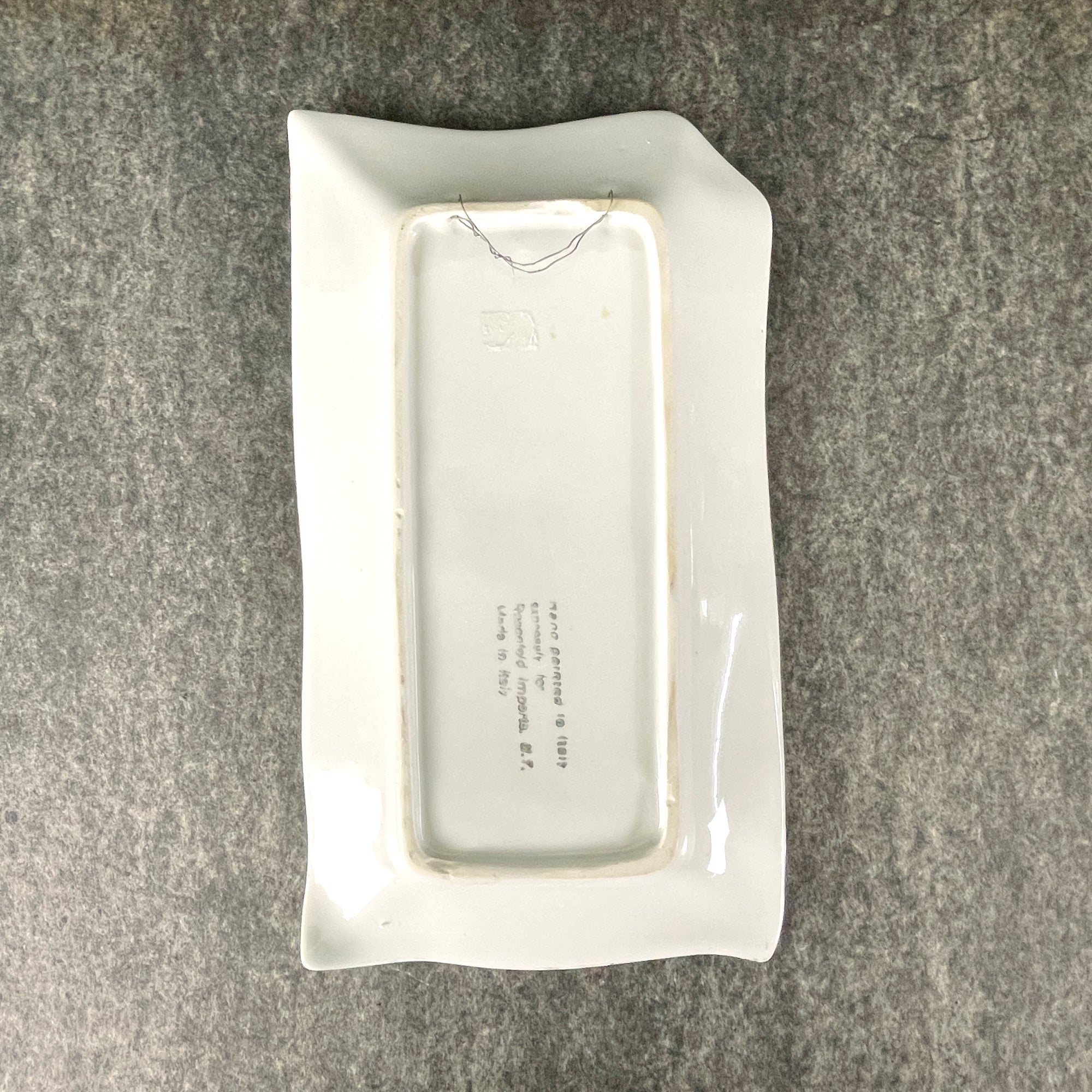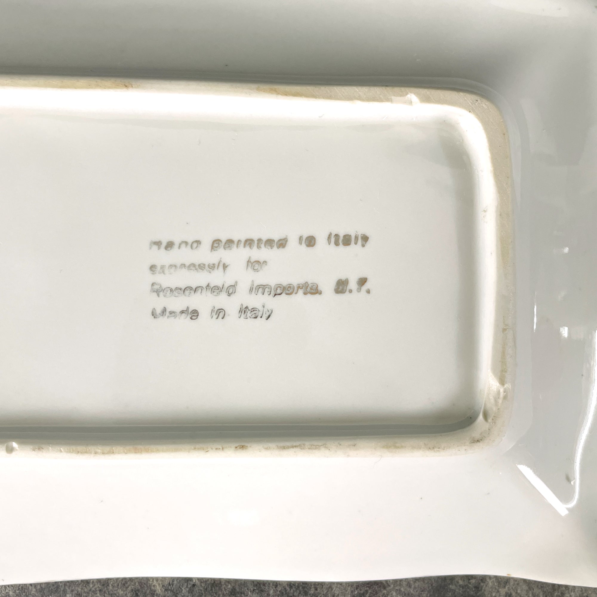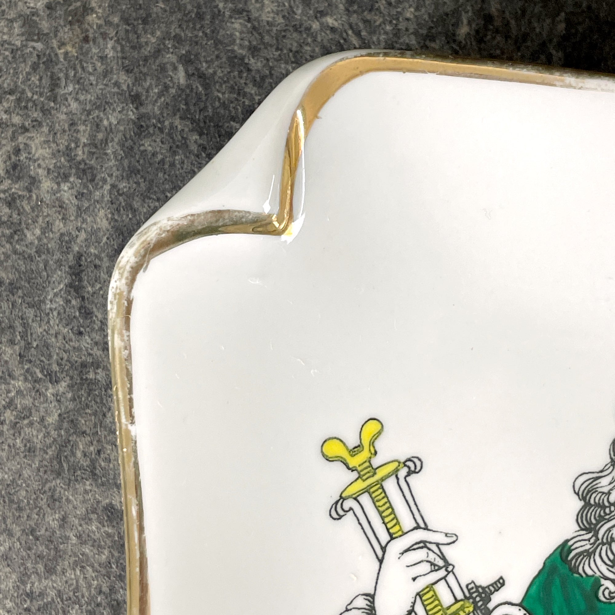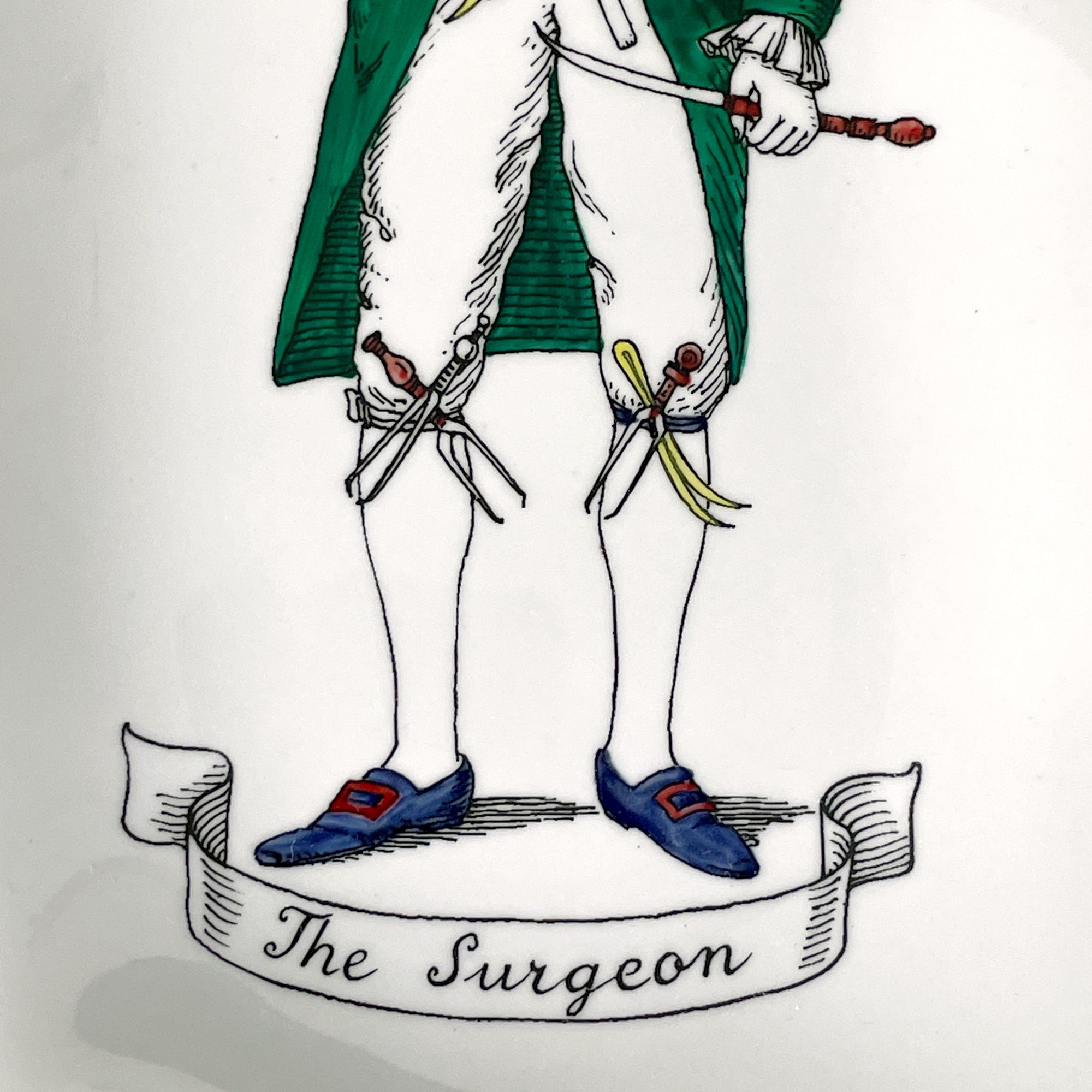 Rectangular decorative plate wall plate with "The Surgeon," an antique figure with black outlines and hand painted details. Amusingly drawn, the surgeon has tools in every pocket, nook and cranny, none of which you would ever want touching your personal self, with or without anesthesia. Gold trim and wire on back for hanging. Made in Italy for  Rosenfeld Imports, NY.