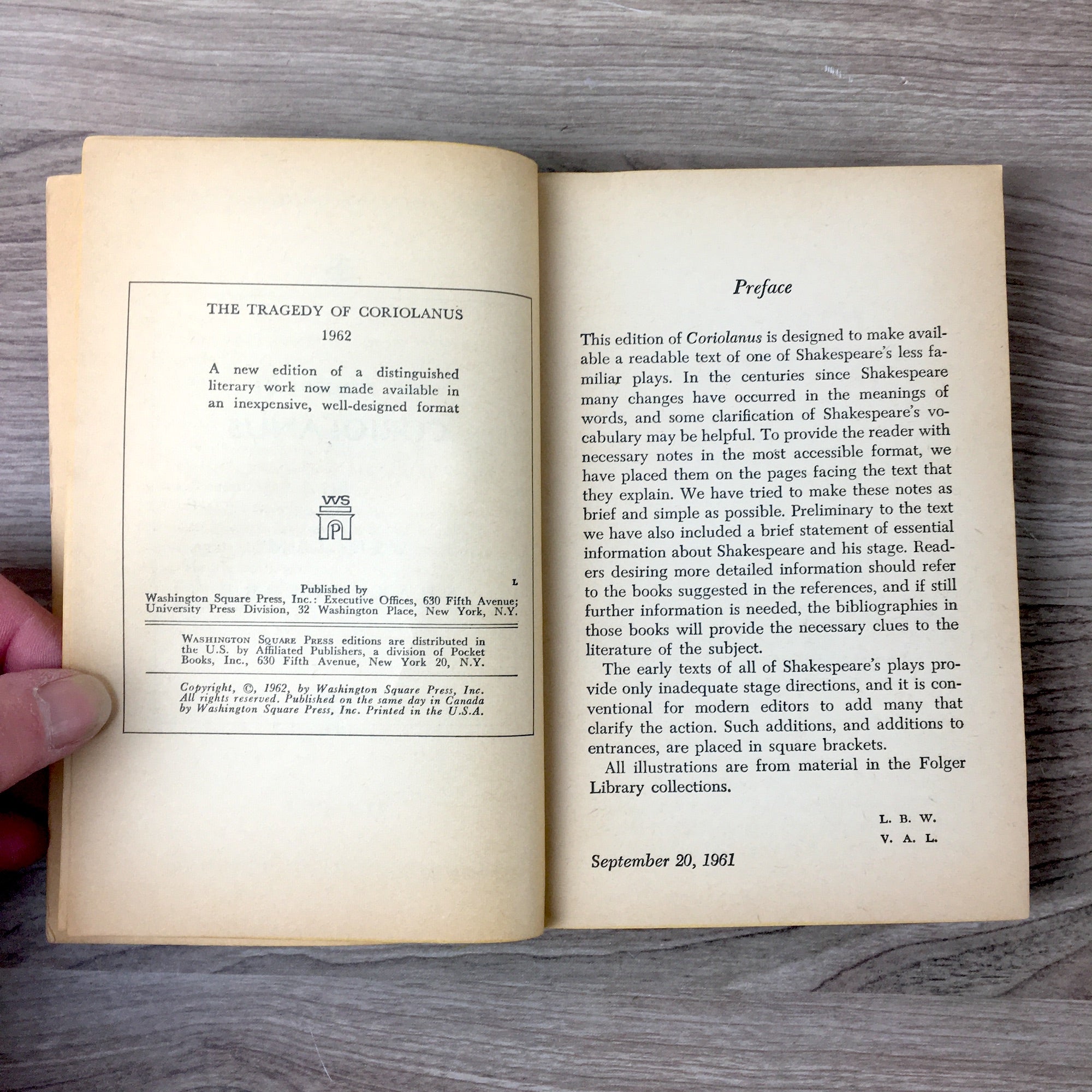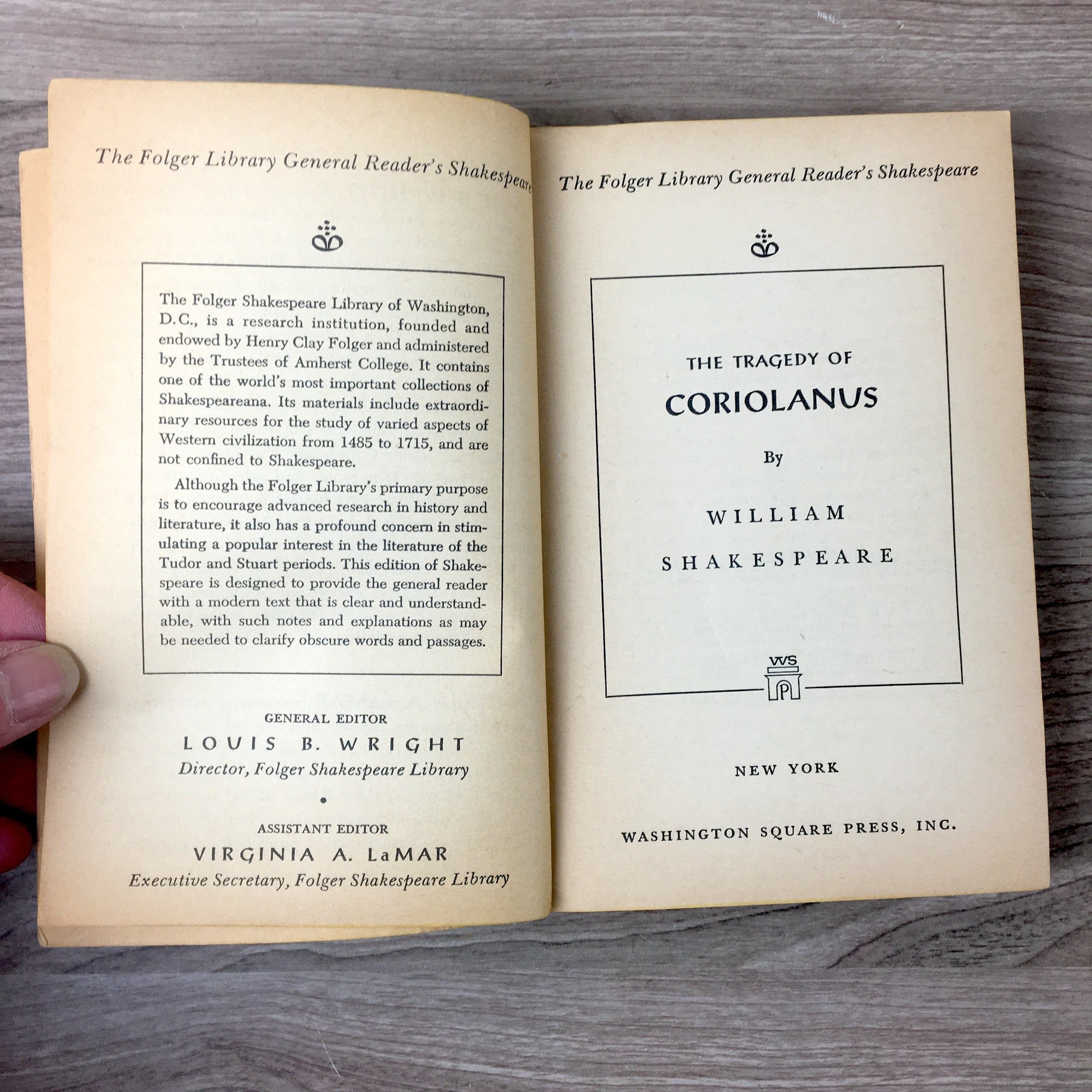 The Tragedy of Coriolanus - Folger Library General Reader's Shakespeare. Paperback from Washington Square Press. 1962 1st printing. Edited by Louis B. Wright and Virginia A. LaMar. Publisher's number W125.