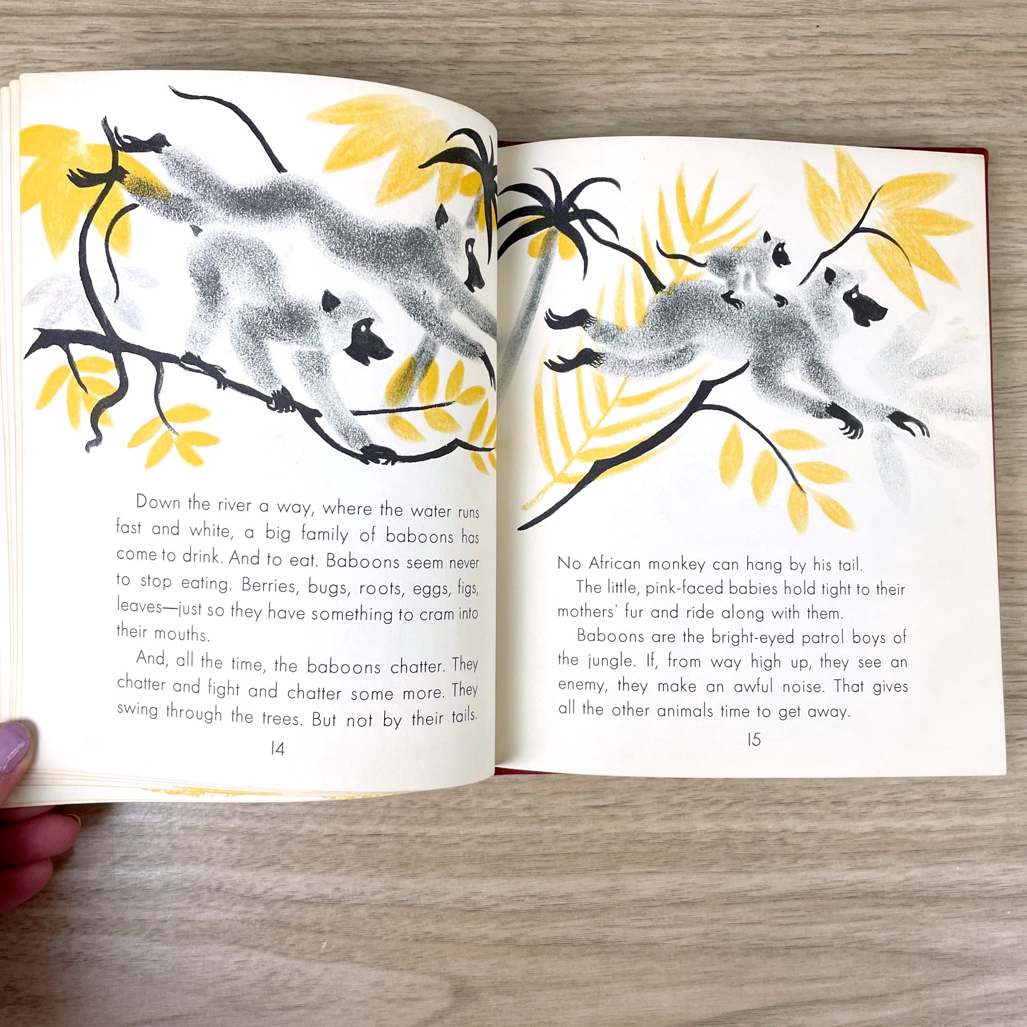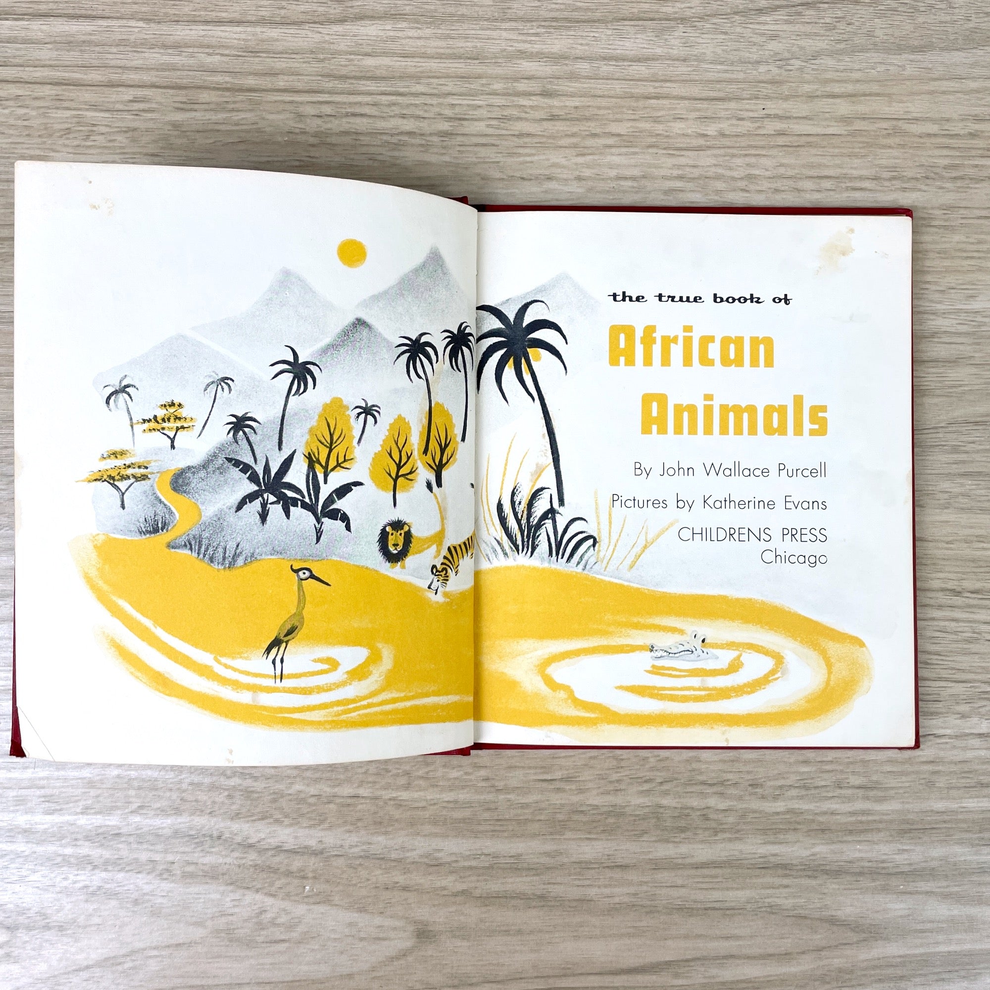 "The True Book of African Animals" by John Wallace Purcell. Pictures by Katherine Evans. Childrens Press, Chicago. 1954 copyright. Hardcover with black and spot color illustrations.