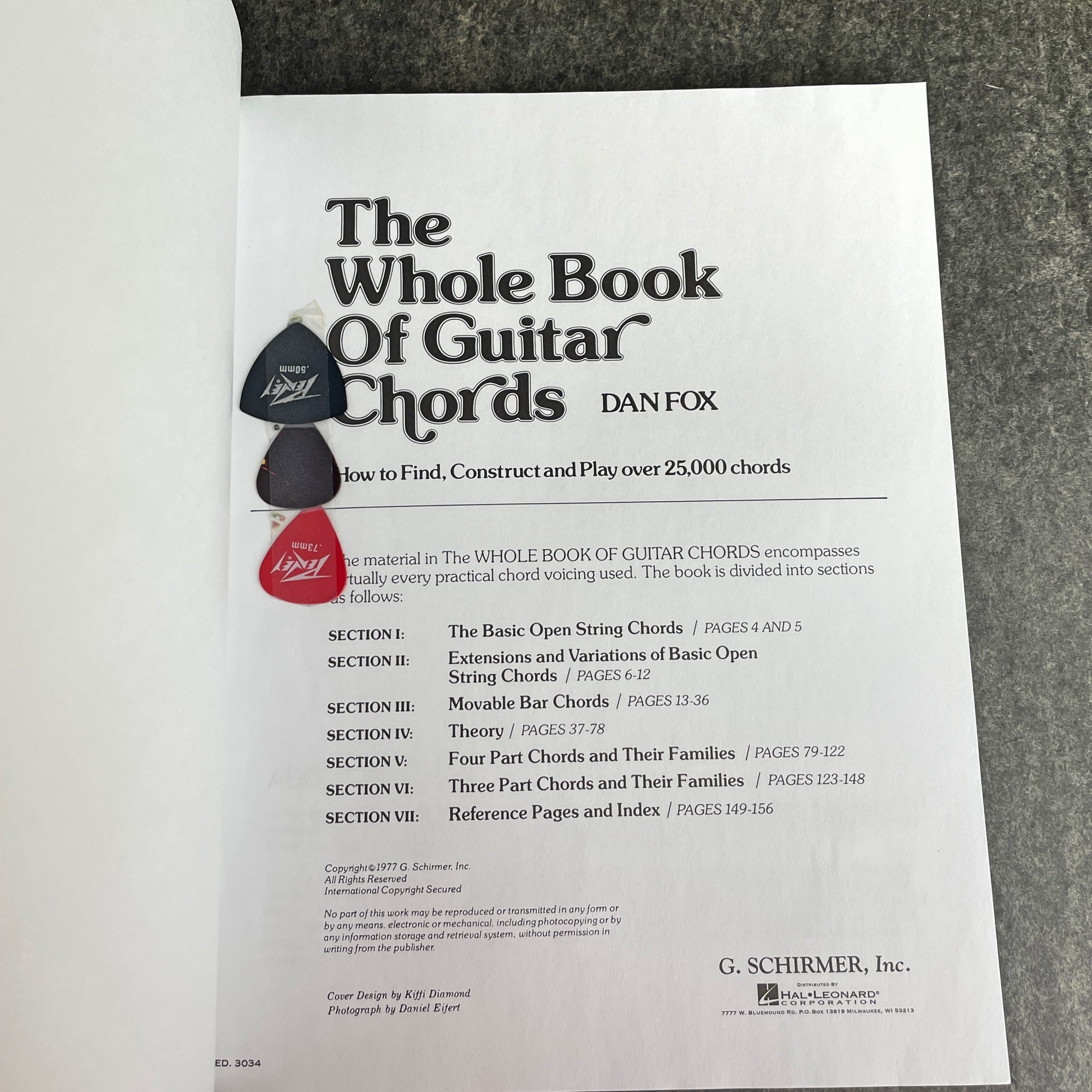 "The Whole Book of Guitar Chords - How to Find, Construct and Play over 25,000 chords" by Dan Fox. 1997 softcover. G. Schirmer, Inc. Comes with 3 guitar picks.
