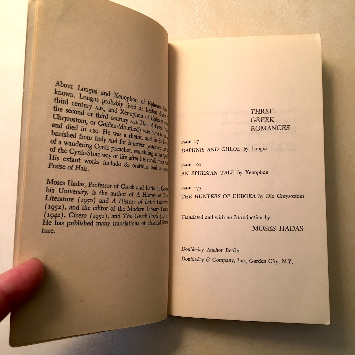 "Three Greek Romances" Translated and introduced by Moses Hadas - Anchor A21 paperback - 1950s.