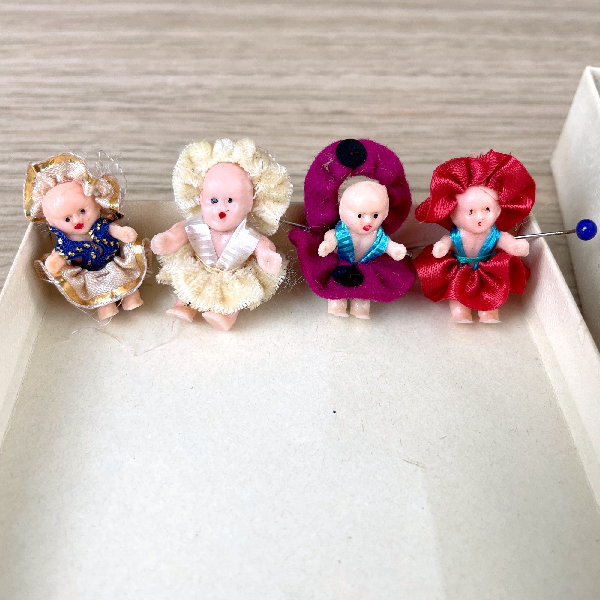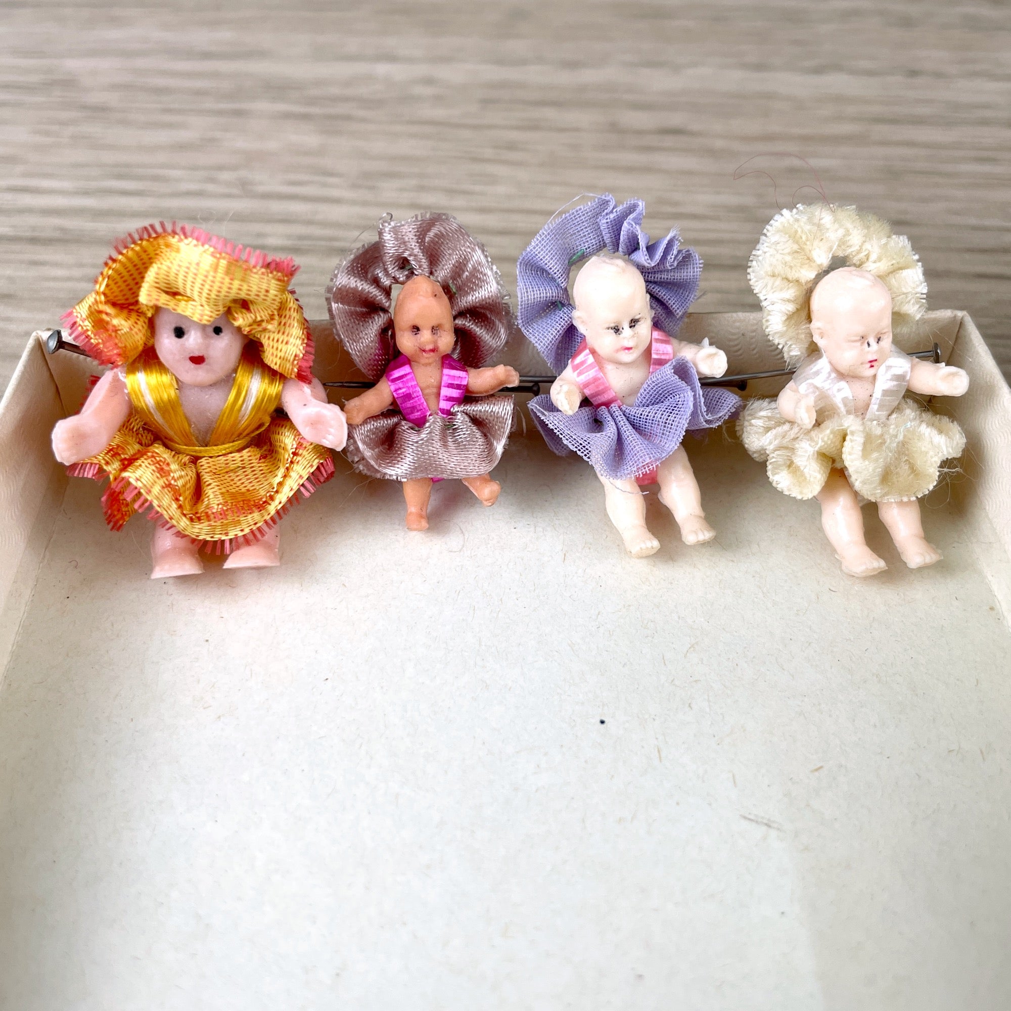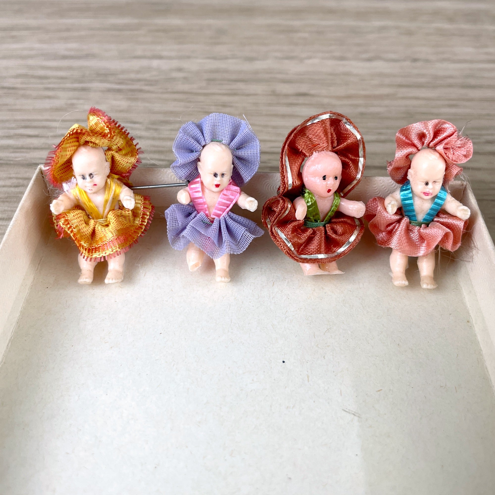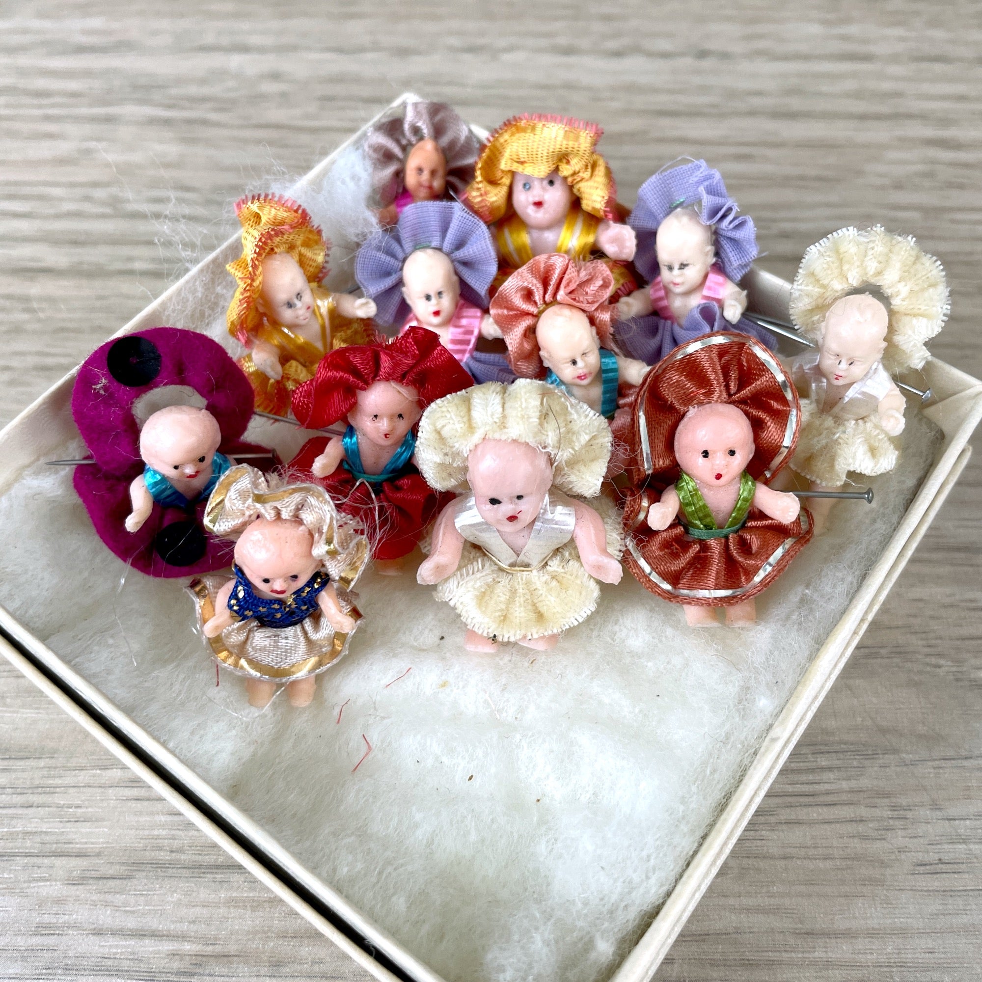 Collection of 12 hand decorated vintage plastic babies. Each one has a hand gathered bonnet and skirt as well as ribbon straps and diapers. Each has a straight pin to attach it to your lapels. We think these were probably made for a baby shower in the 1940s or 1950s based on materials. There are a couple different styles of plastic babies.