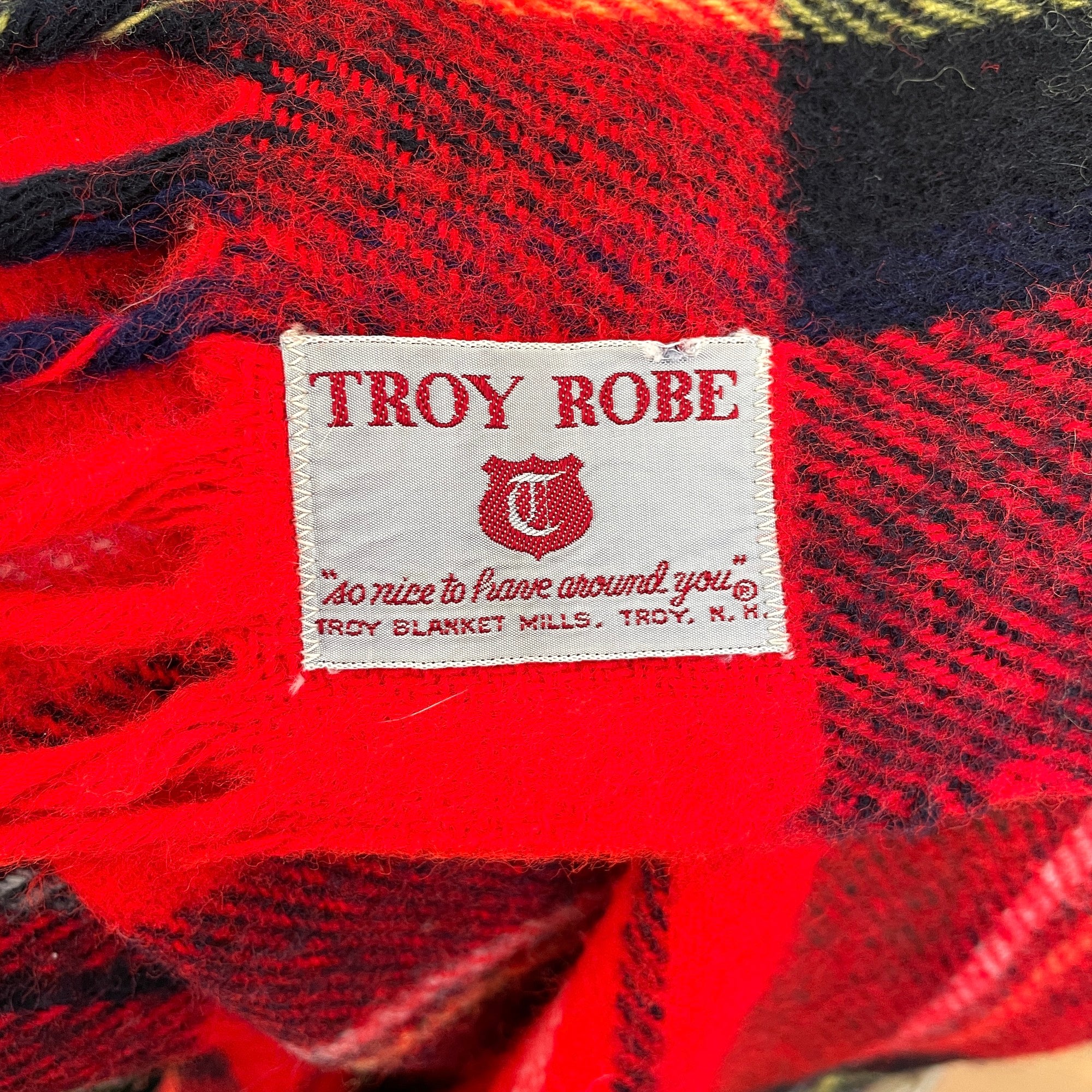 Vintage plaid throw by Troy Robe of Troy, NH. Red, black, white, yellow and green large scale plaid with fringe on each end. Excellent size for staying cozy at home, at the game or as a car robe. Fiber content not marked, likely woolen since that was what Troy Robe was known for.