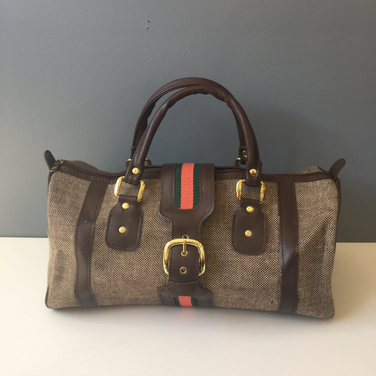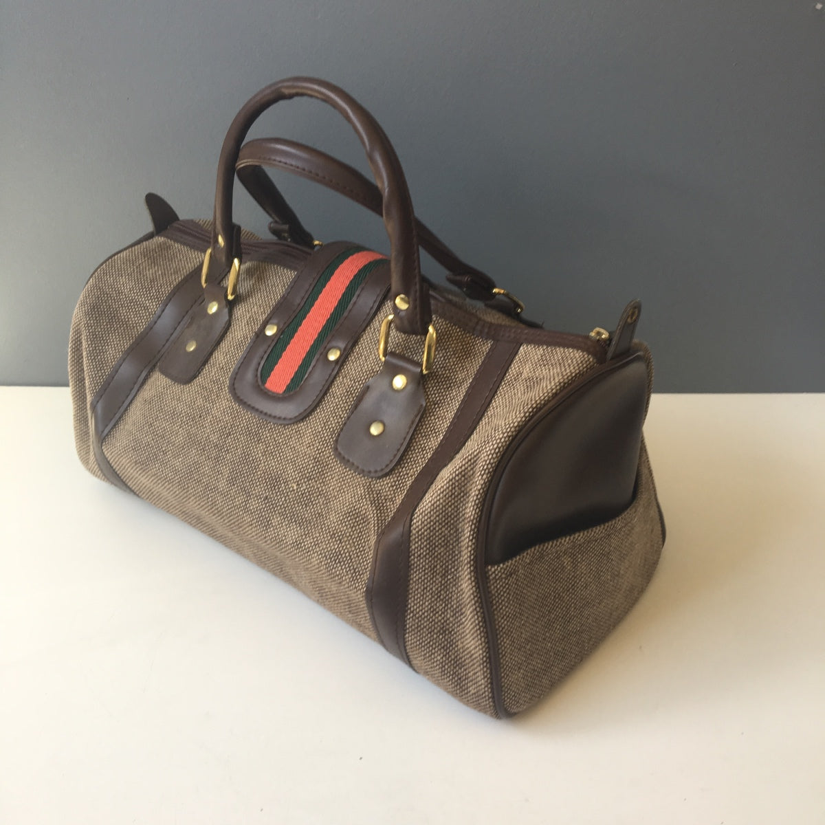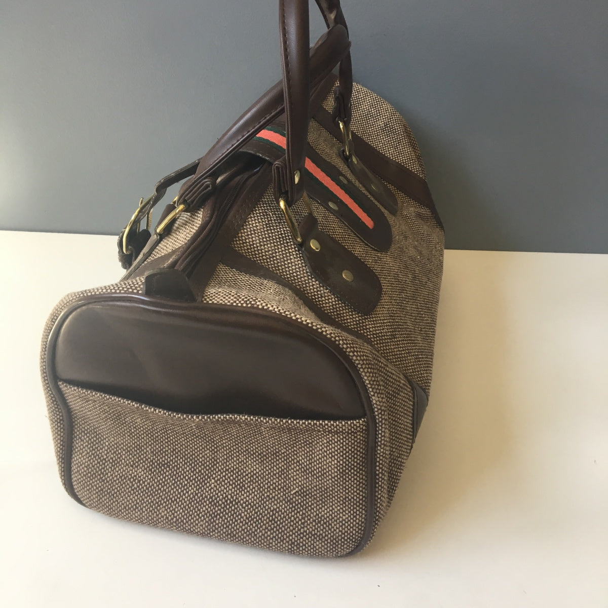 Vintage 1970s weekend bag, new old stock. Brown vinyl and brown and white tweed laminated to vinyl with goldstone hardware. Nylon zipper. Small open pockets on each end. Buckle strap with green and russet twill ribbon insert. Photographed plumped with paper.