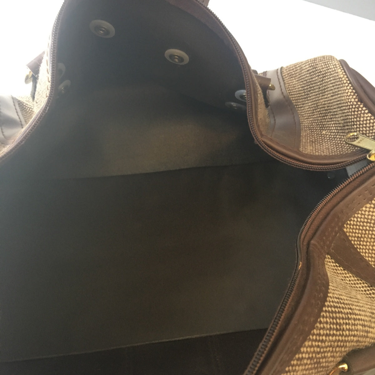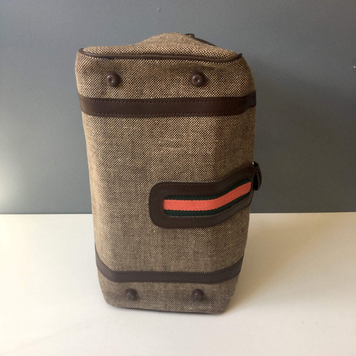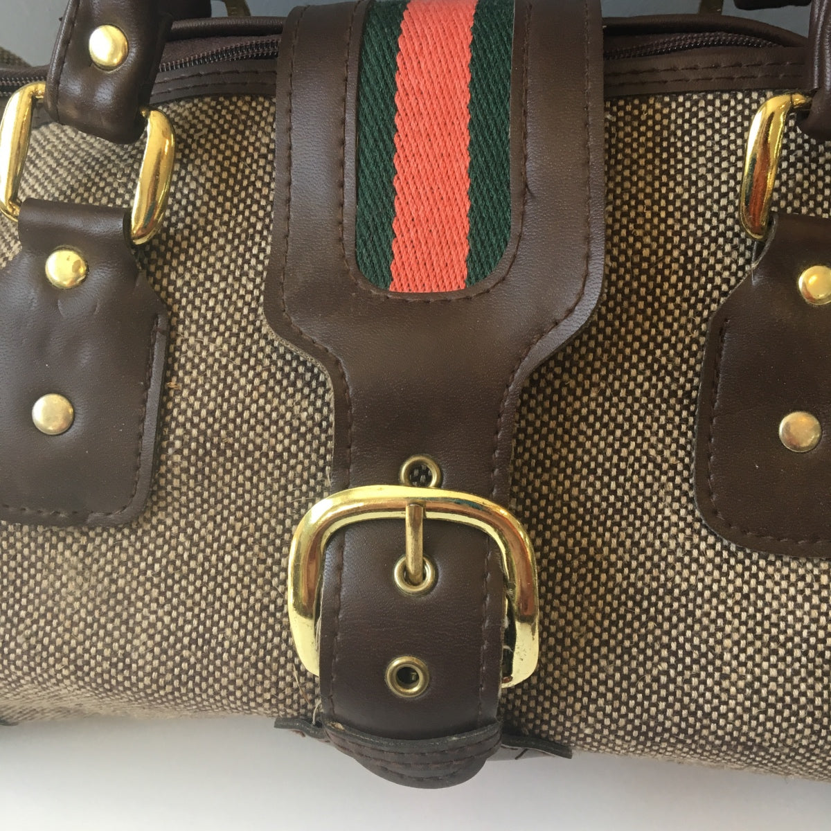 Vintage 1970s weekend bag, new old stock. Brown vinyl and brown and white tweed laminated to vinyl with goldstone hardware. Nylon zipper. Small open pockets on each end. Buckle strap with green and russet twill ribbon insert. Photographed plumped with paper.