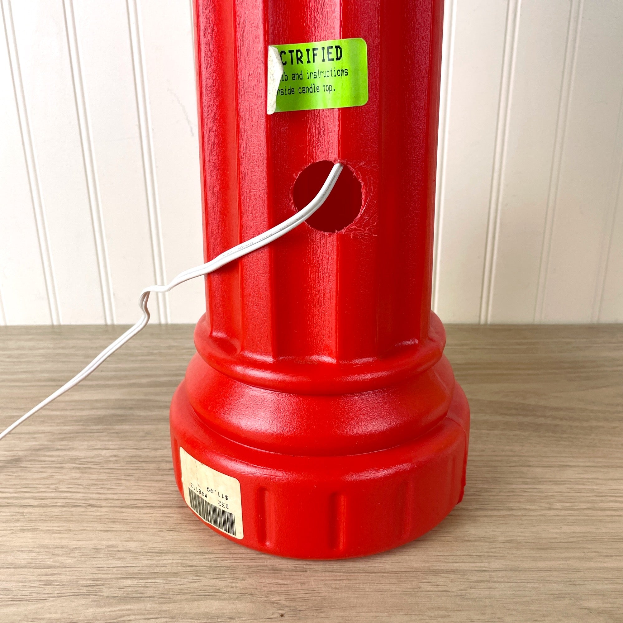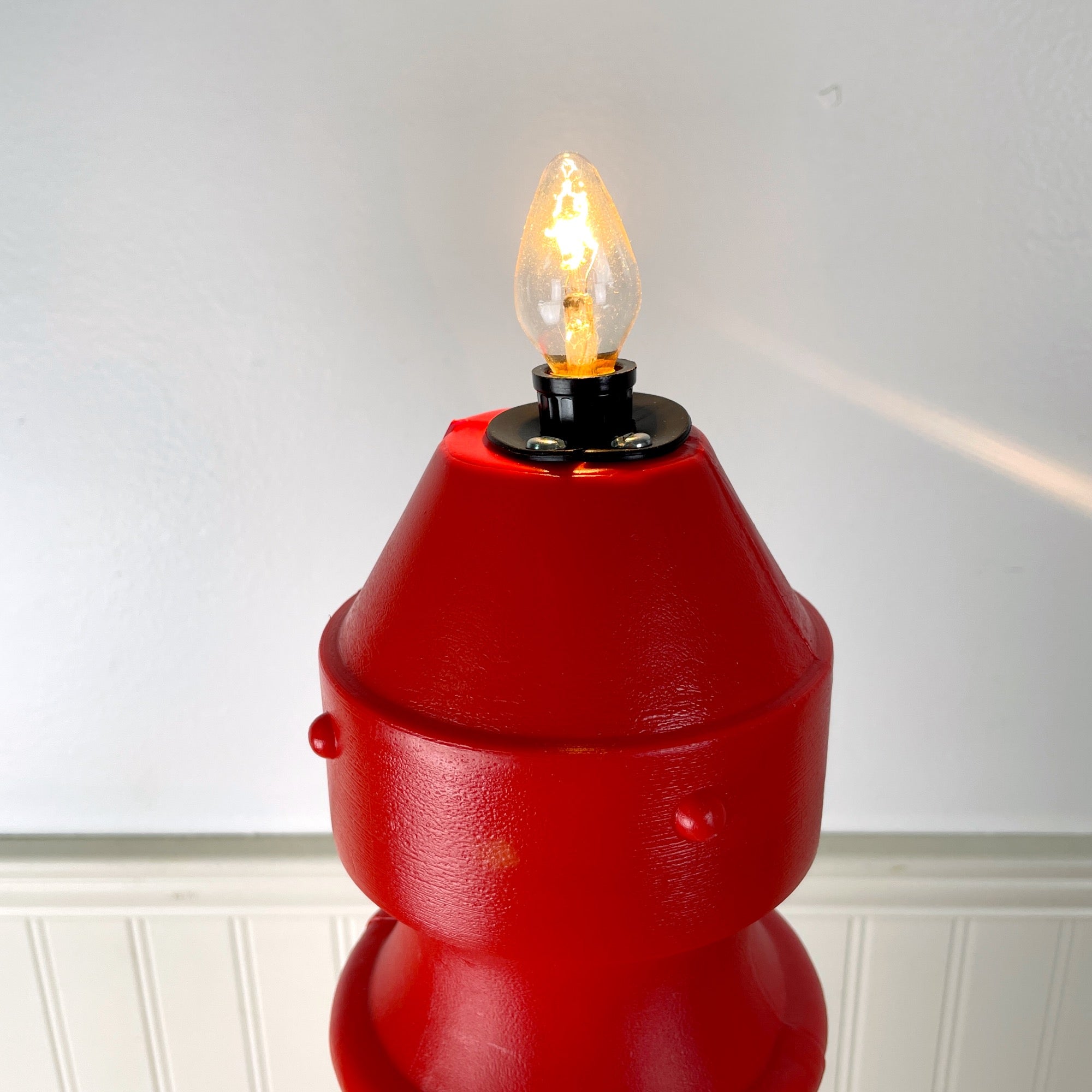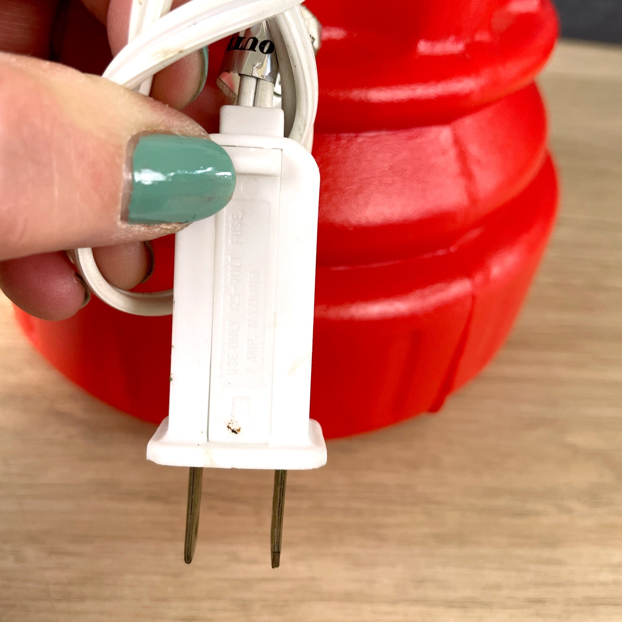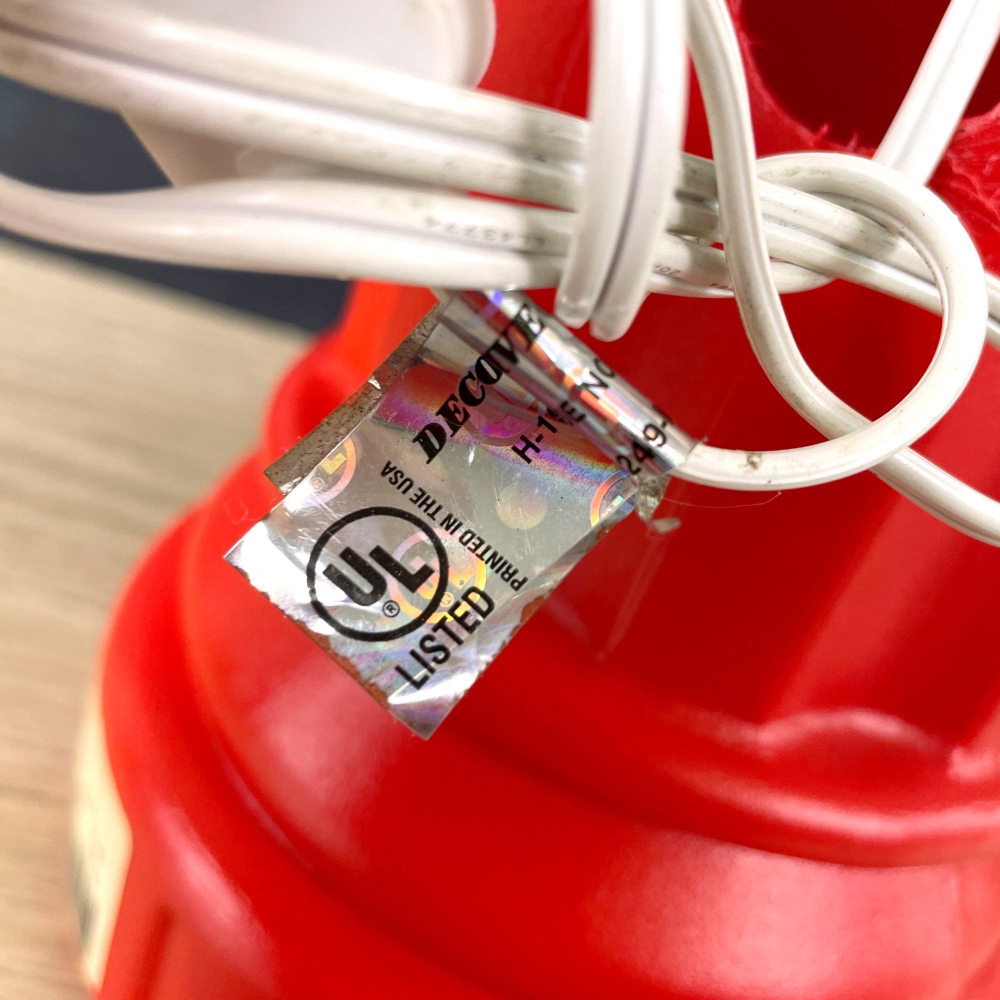 Vintage 1988 Union Products, Leominster, MA street lamp blow mold. White top with red column, yellow panels to show the light. Top unscrews to put in replacement bulbs. Plug is polarized and has a fuse, cord is nice and pliable.