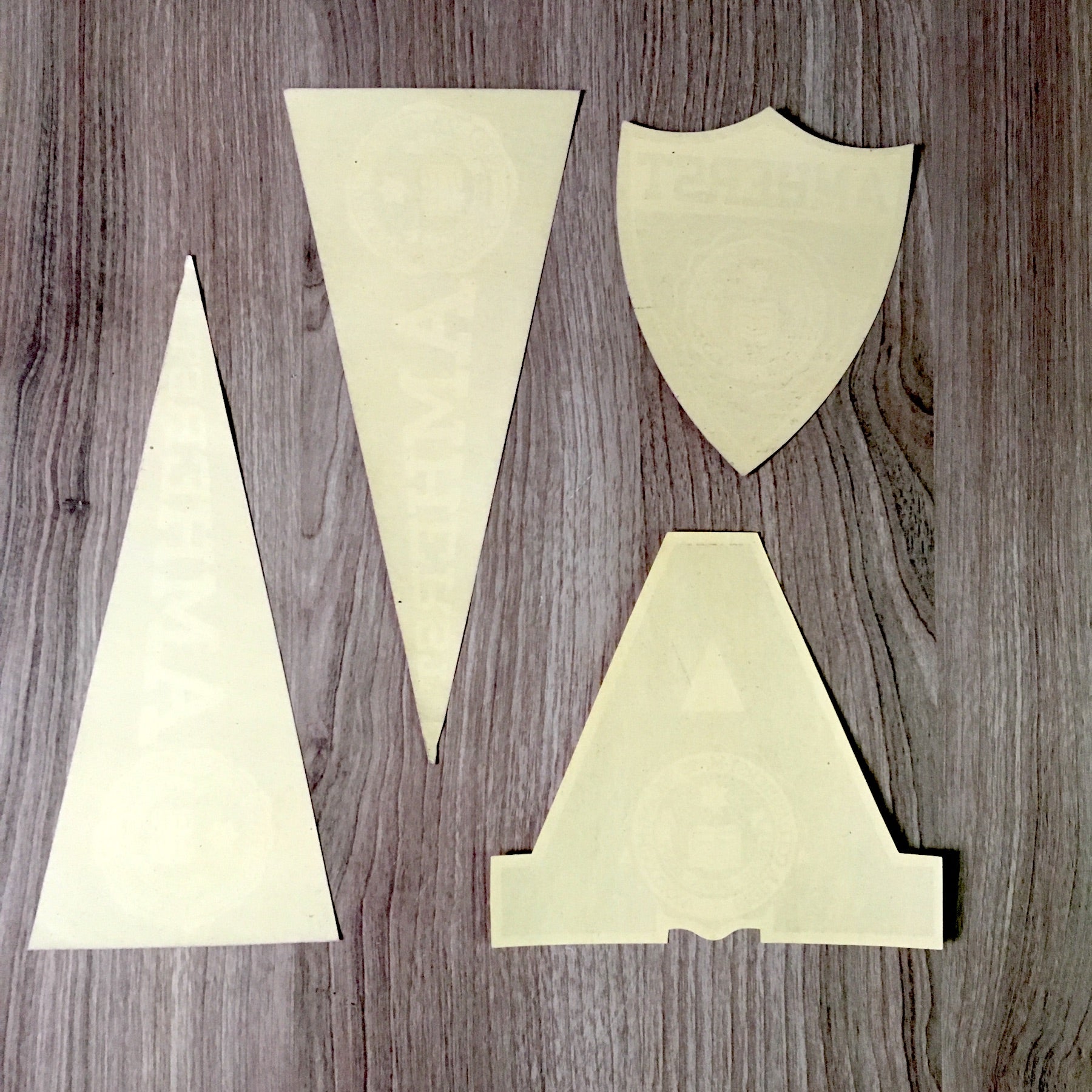 SIZE pennants are 7.75" long, shield is 3.5" diameter, letter A is 5 1/8" wide at base