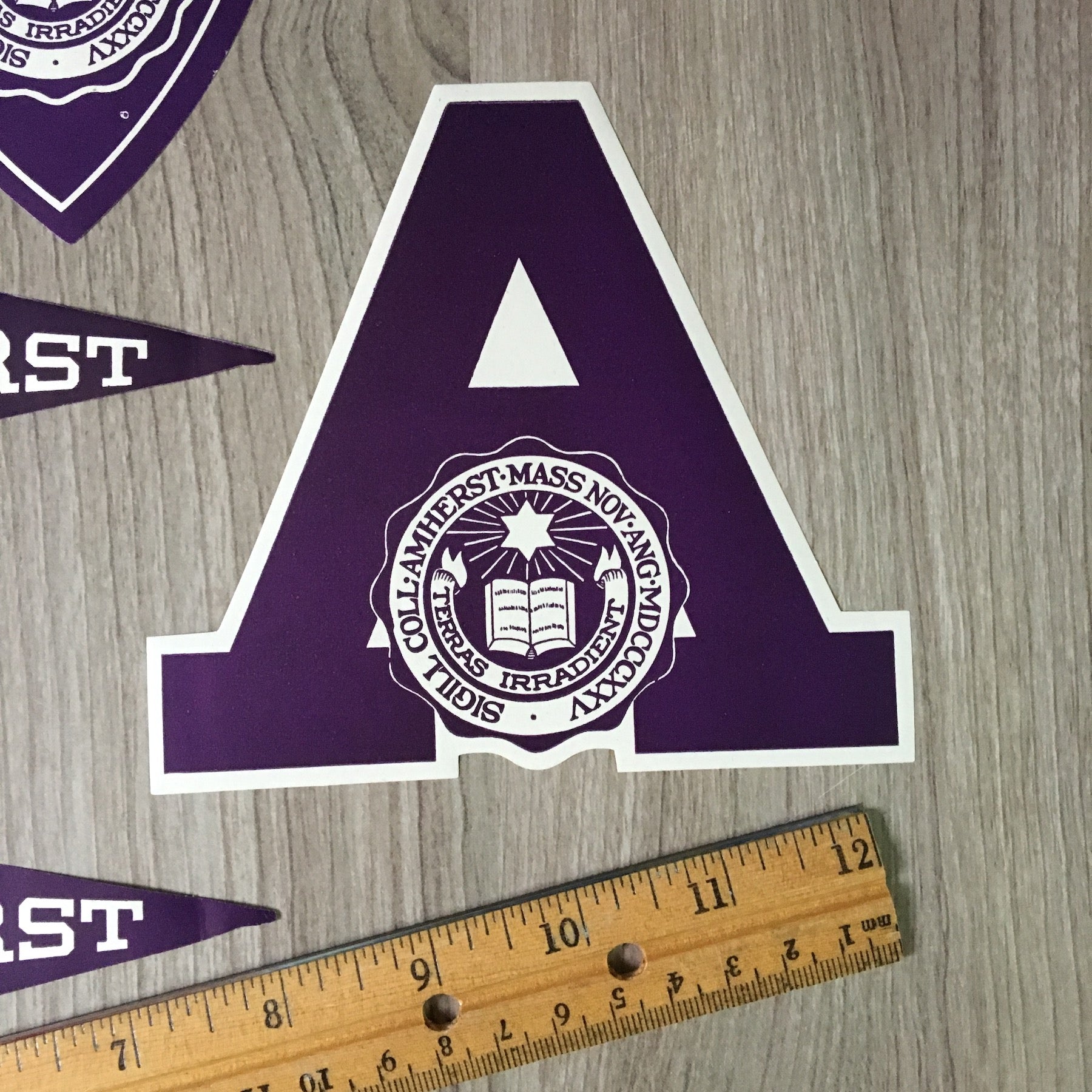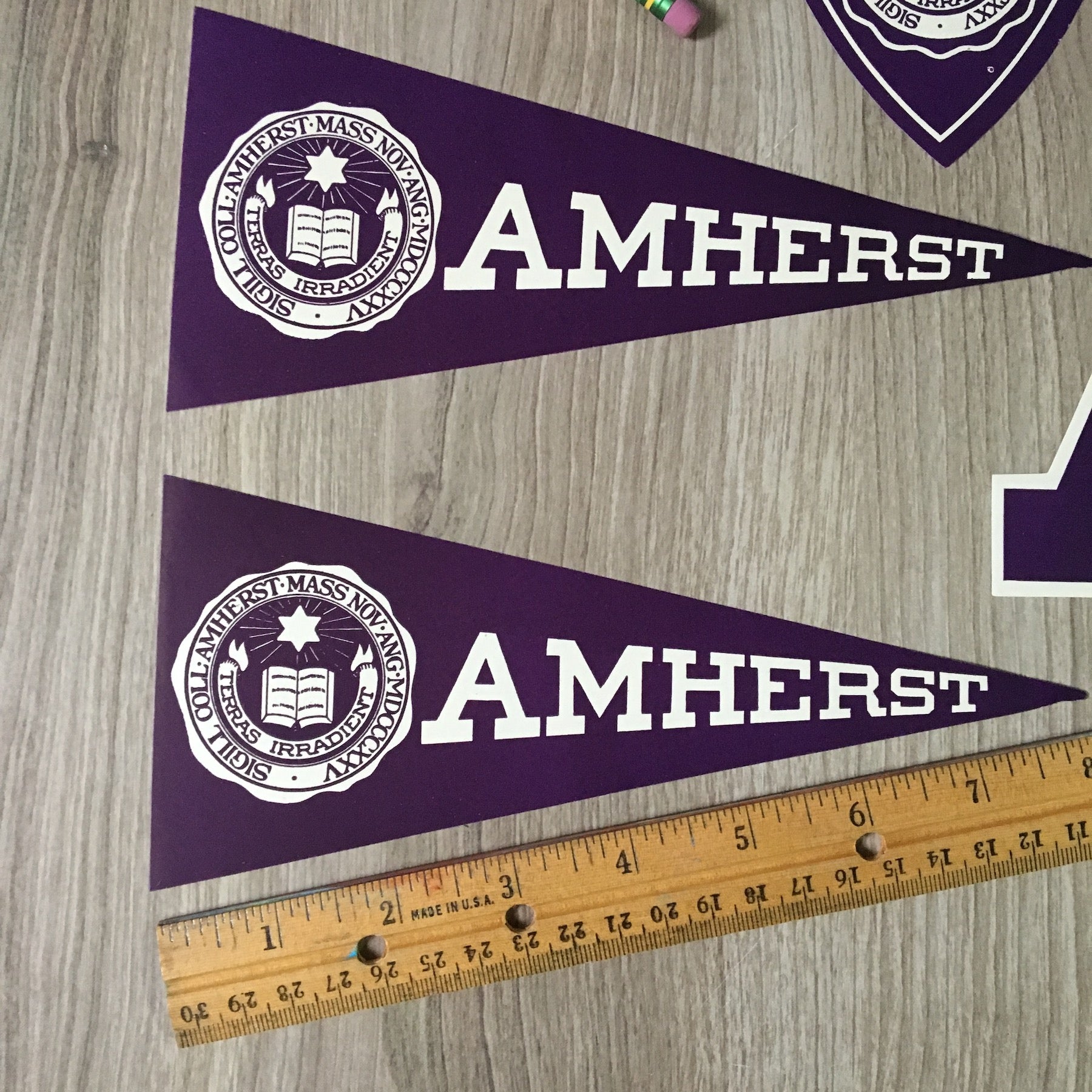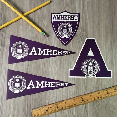 Vintage baggage sticker for the University of Massachusetts in Amherst, MA. Two Pennants, one letter A and one shield shaped sticker that would have been used on a trunk. Moisture activated adhesive on the back. Deep plum on cream paper. Likely manufactured by the Chicago Pennant Company.
