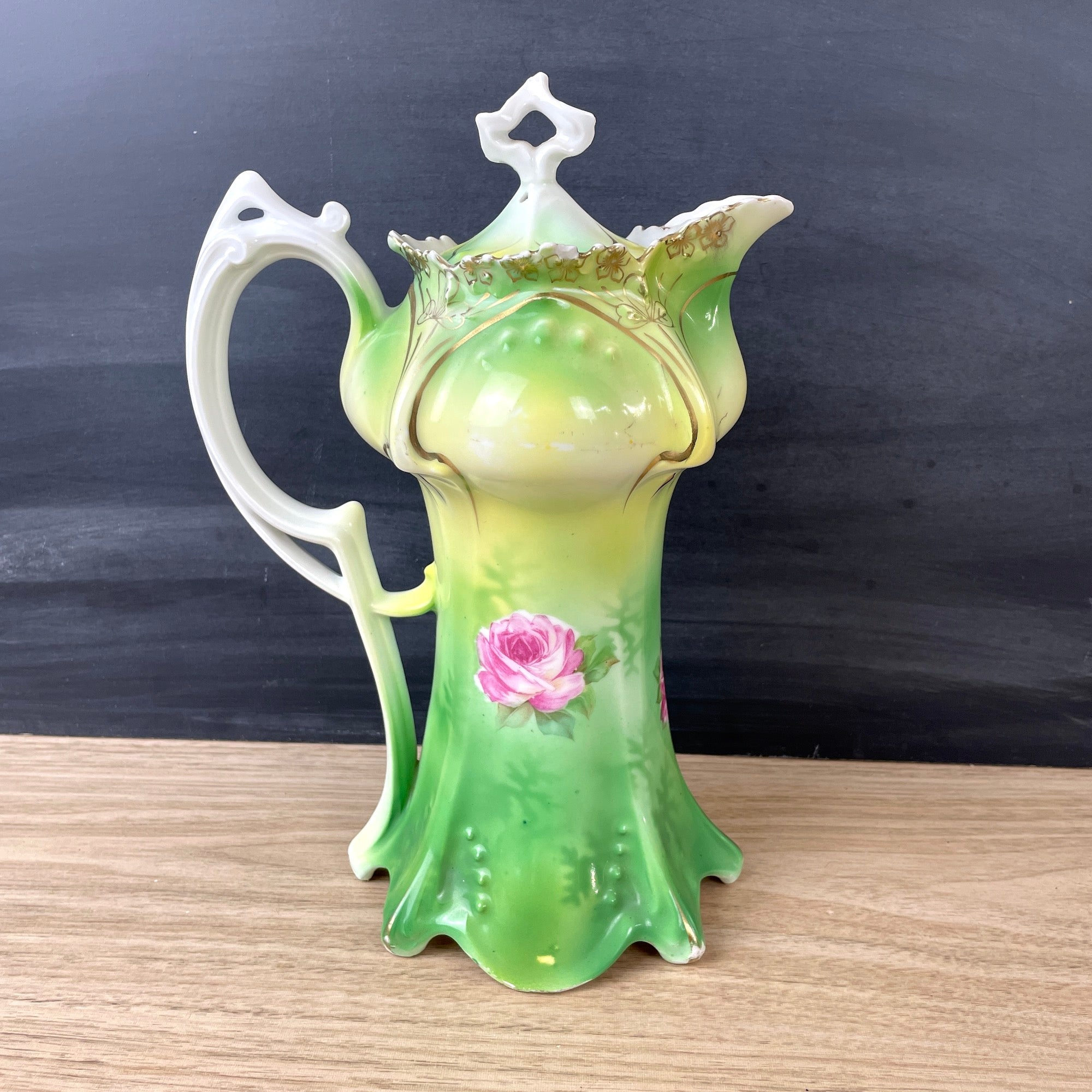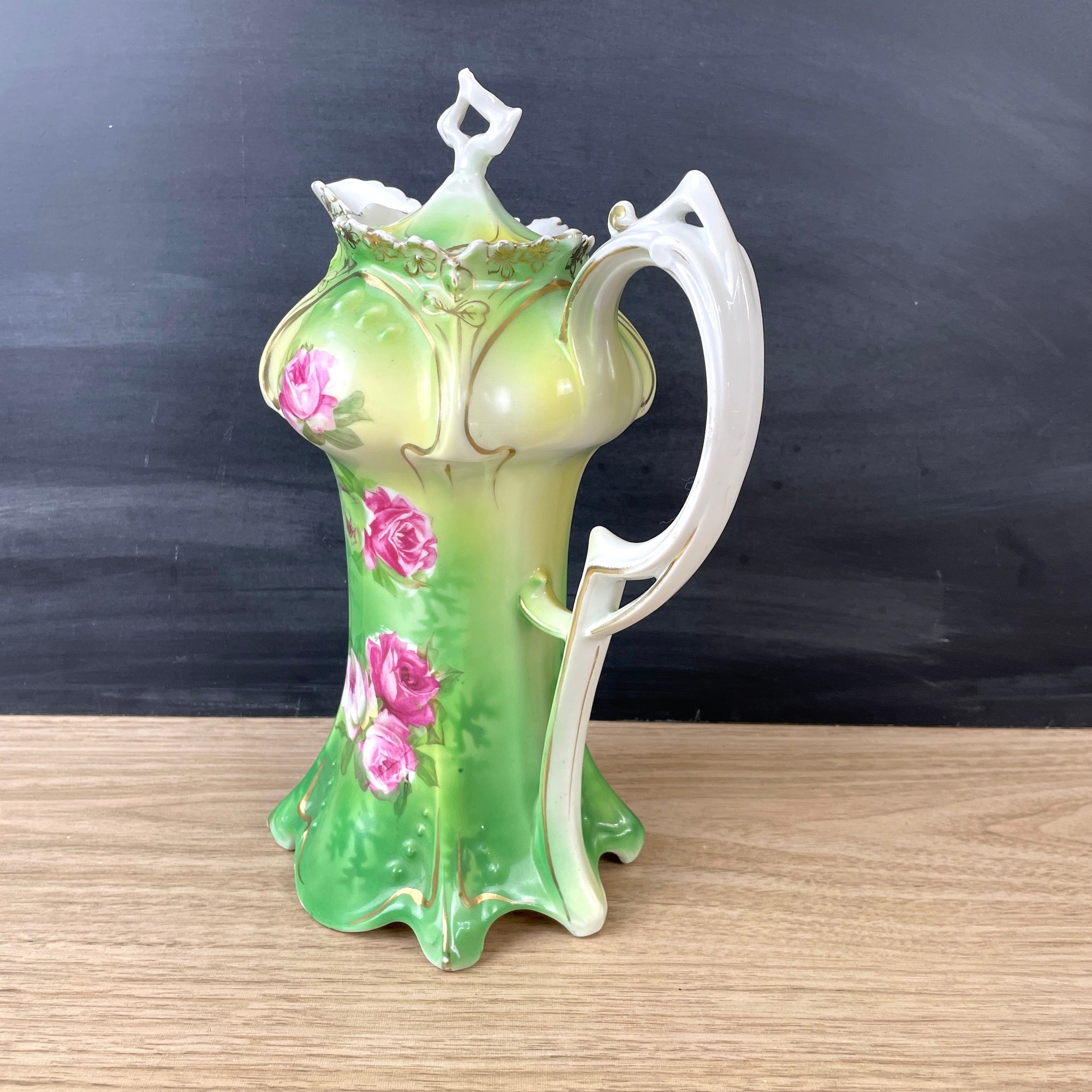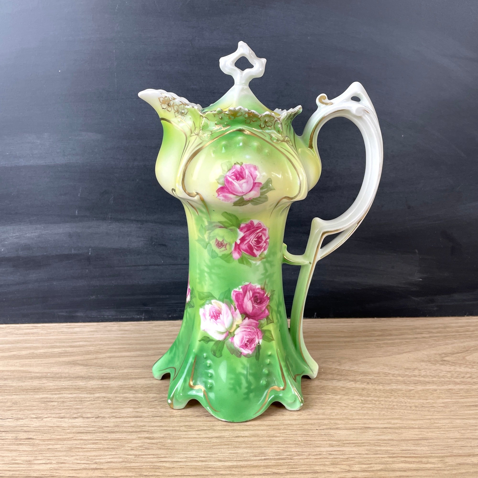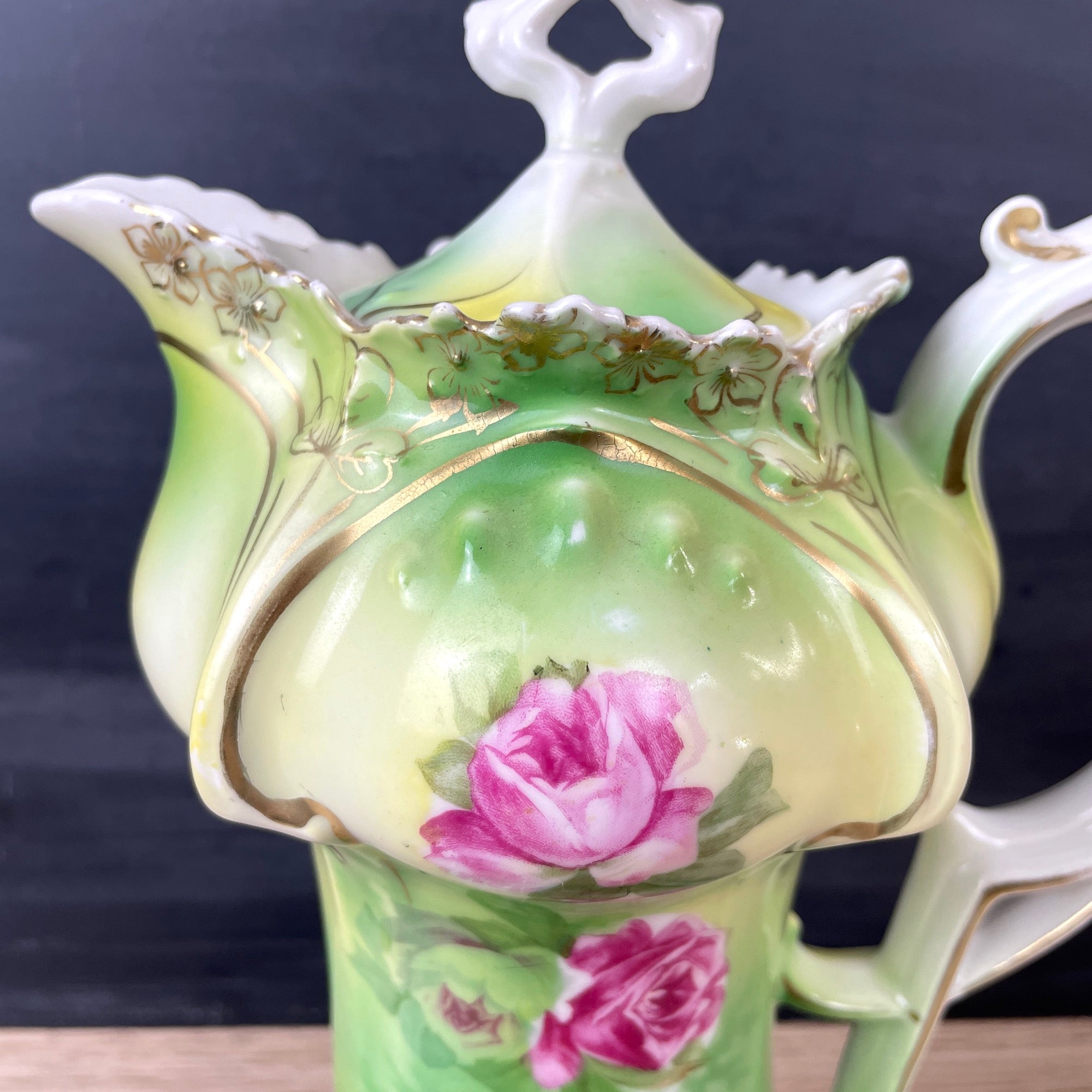 Ornate Victorian chocolate pot, marked R. S. Prussia, made by Erdmann Schlegelmilch in Germany. Art nouveau style handle and delicately scalloped rim. Floral detail on the lid. Painted in a green that does from mint to chartreuse. Decal roses. Gold painted details. From around 1900.