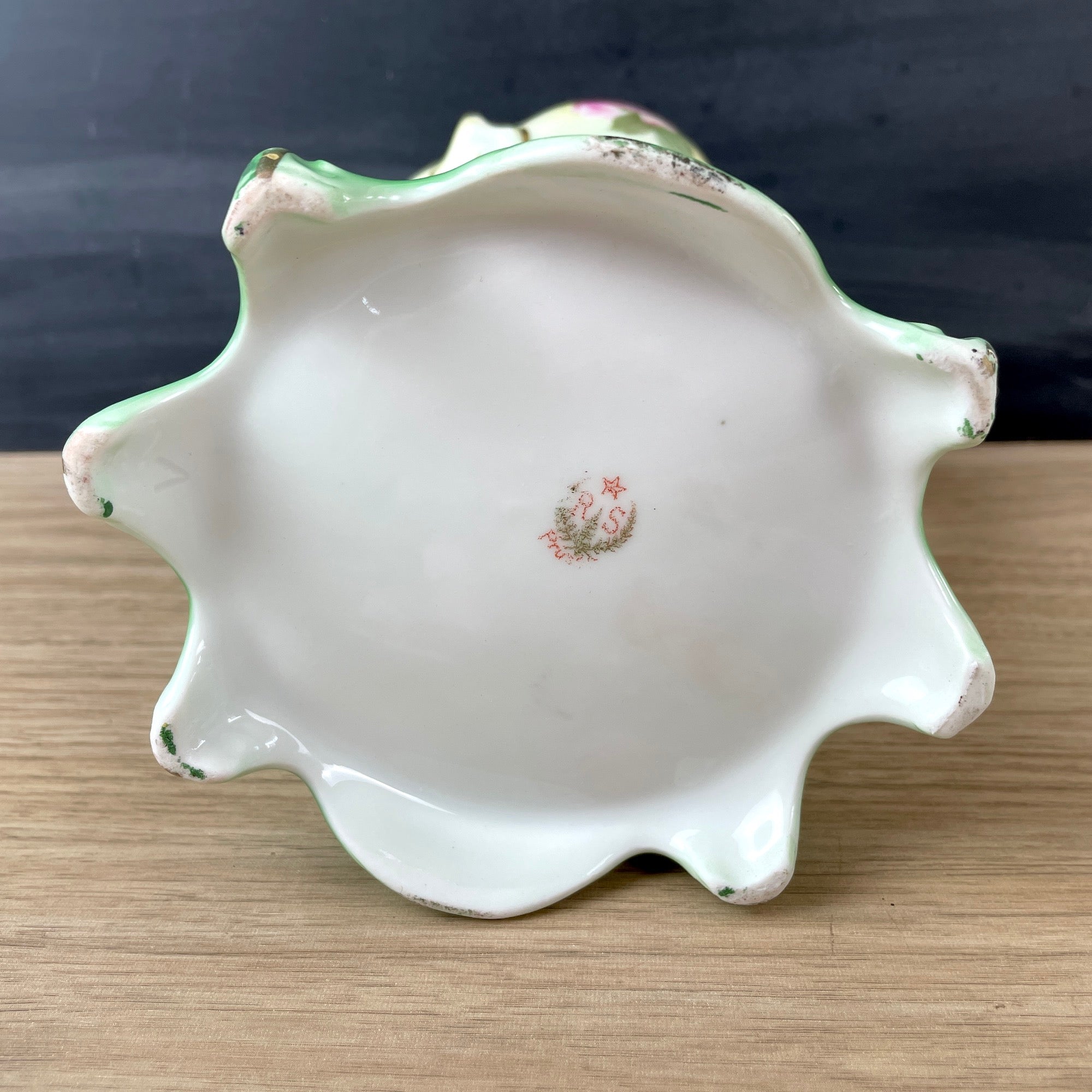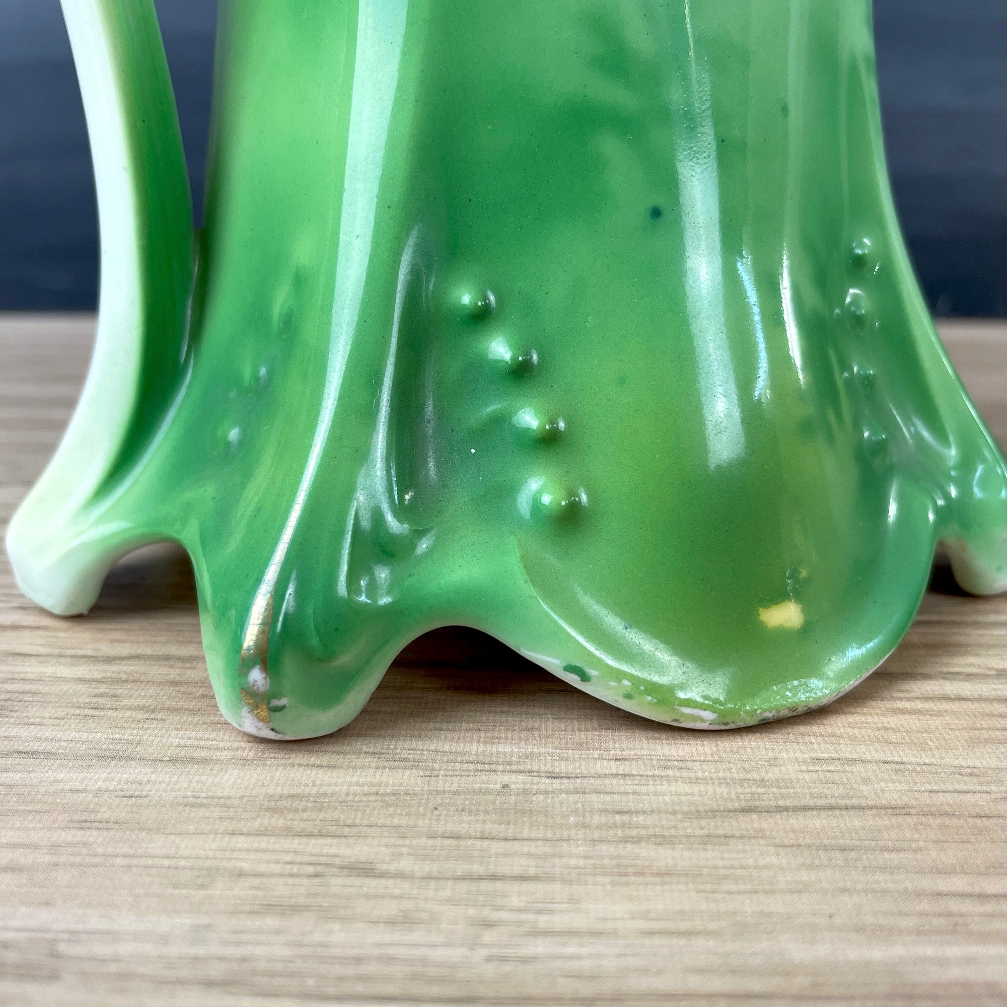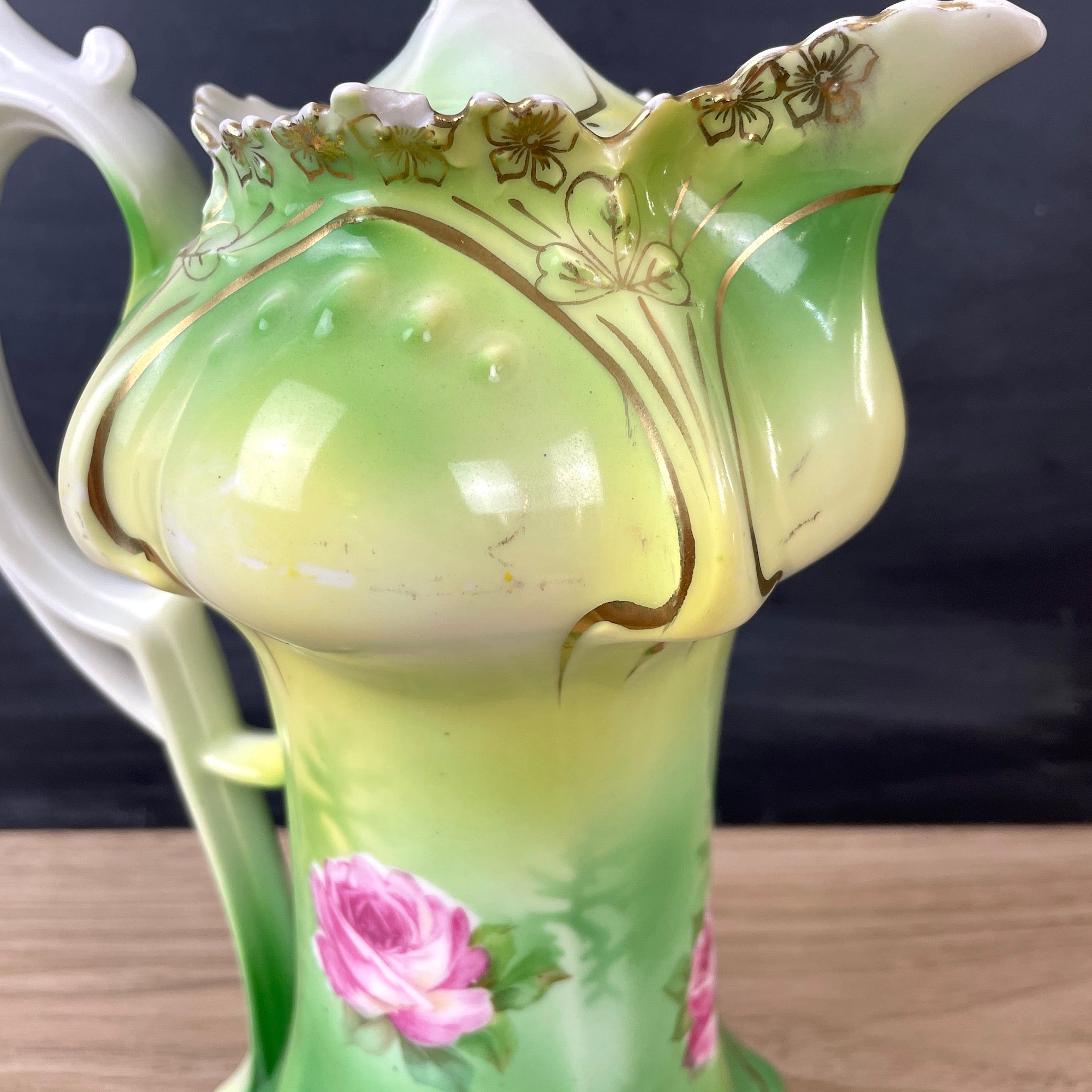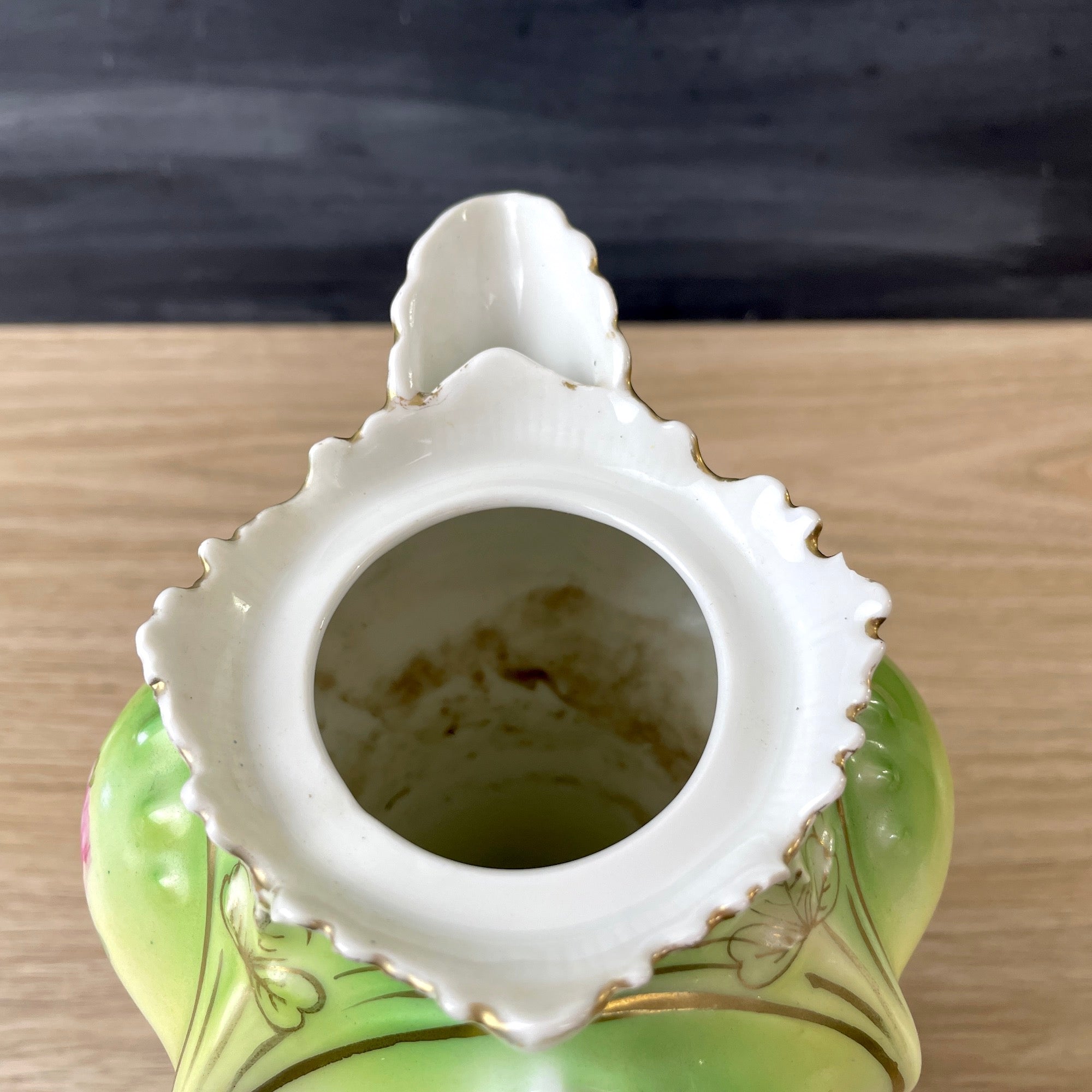 Ornate Victorian chocolate pot, marked R. S. Prussia, made by Erdmann Schlegelmilch in Germany. Art nouveau style handle and delicately scalloped rim. Floral detail on the lid. Painted in a green that does from mint to chartreuse. Decal roses. Gold painted details. From around 1900.