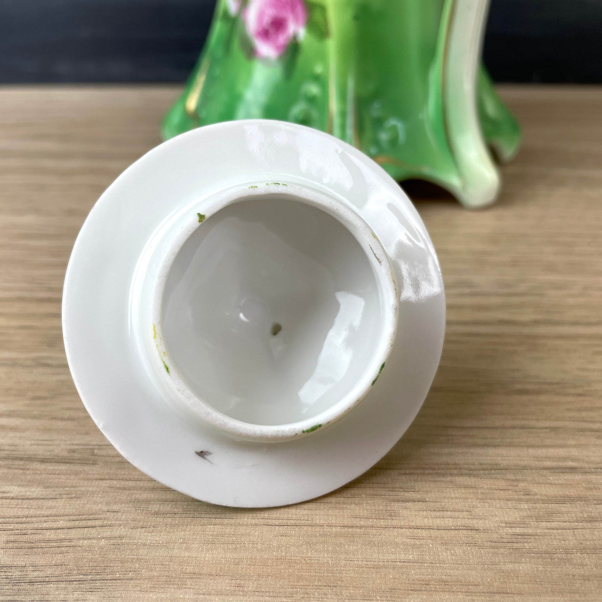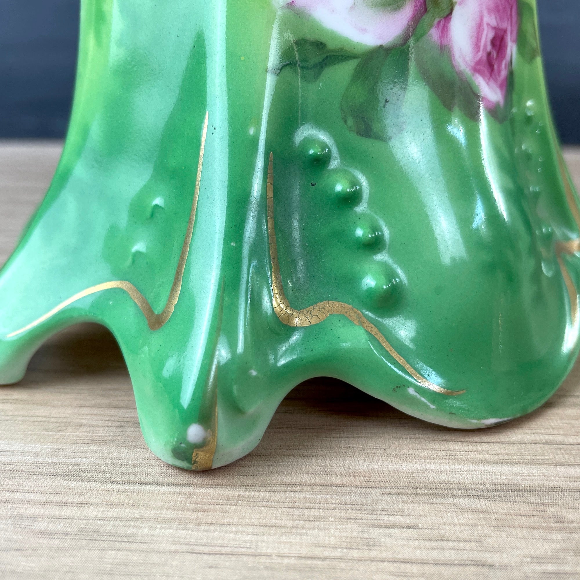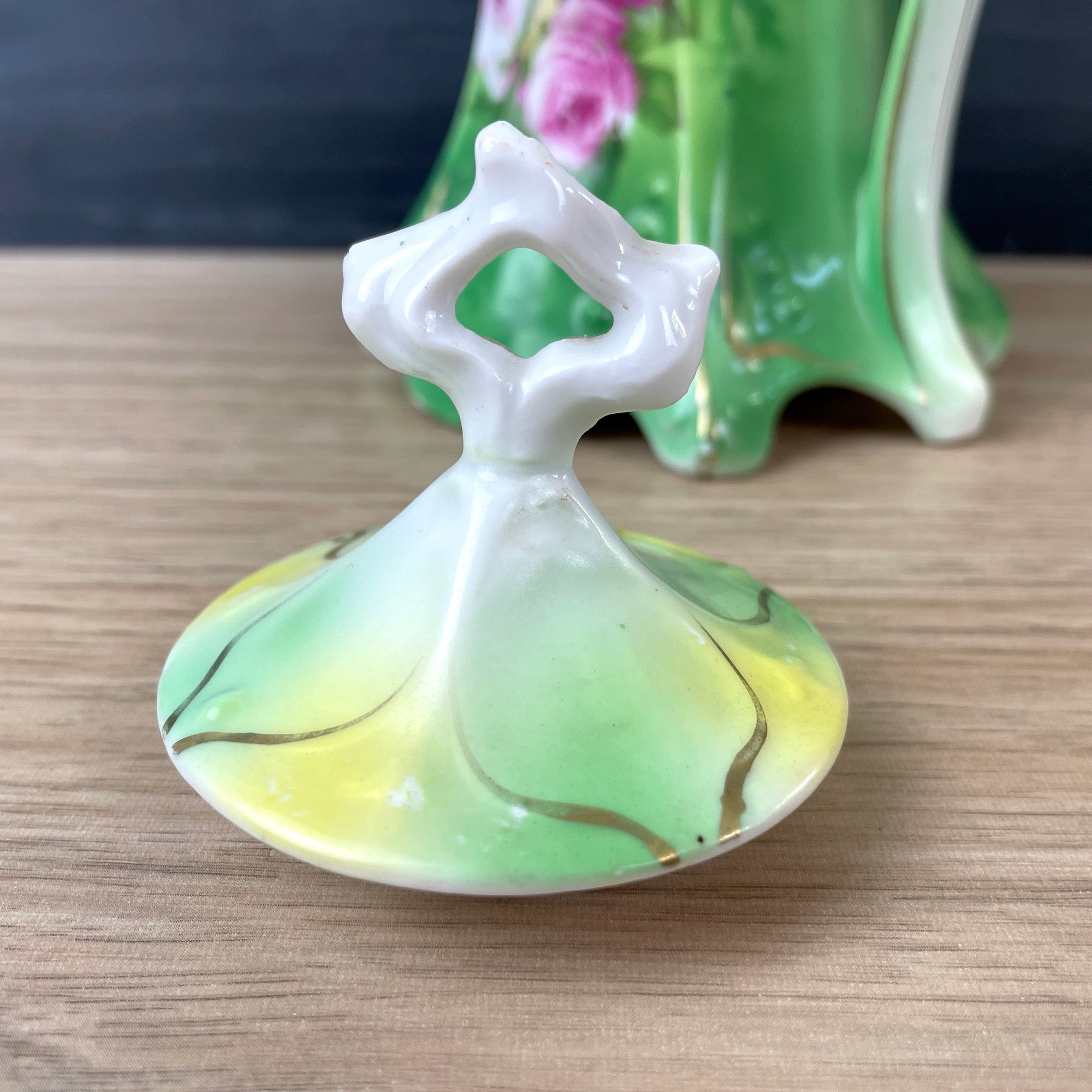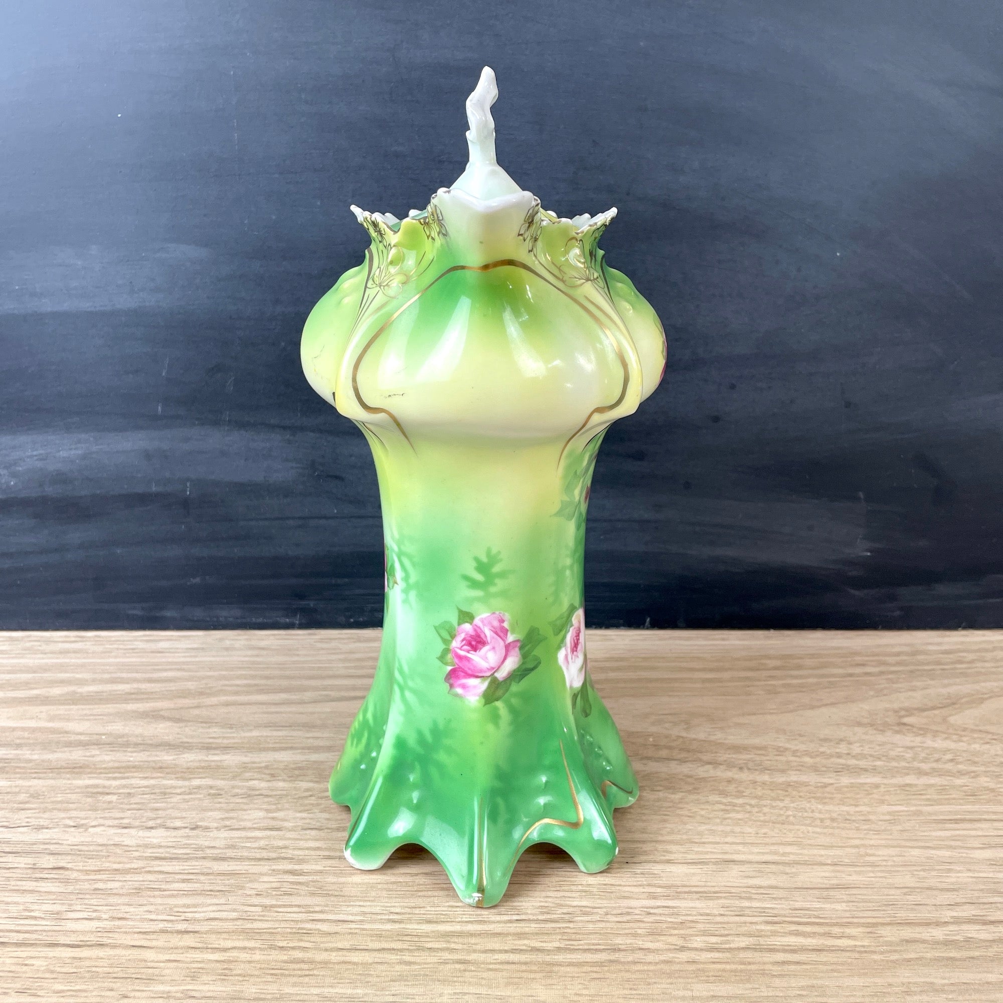 Ornate Victorian chocolate pot, marked R. S. Prussia, made by Erdmann Schlegelmilch in Germany. Art nouveau style handle and delicately scalloped rim. Floral detail on the lid. Painted in a green that does from mint to chartreuse. Decal roses. Gold painted details. From around 1900.