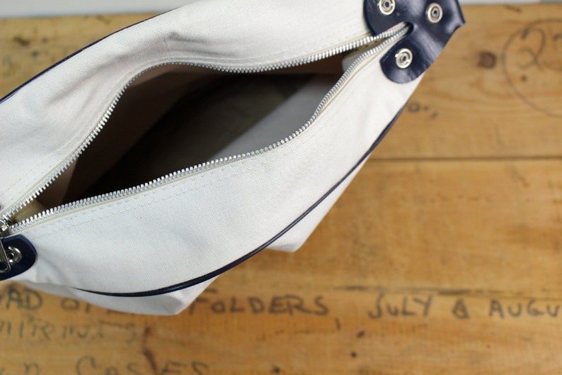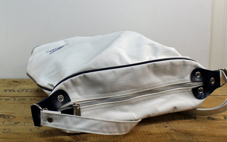 Sling this Sullivan Travel Service bag over your shoulder and away you go. White cloth bag featuring dark blue trim & logo, adjustable shoulder strap, and a front slip in pocket. Metal zipper. 3 ft strap can be worn cross body or over the shoulder.