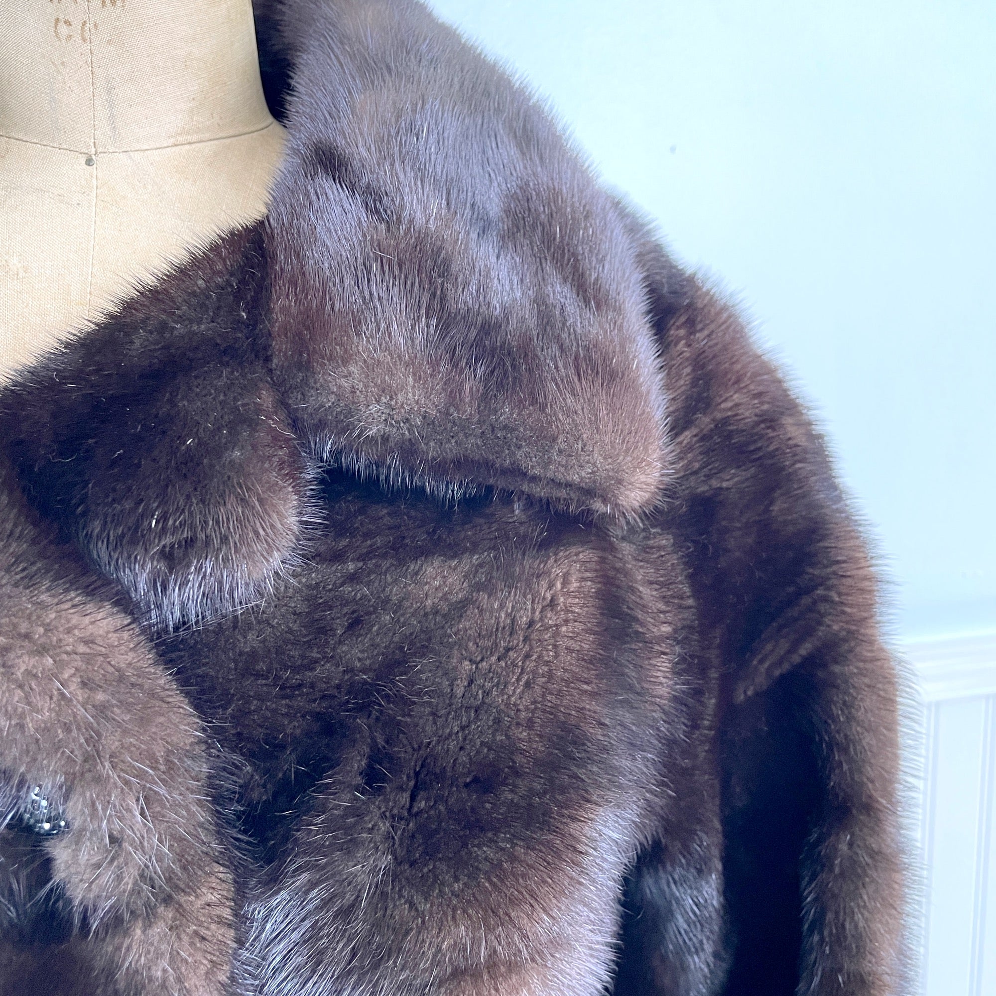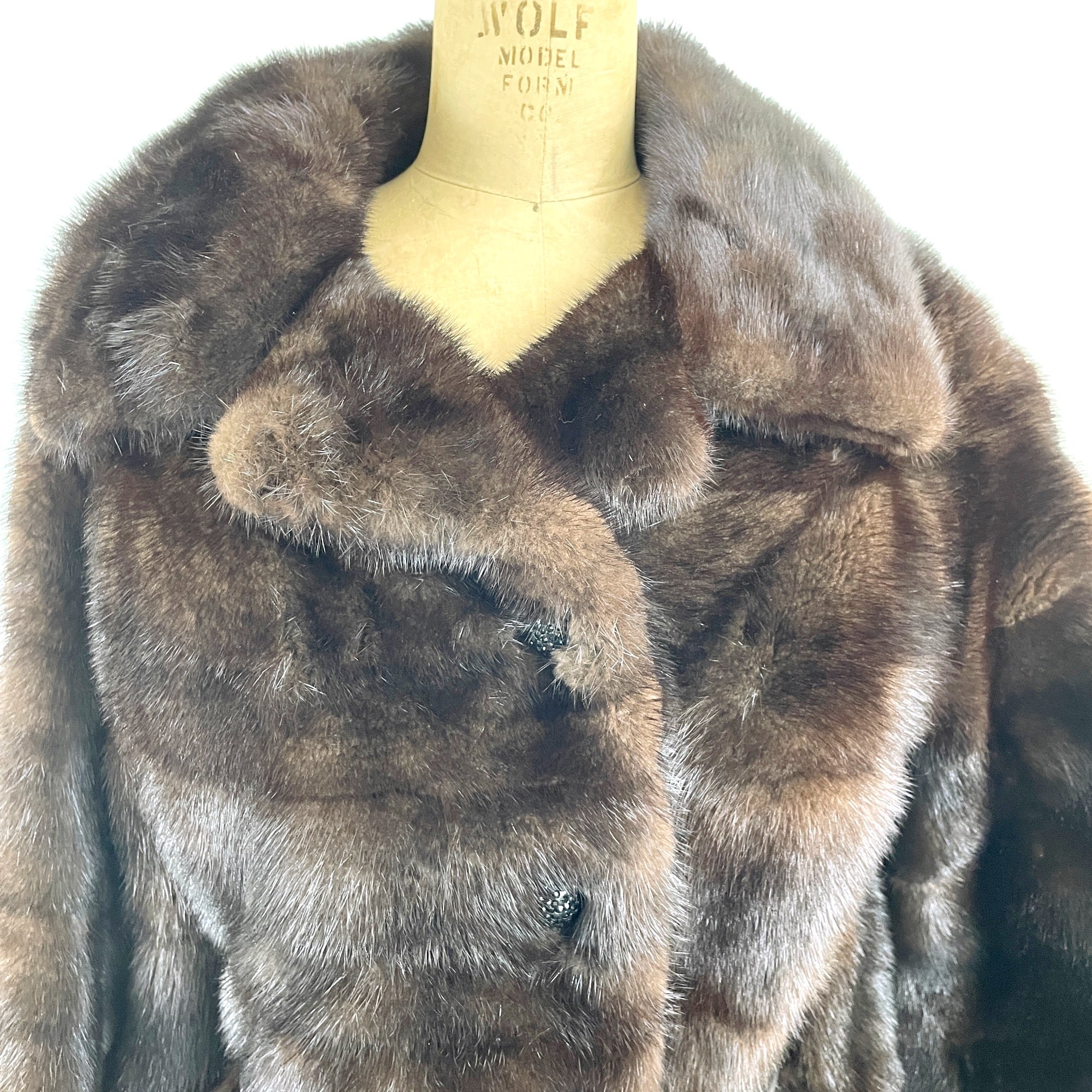 Vintage dark brown mink jacket with jeweled buttons and belt. Front pockets. Notched collar. Manufactured under fair labor practices per label. Leather belt. Black satin lining.