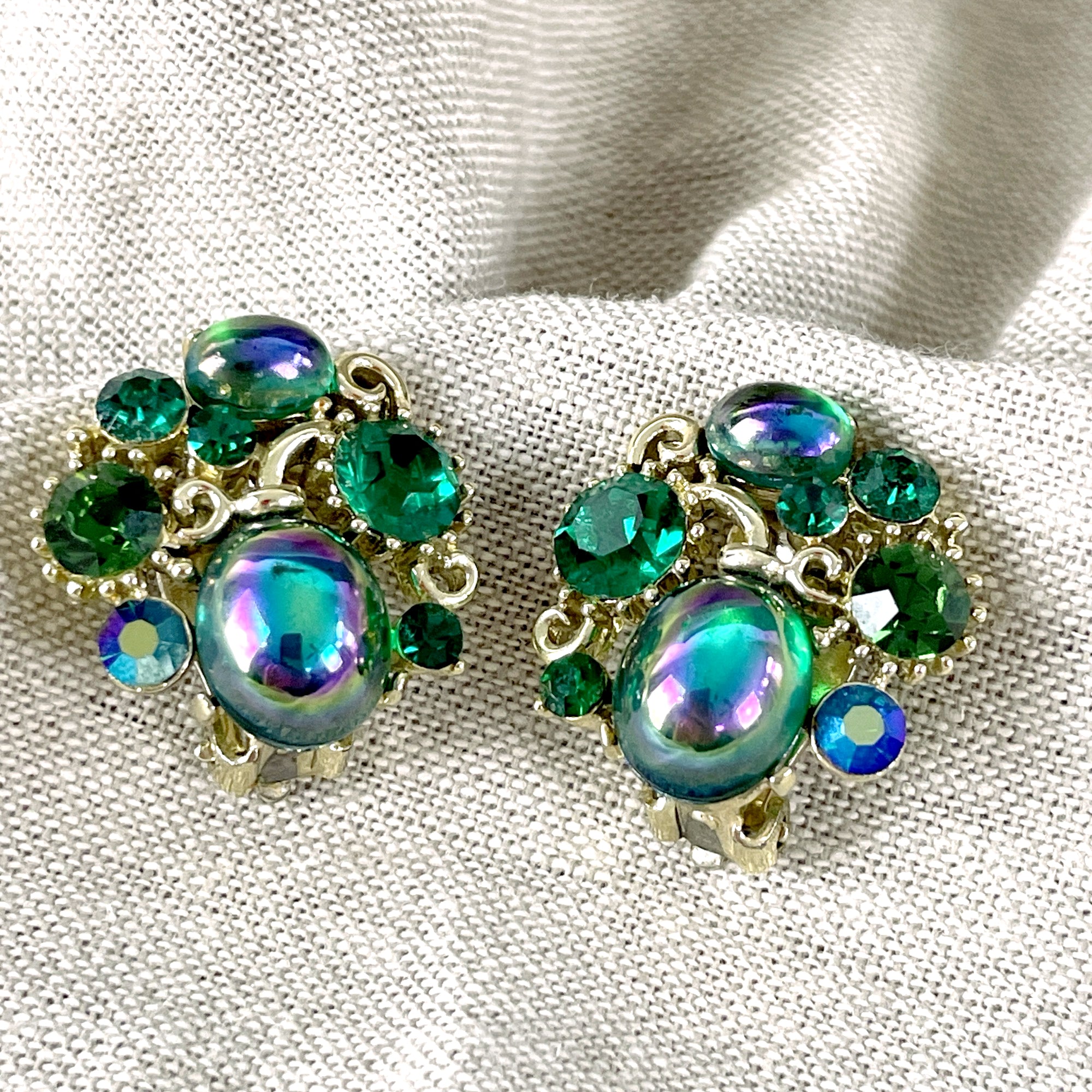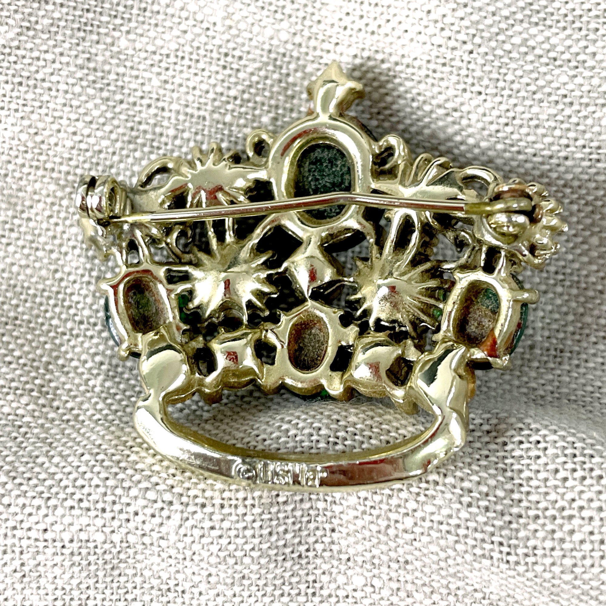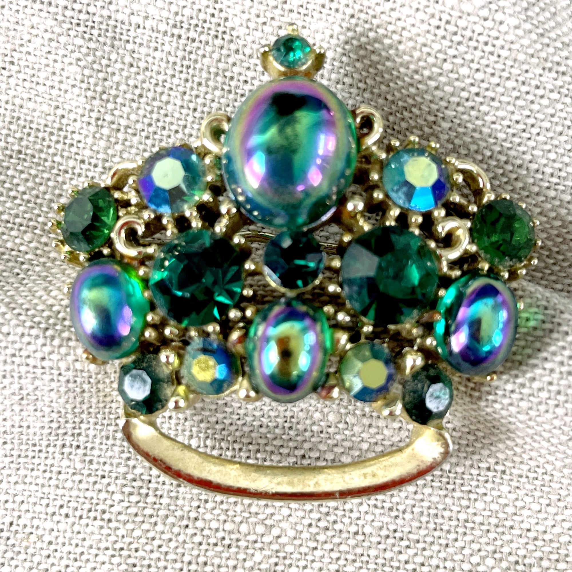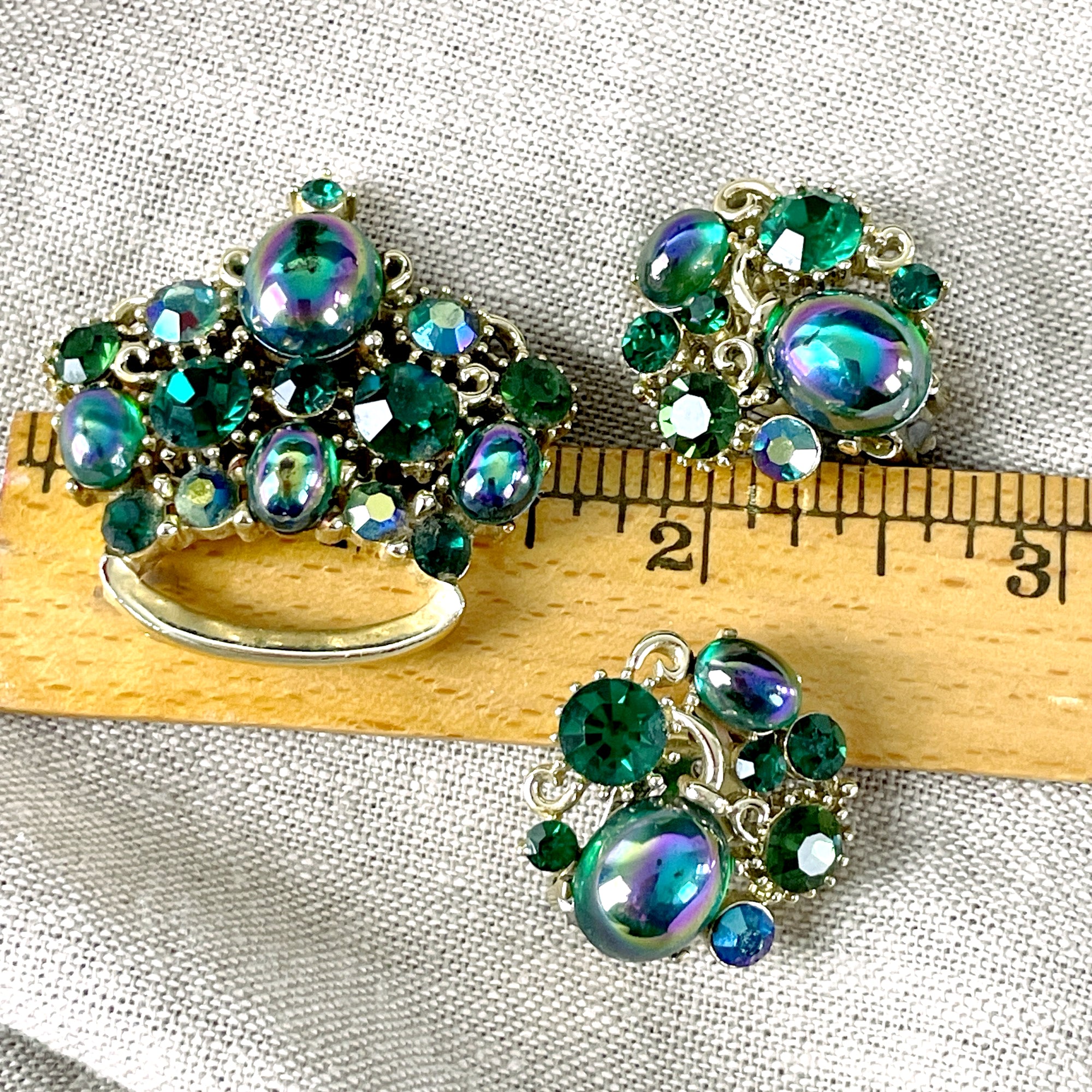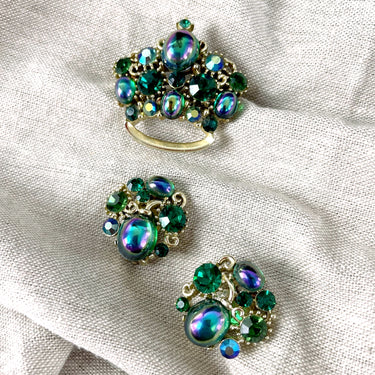Lovely Lisner crown brooch and clip on earrings with green iridescent cabochons and faceted crystals in a goldtone setting. From the 1960s.