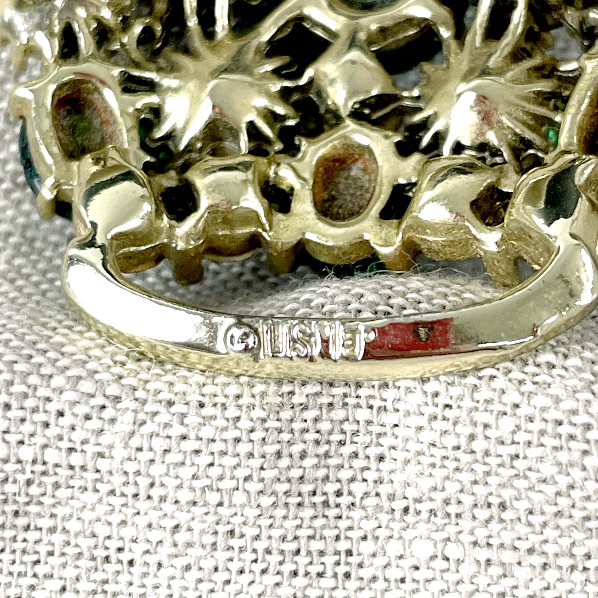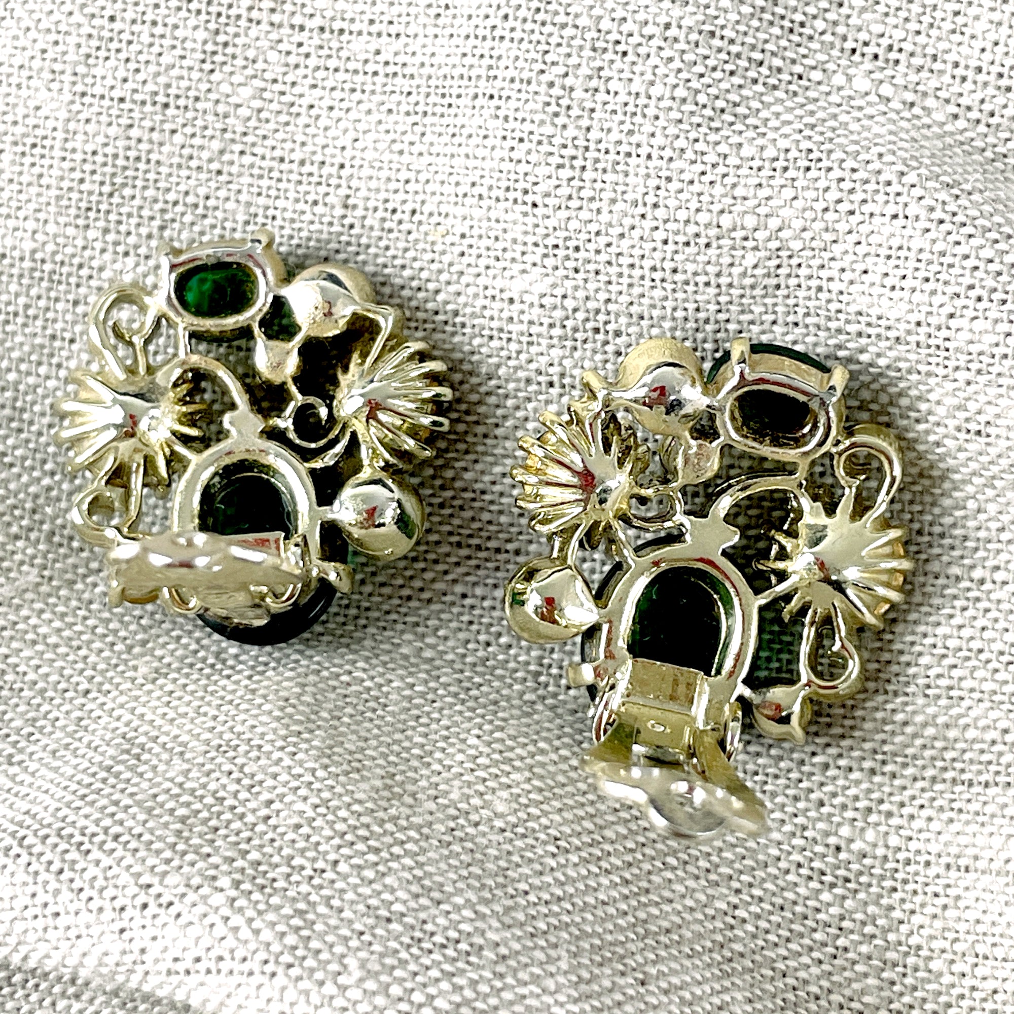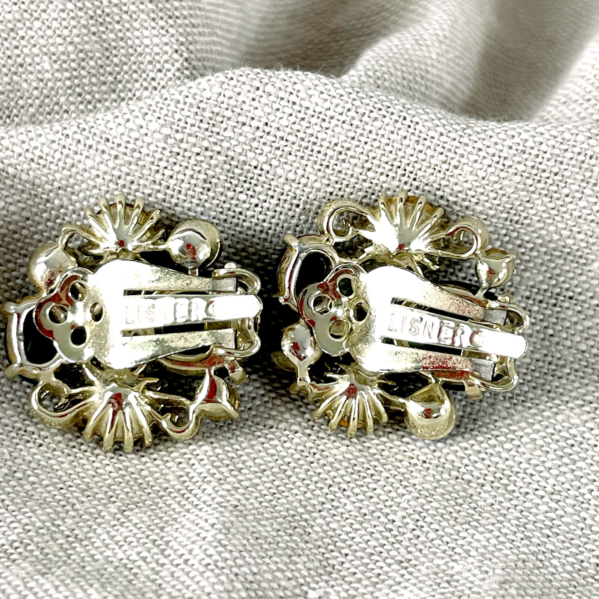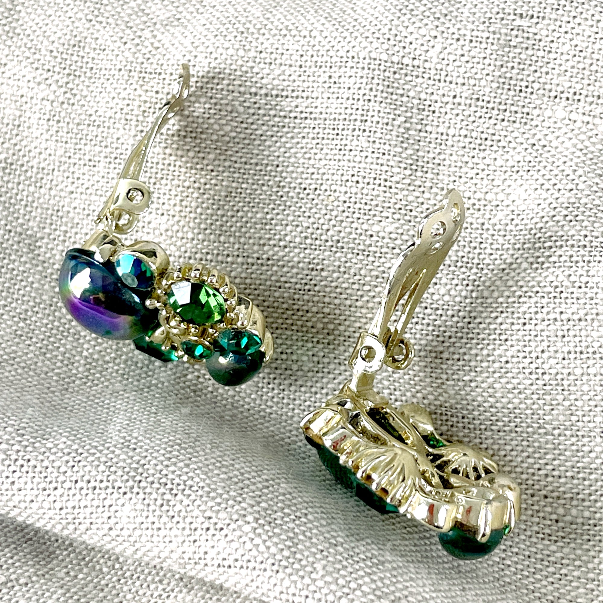 Lovely Lisner crown brooch and clip on earrings with green iridescent cabochons and faceted crystals in a goldtone setting. From the 1960s.