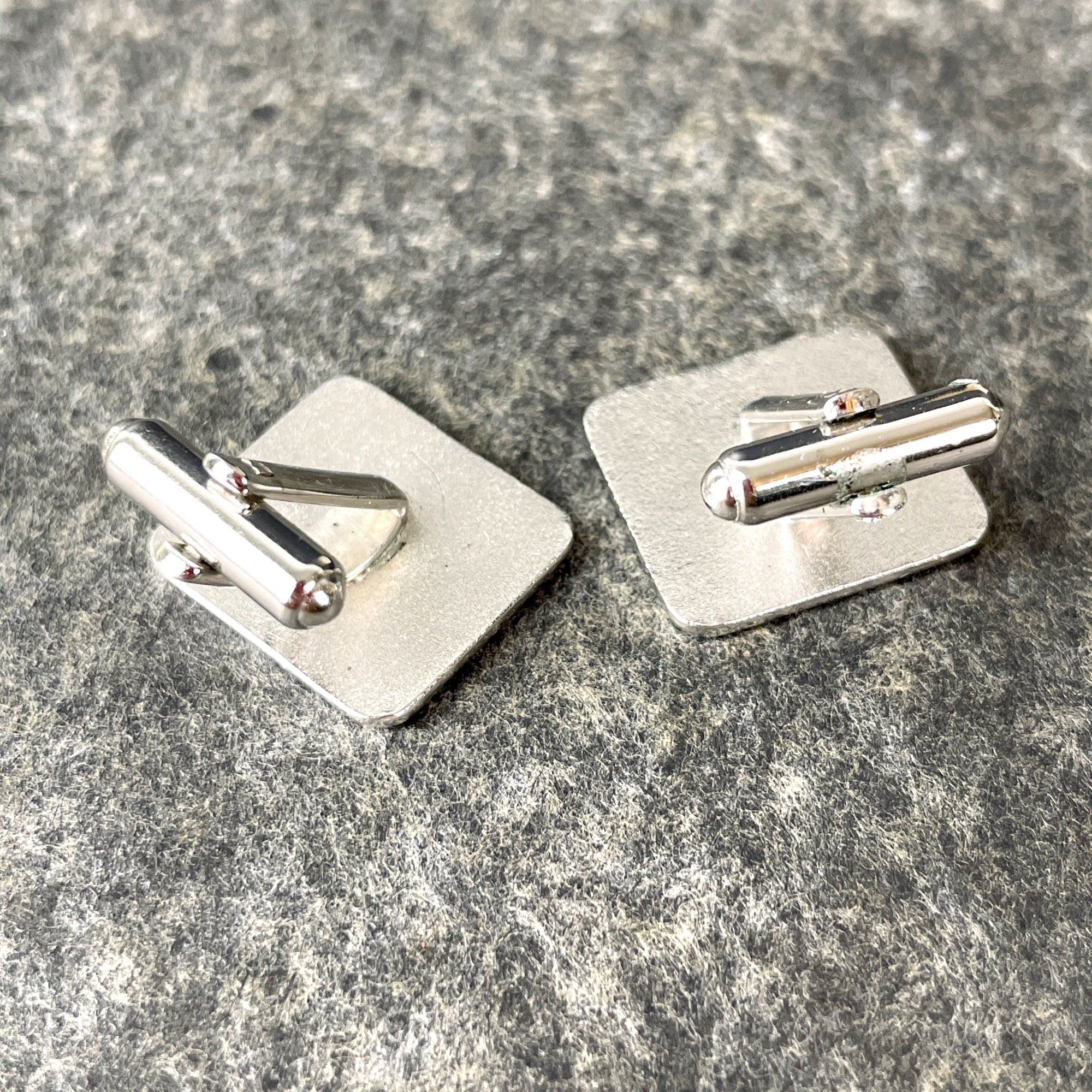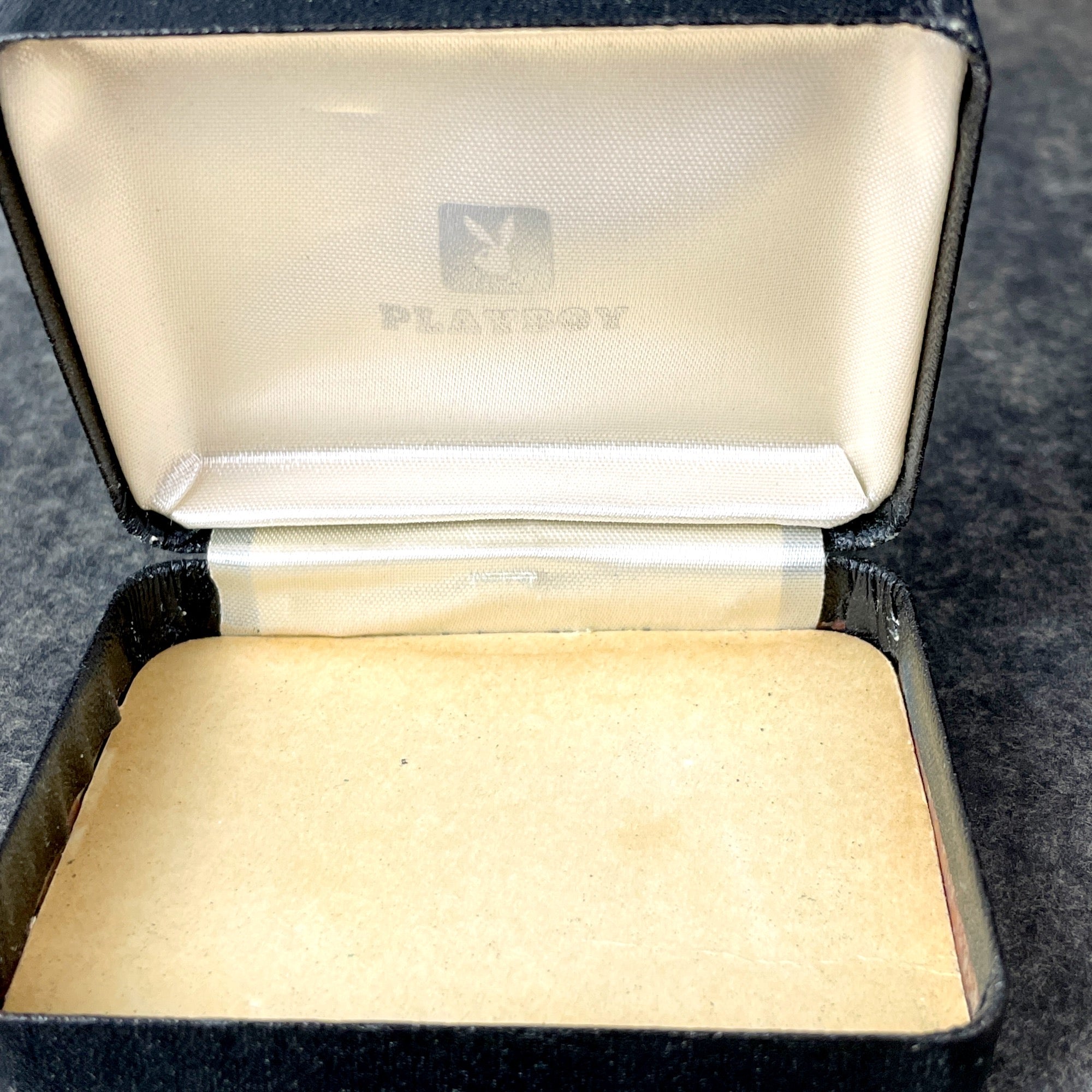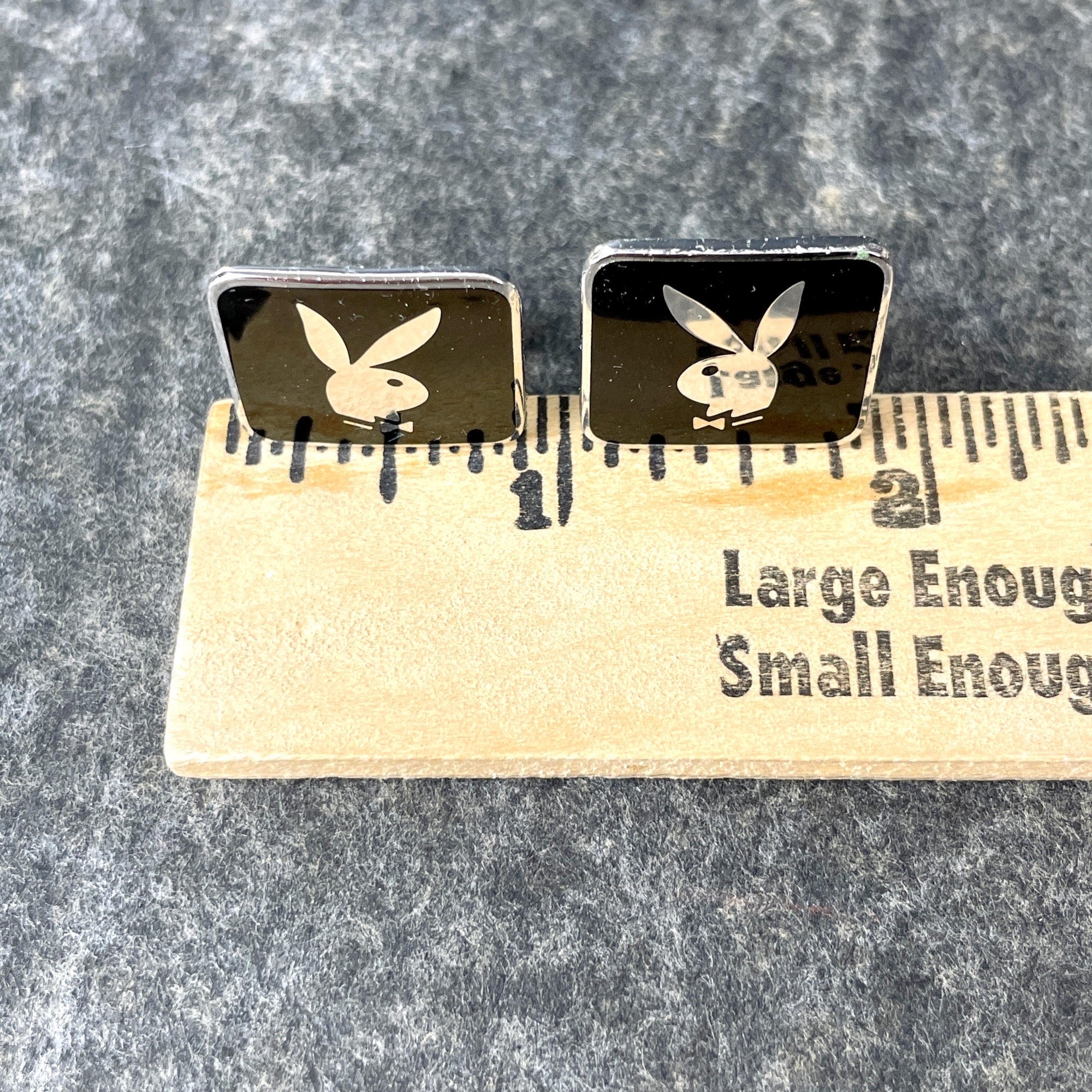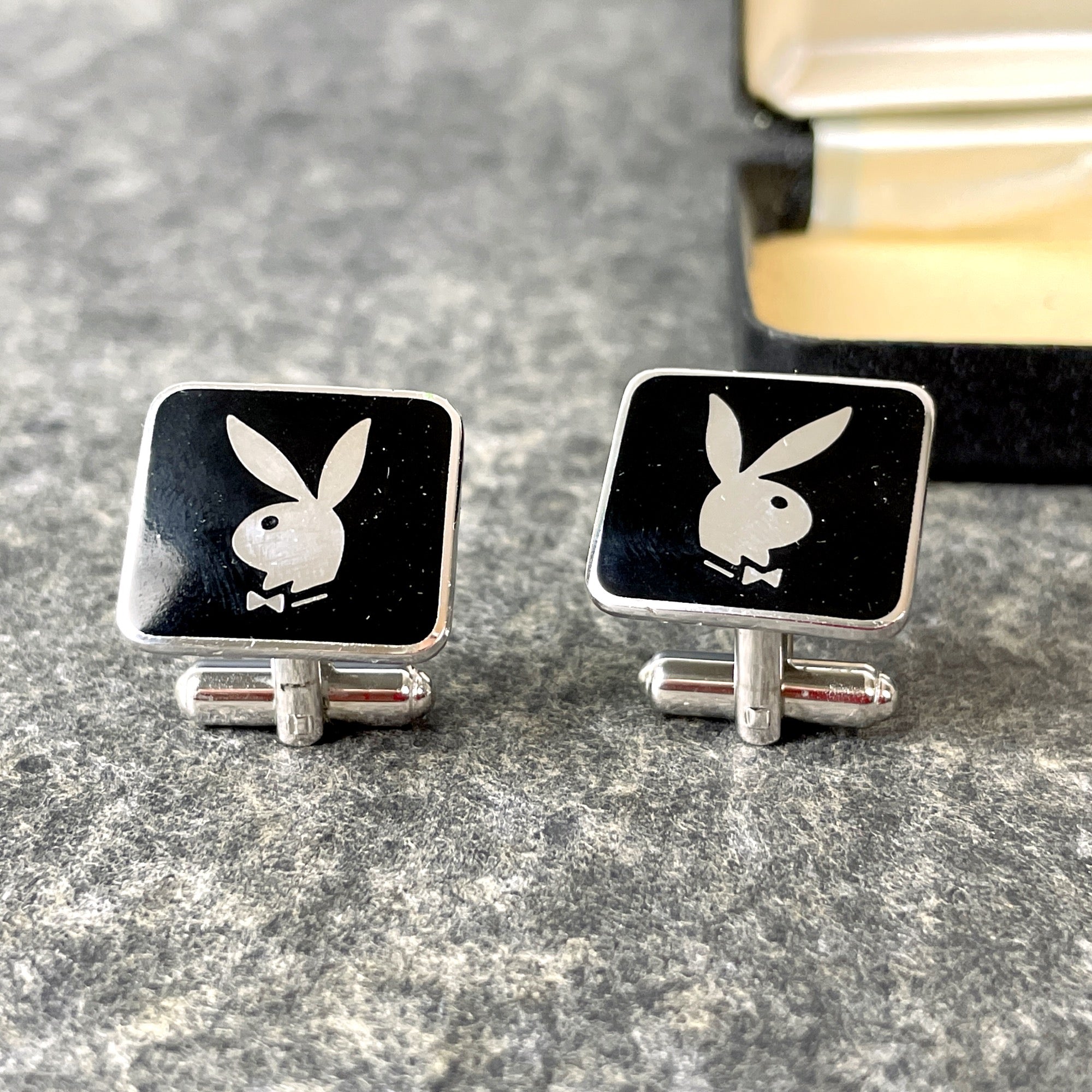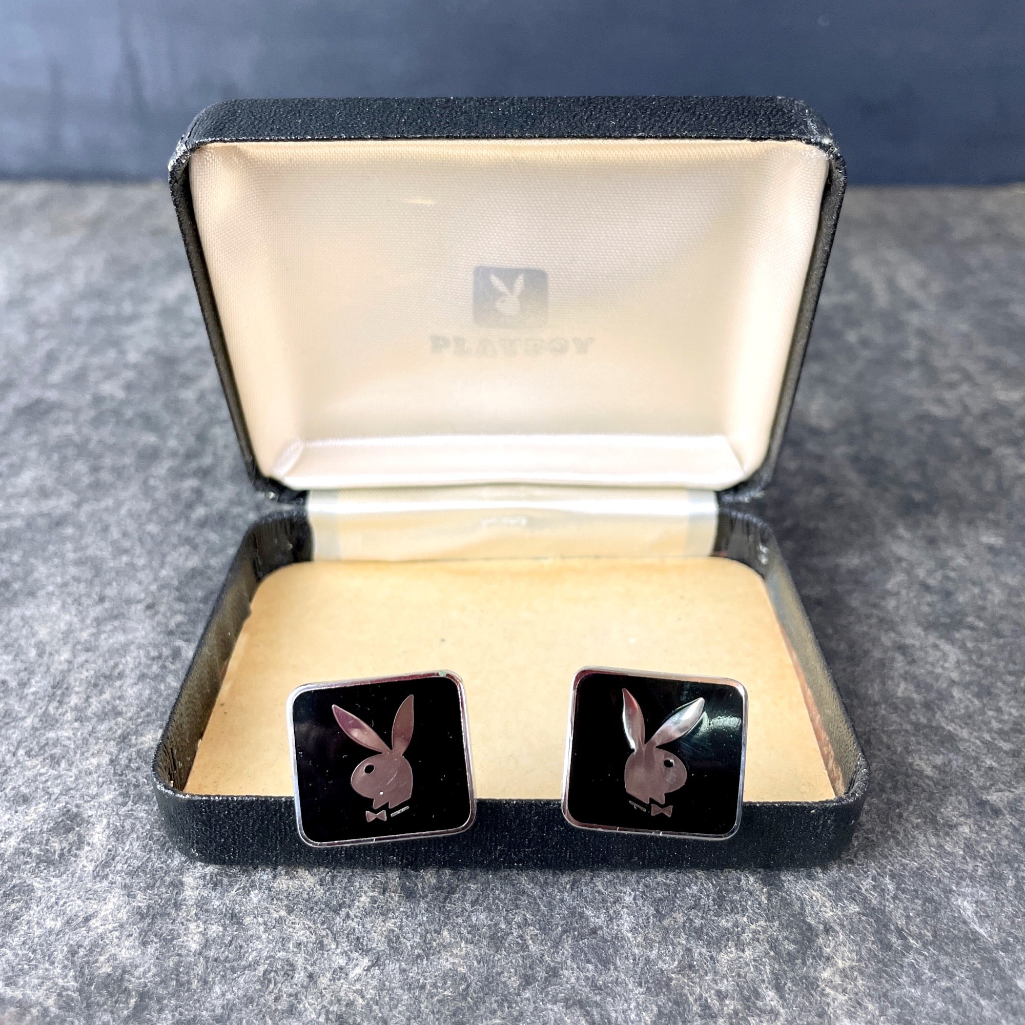 Vintage 1980s Playboy cufflinks in black and silver. Includes original box, but insert is missing. Interesting pieces of vintage from an entirely different era.