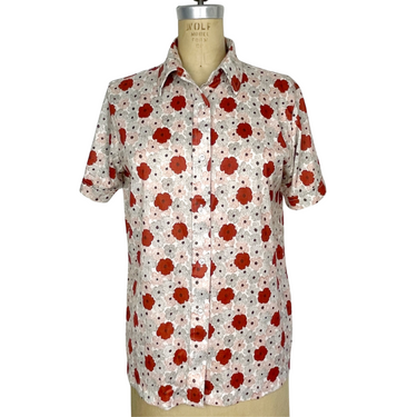 Vintage 1970s Sears blouse in a striking rust and brown poppy floral print. Made in Korea from lightweight 100% polyester, this blouse features a classic collared neckline, short cuffed sleeves, and a button-down front for effortless styling.