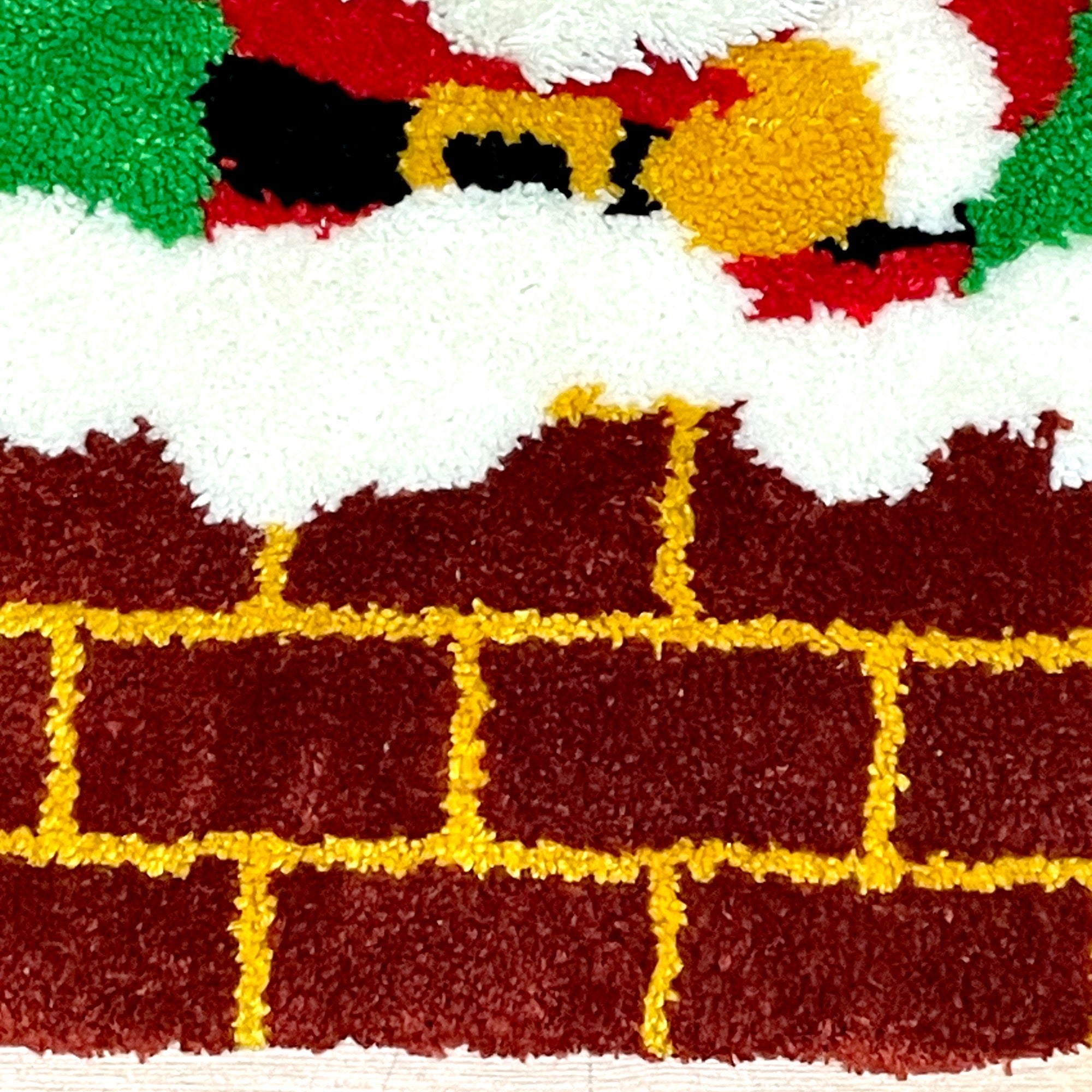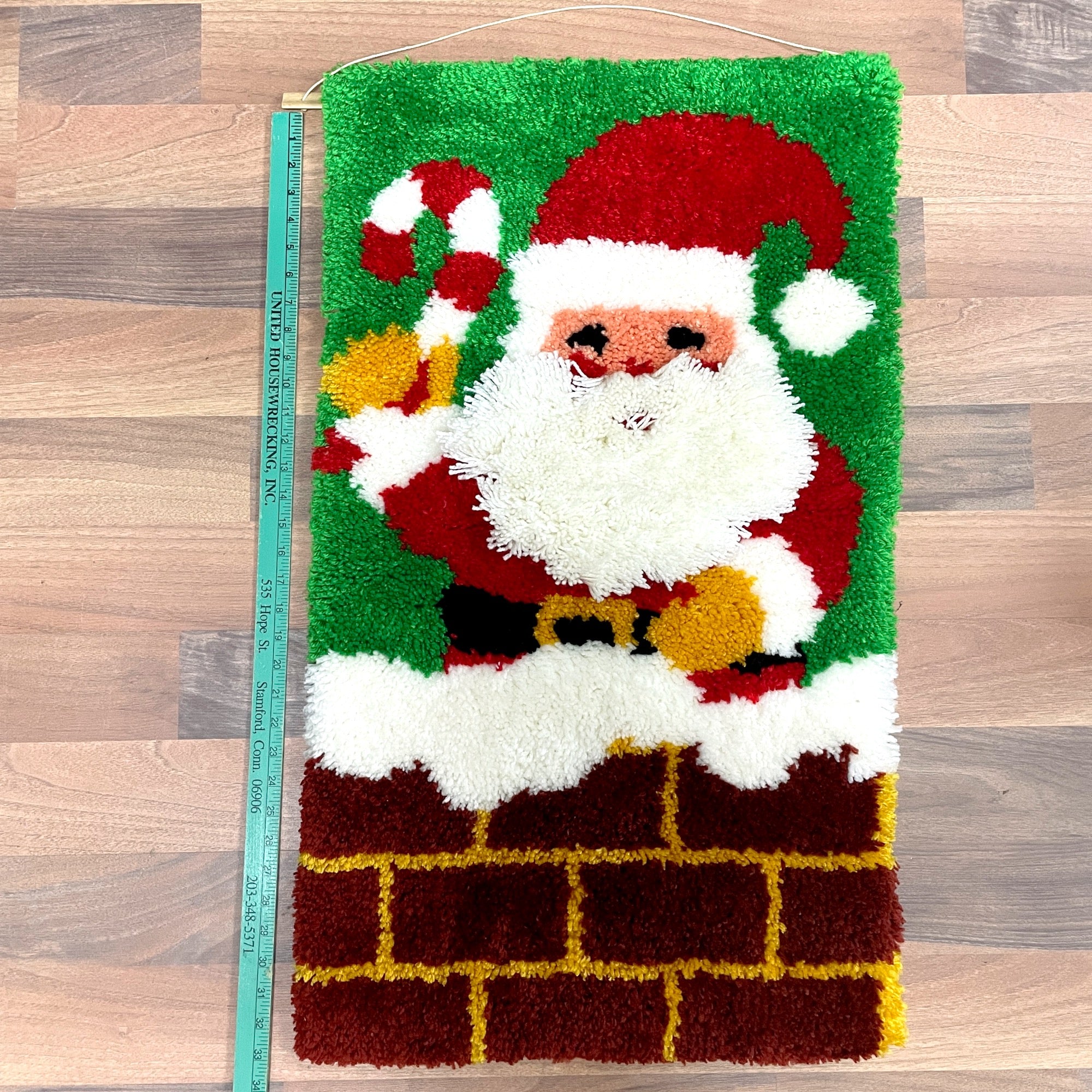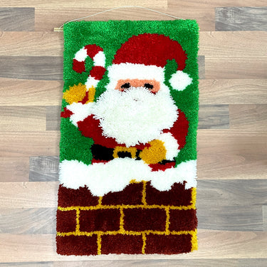 Vintage 1980s latch hook wall hanging of Santa hopping into a chimney. Hang it on a door, hang it on a wall, hang it anywhere you want to add some vintage Christmas vibes. Handmade with finished edges.