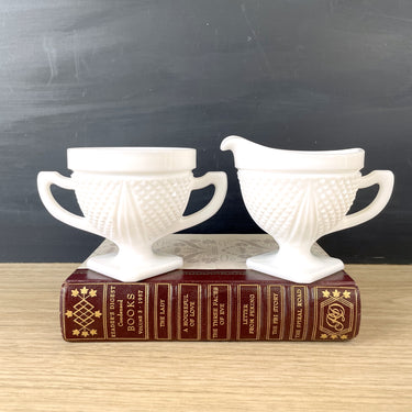 Vintage Westmoreland cream and sugar with a diamond cut and swag pattern on a square base. Add to your favorite mix and match milk glass dish set.