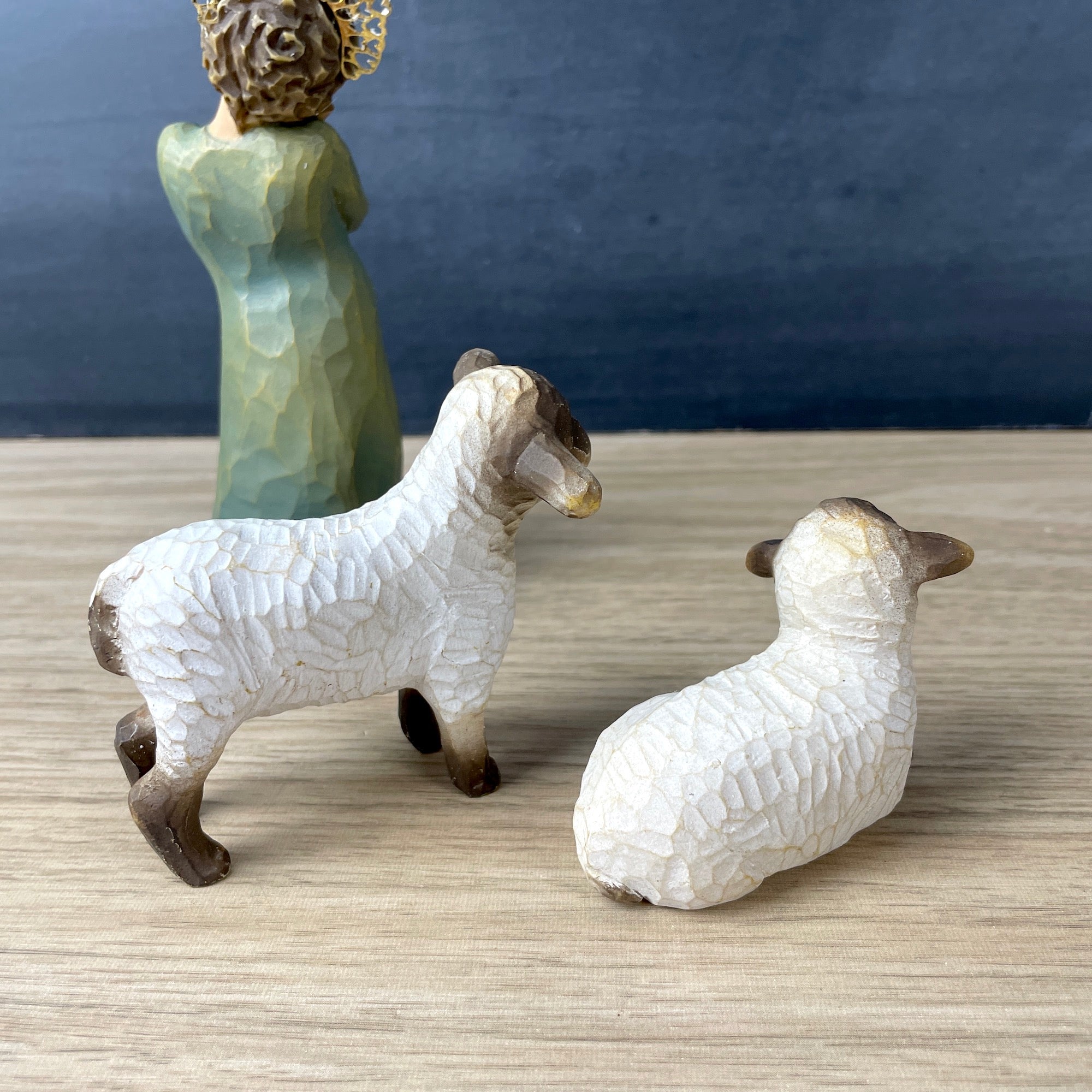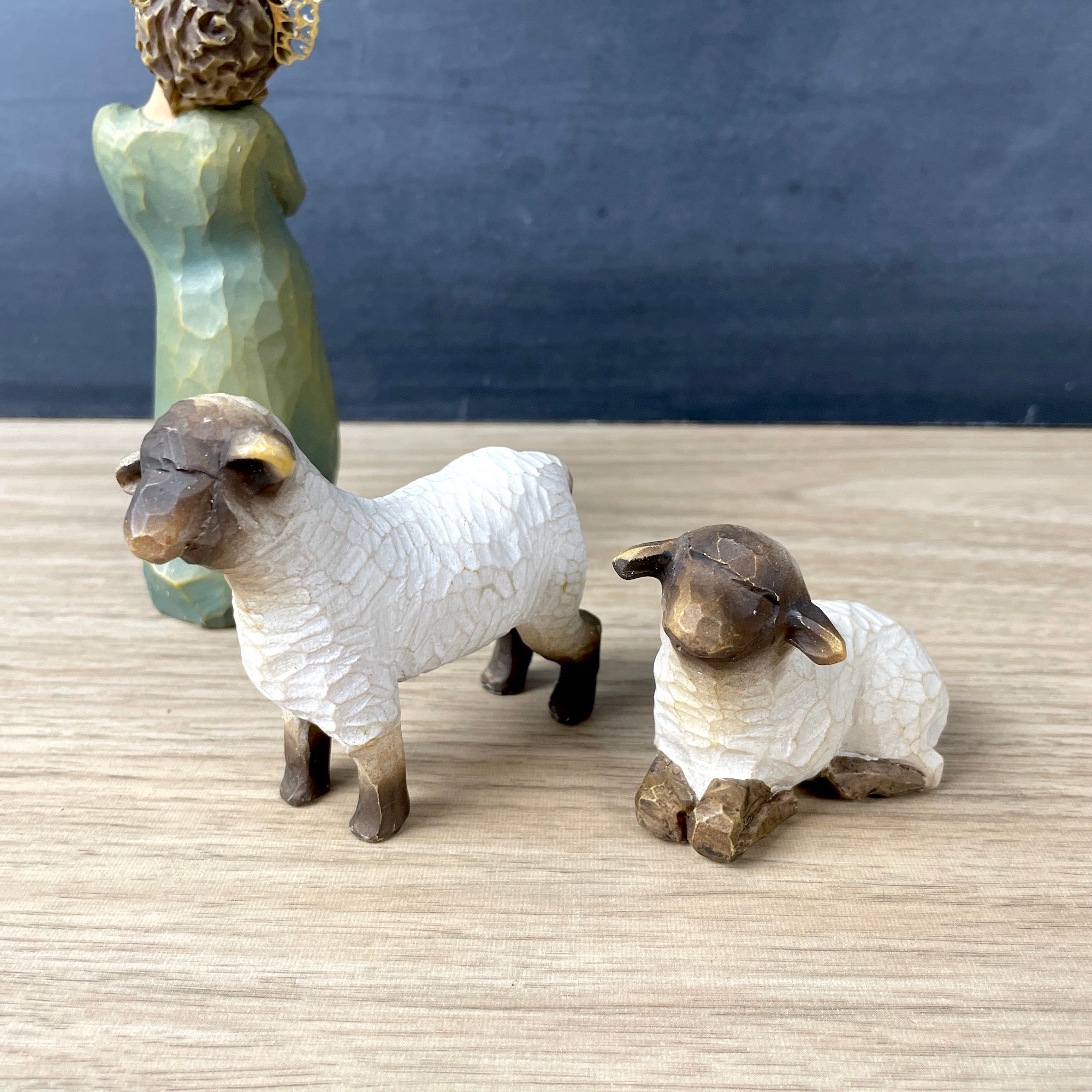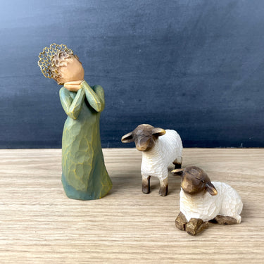 A vintage set of 3, titled Little Shepardess, by Susan Lordi for Willow Tree. Shepherdess figure with two lambs.