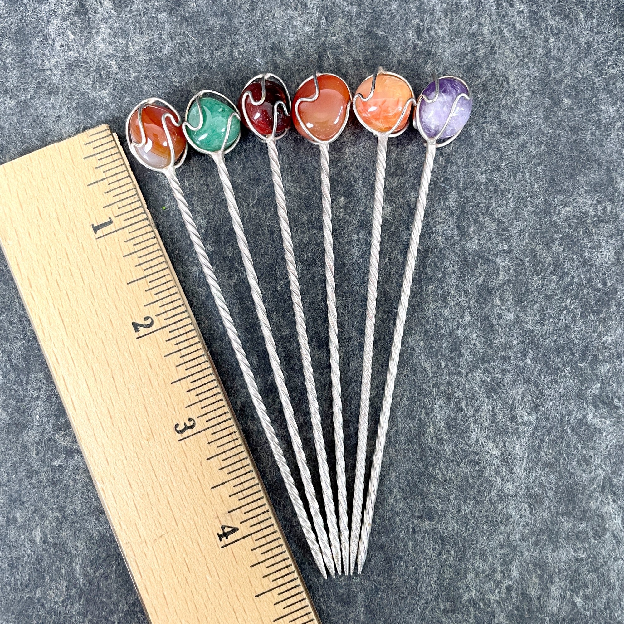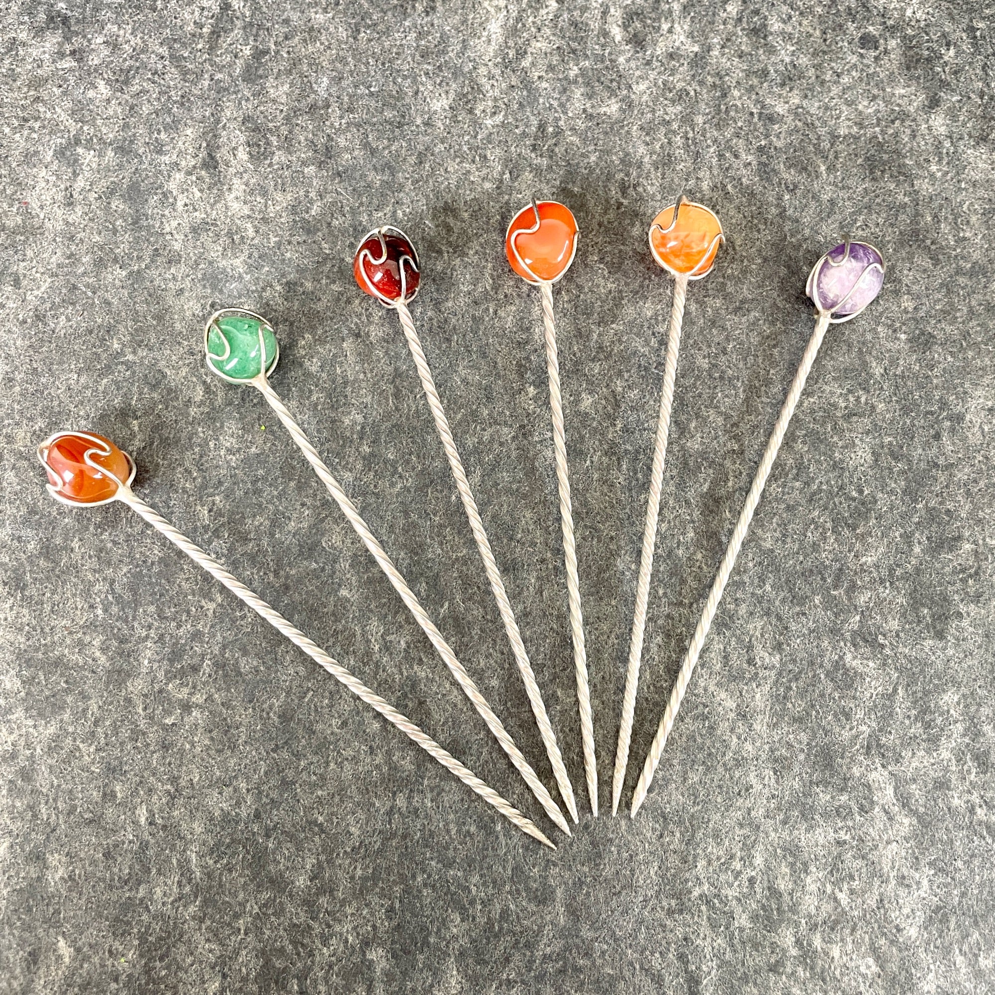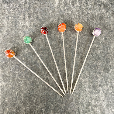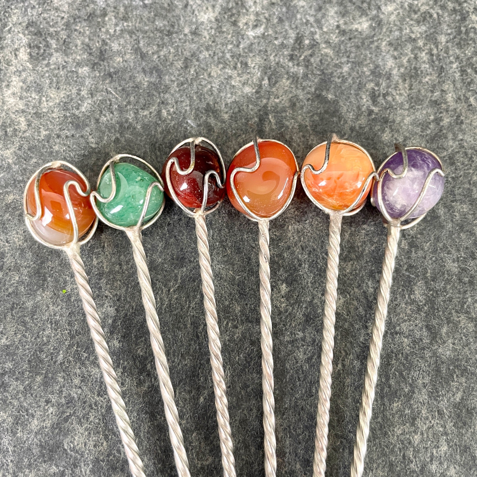 Set of 6 vintage twisted metal appetizer picks with wire wrapped stone handles in 6 different colors. May have come from different sets as the twists have different spacings.
