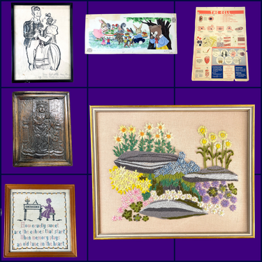 Paintings, drawings, etchings, prints and textile art in all styles. And some art books too.