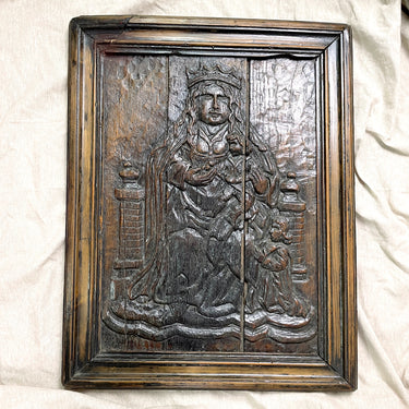 Carved seated madonna with child framed panel - antique of unknown age