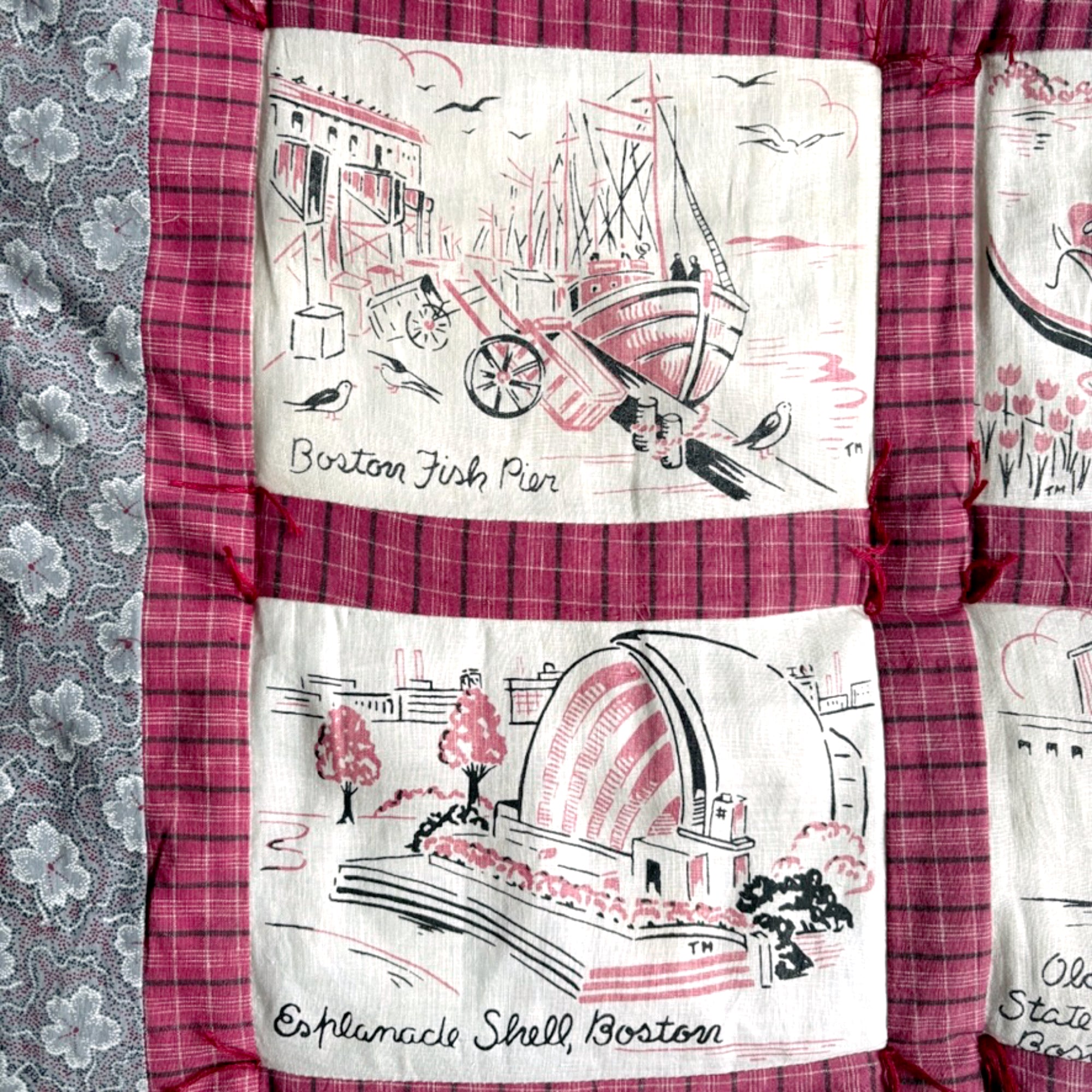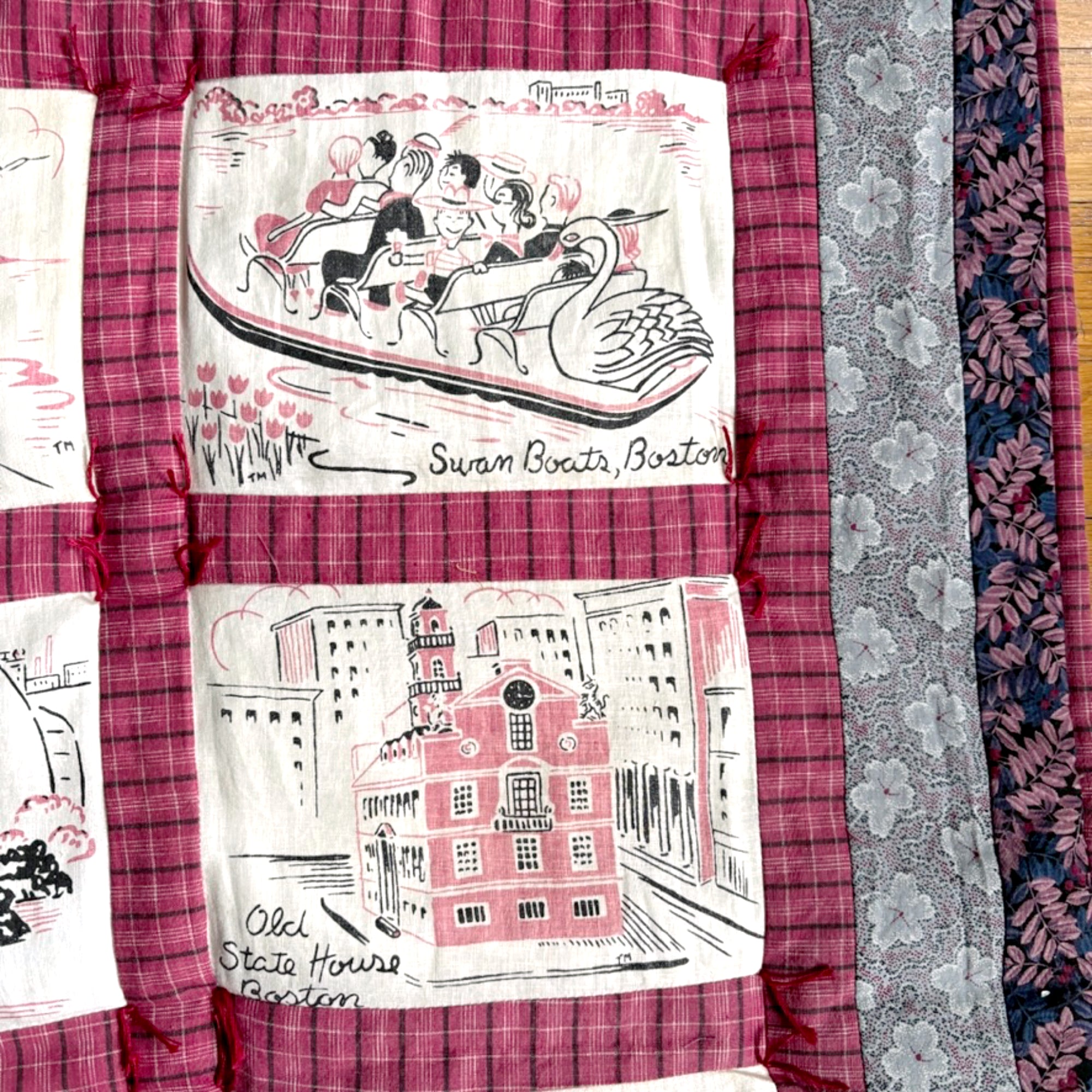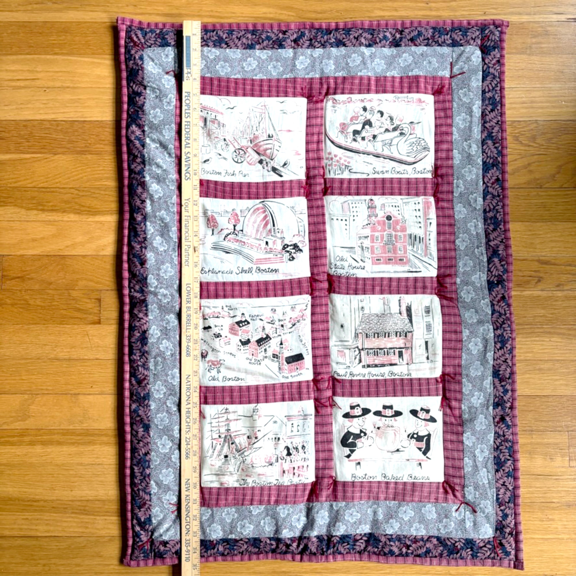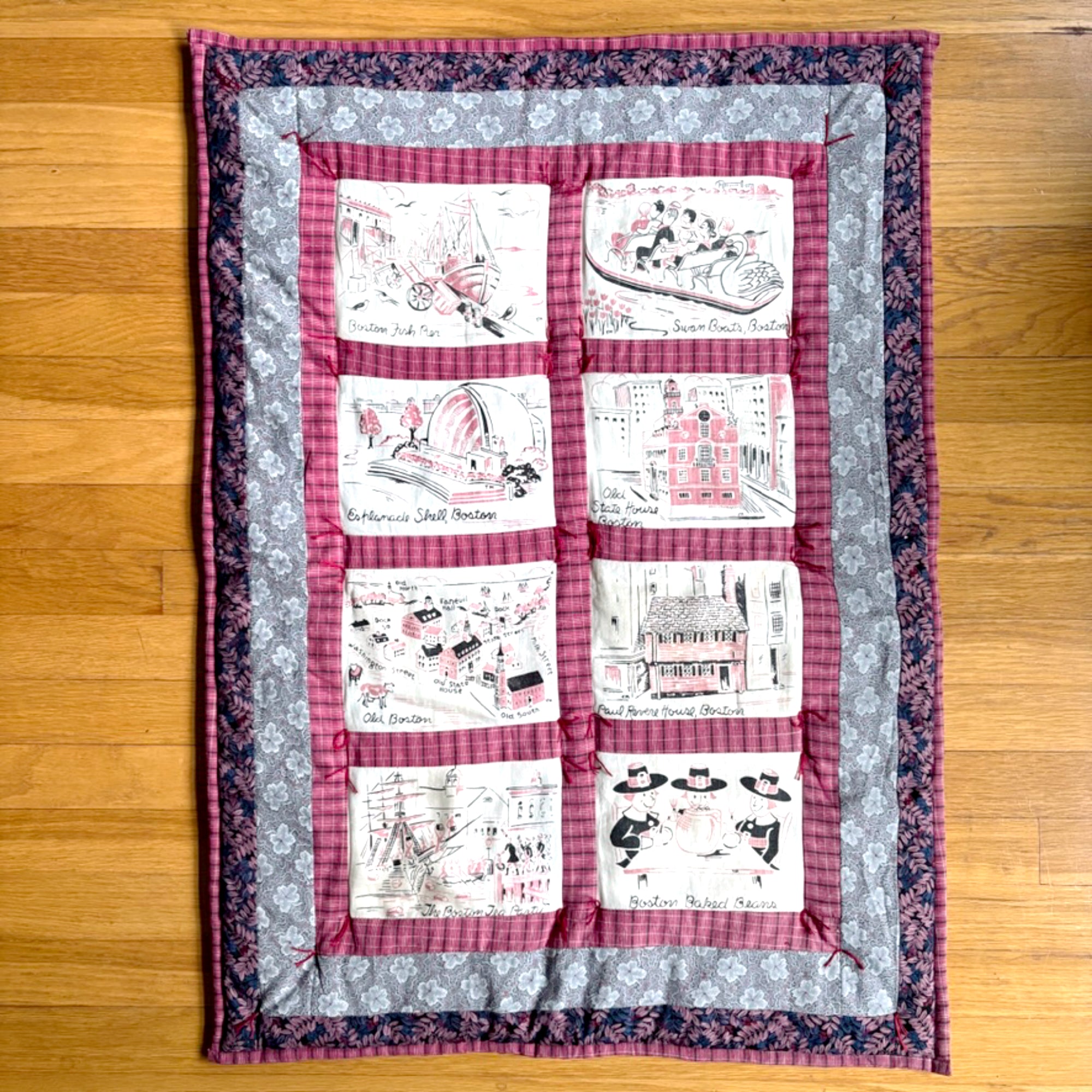 This quilted wall hanging was made using scenes from a vintage Boston tablecloth or fabric printed with pink and black scenes of our beloved Hub of the Universe. It was bordered and backed with coordinating fabrics, and finished with a few tufts of hand-quilting.