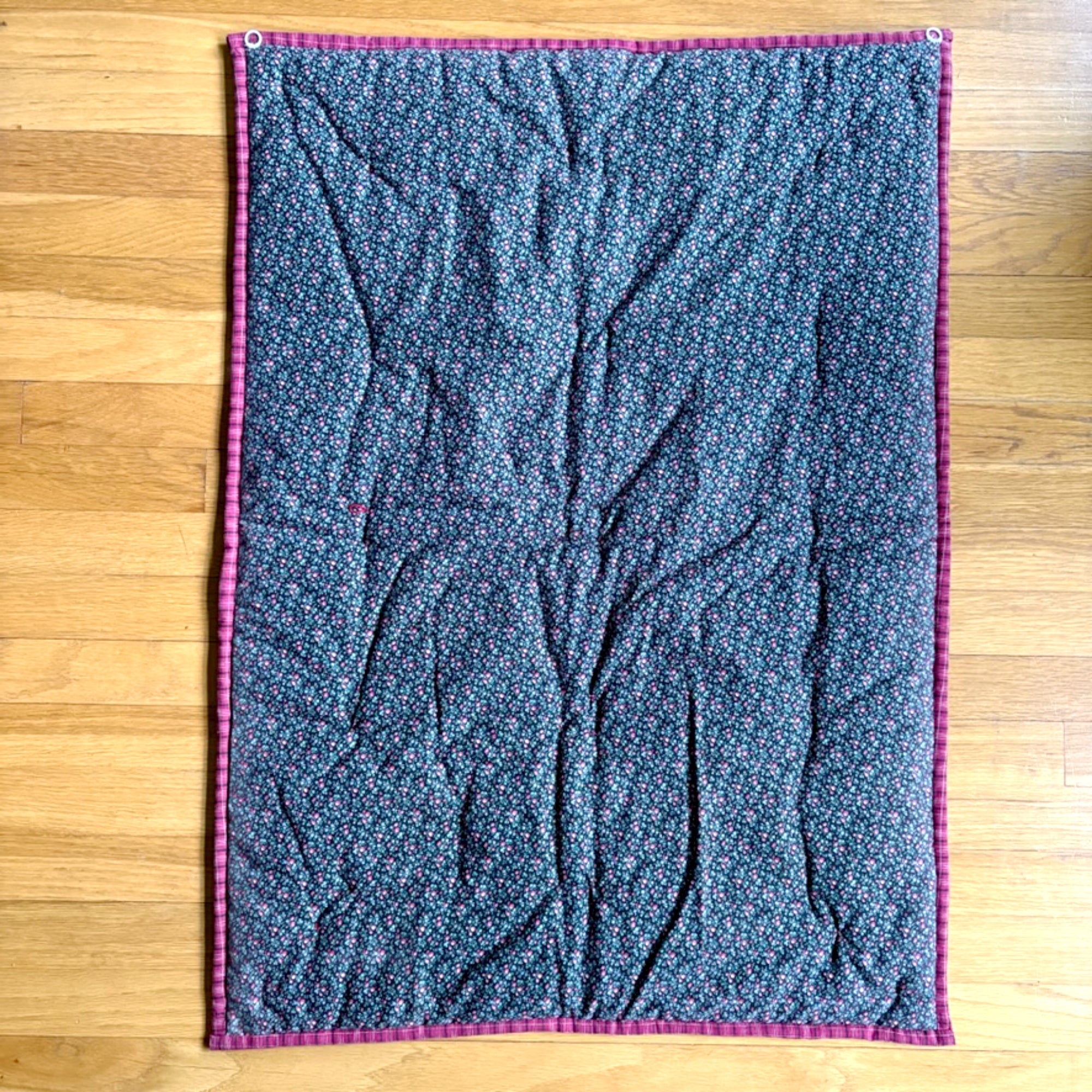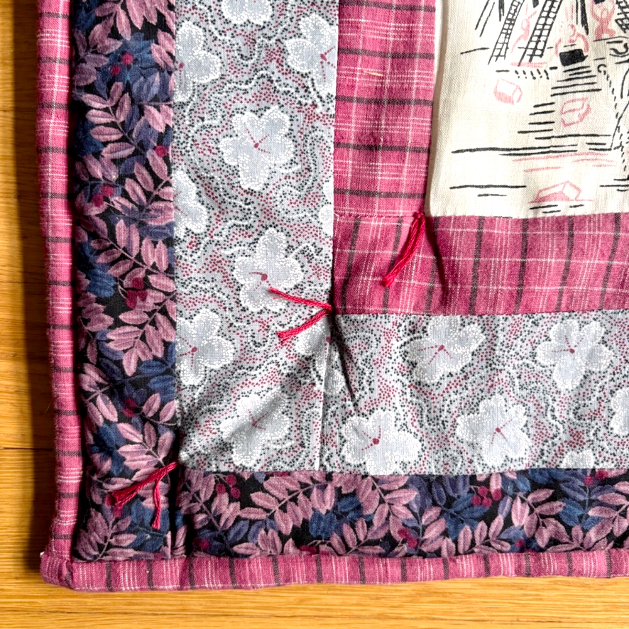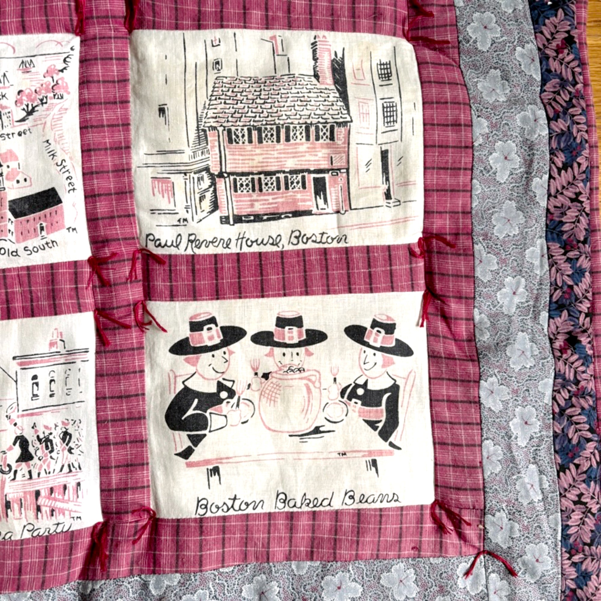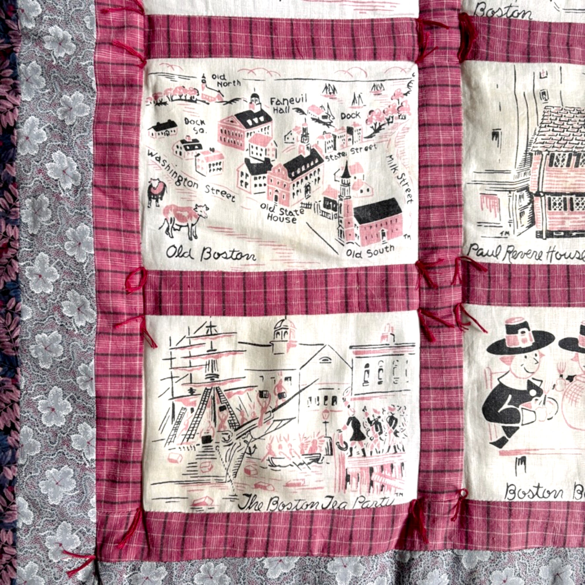 This quilted wall hanging was made using scenes from a vintage Boston tablecloth or fabric printed with pink and black scenes of our beloved Hub of the Universe. It was bordered and backed with coordinating fabrics, and finished with a few tufts of hand-quilting.