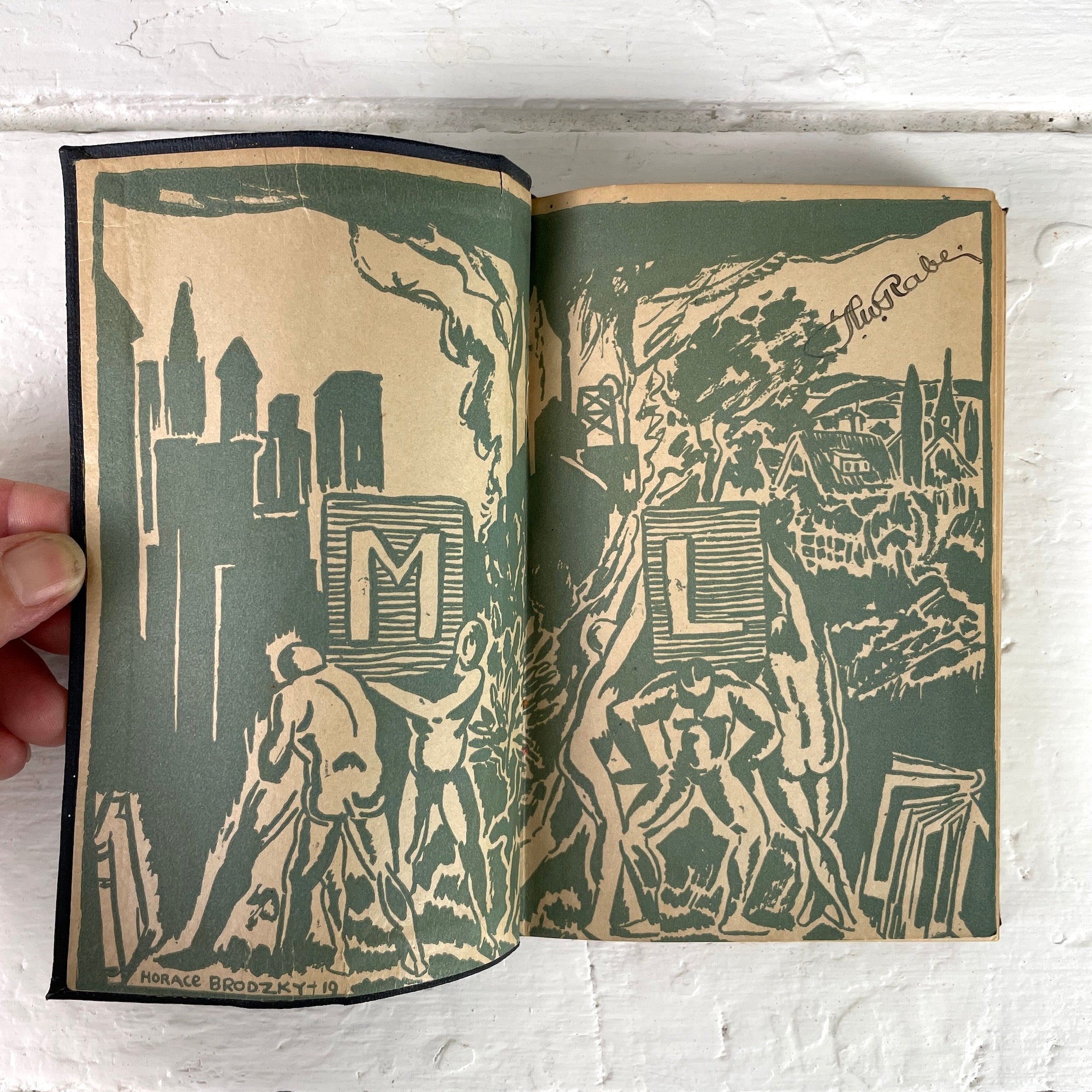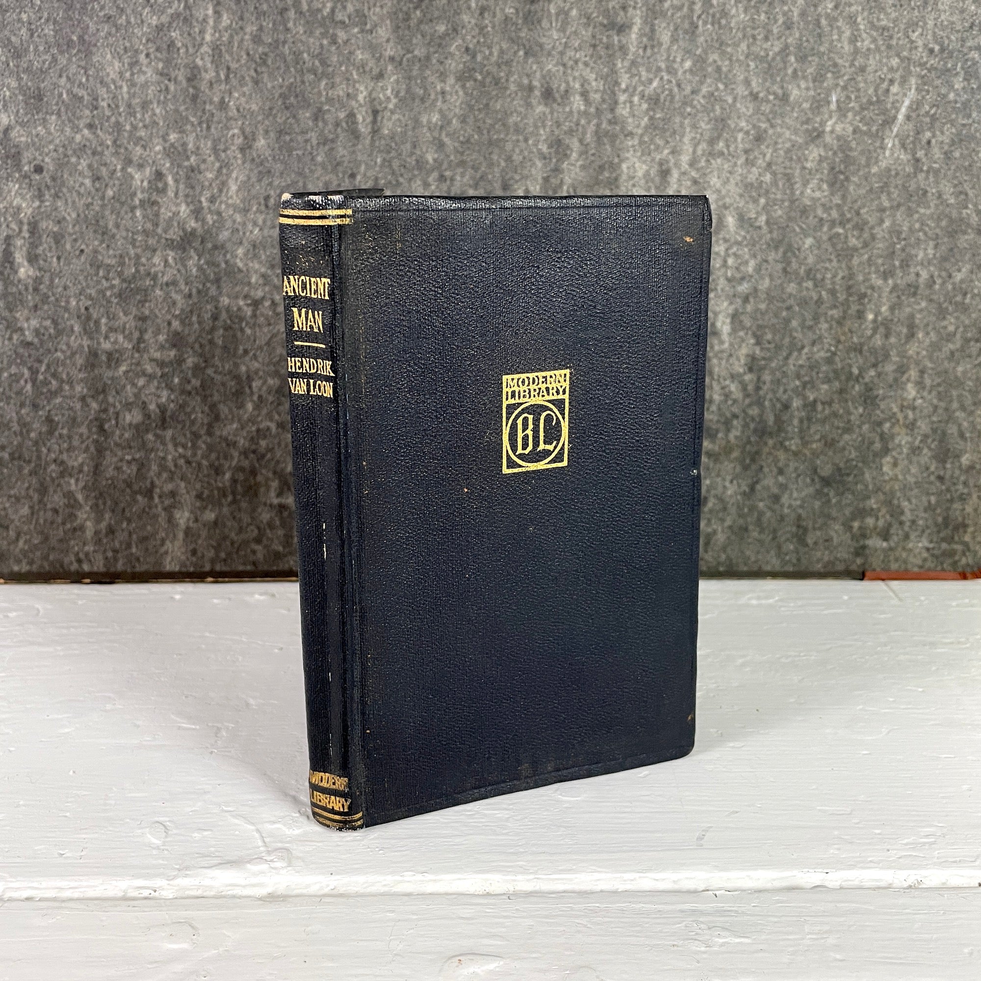 "Ancient Man: The Beginning of Civilization" by Hendrick Willem Van Loon. 1922 first impression. Modern Library edition, Boni and Liveright. Black textured wrapped buckram cover. Gold embossing. Flyleaf and inside cover illustrations by Horace Brodzky. Black and white illustrations.