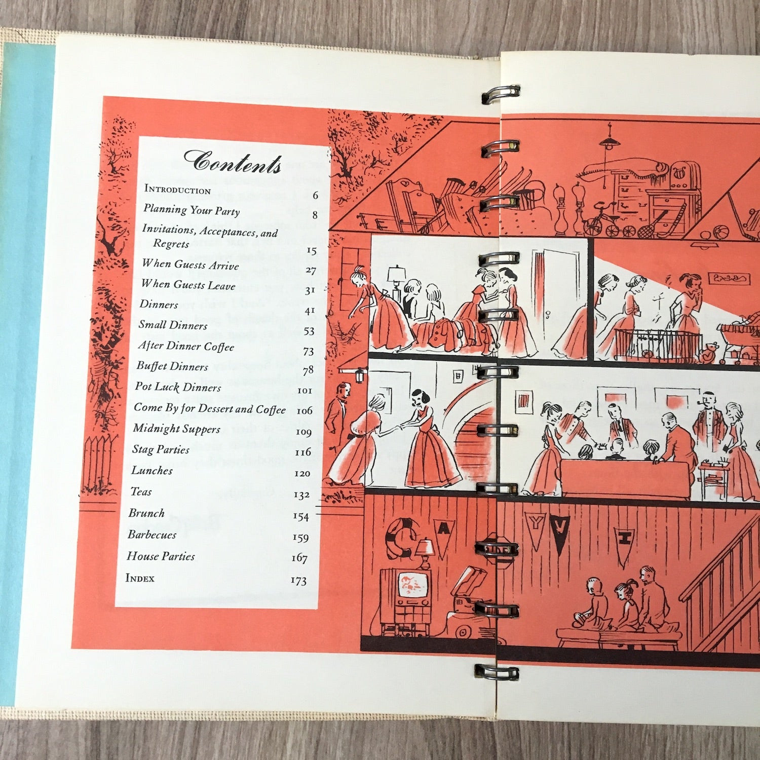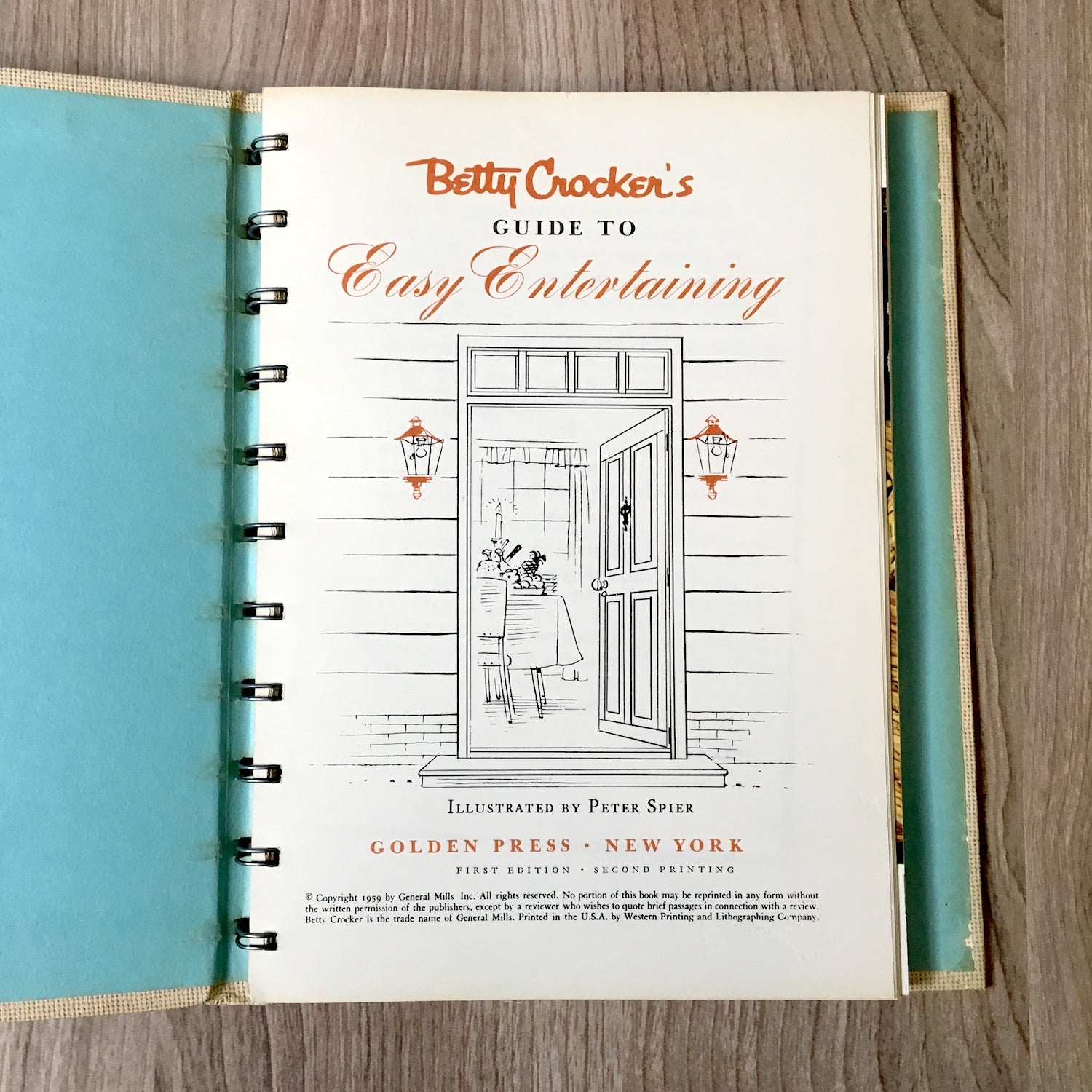 "Betty Crocker's Guide to Easy Entertaining," illustrated by Peter Spier*. Copyright 1959 General Mills; first edition, second printing. Hardcover with spiral binding inside. 176 pages.
