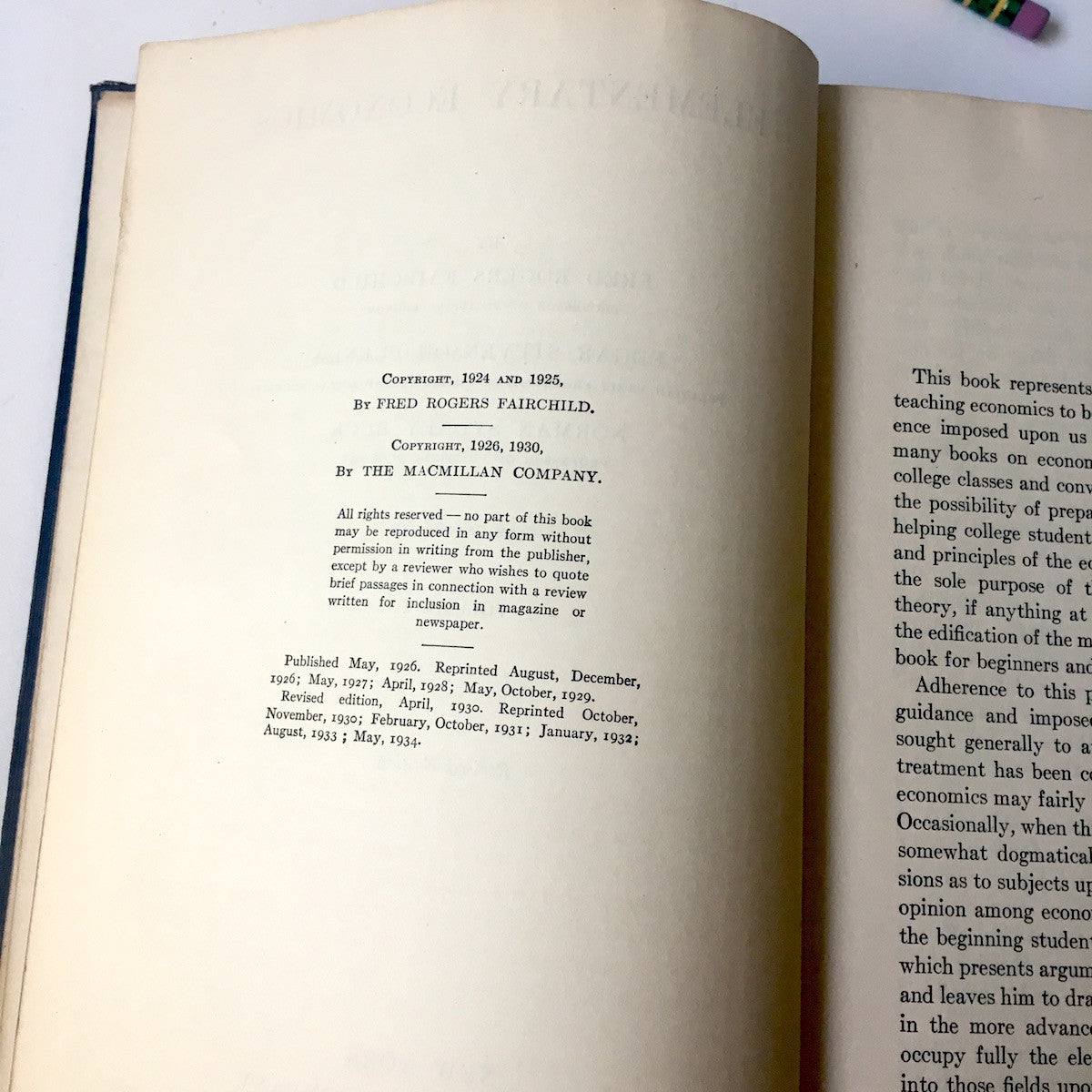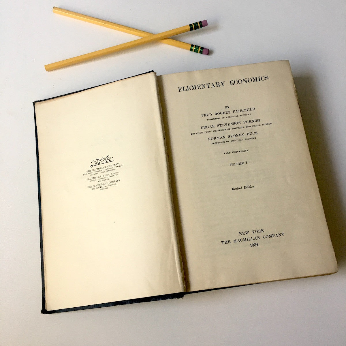 Elementary Economics, Volume 1, by Fred Rogers Fairchild, Edgar Stevenson Furniss, Norman Sydney Buck. Yale University. 1934 revised edition. The Macmillan Company. Hardcover.